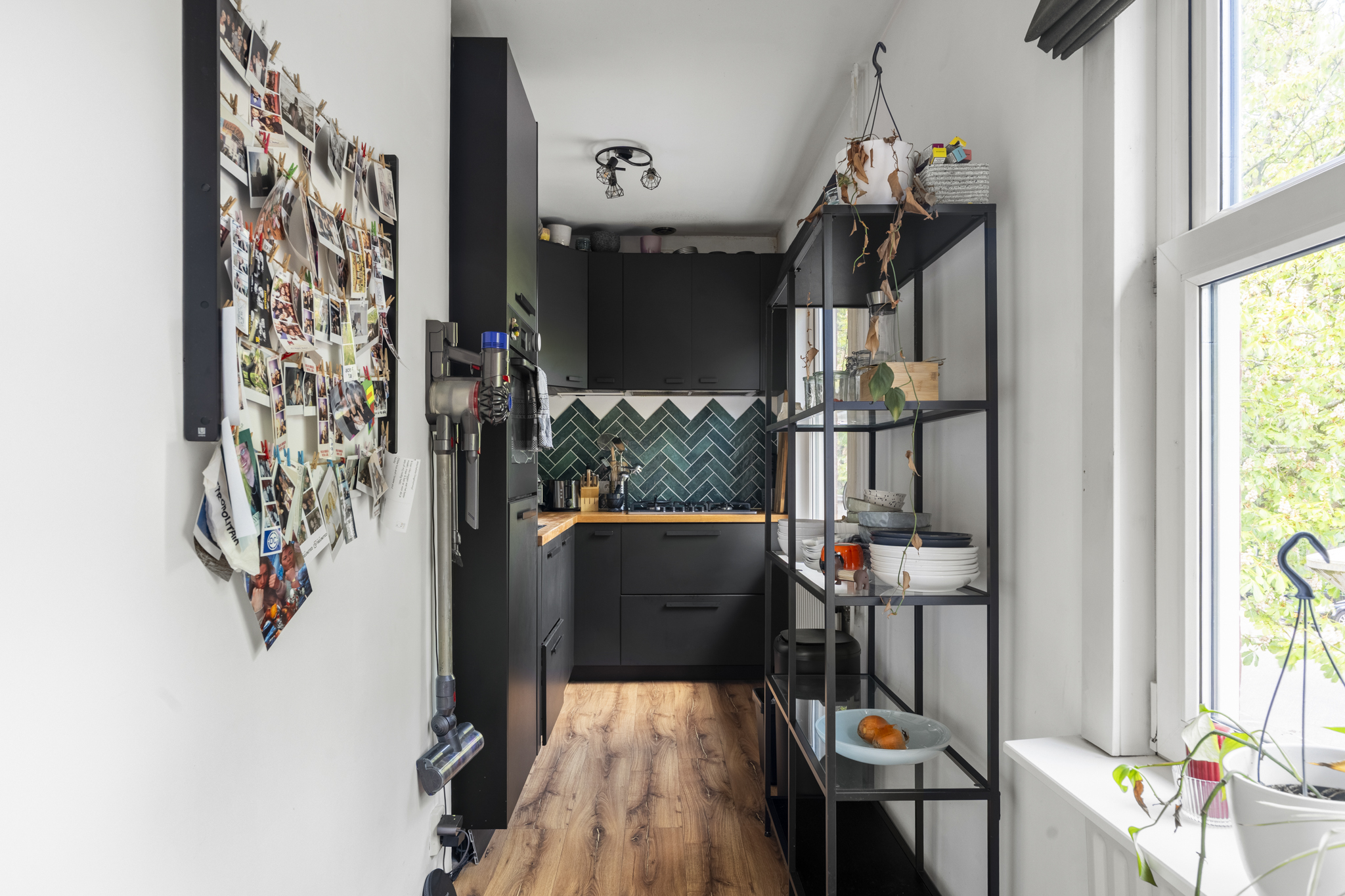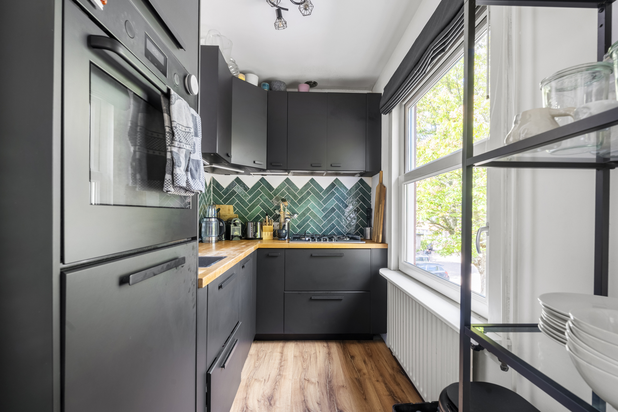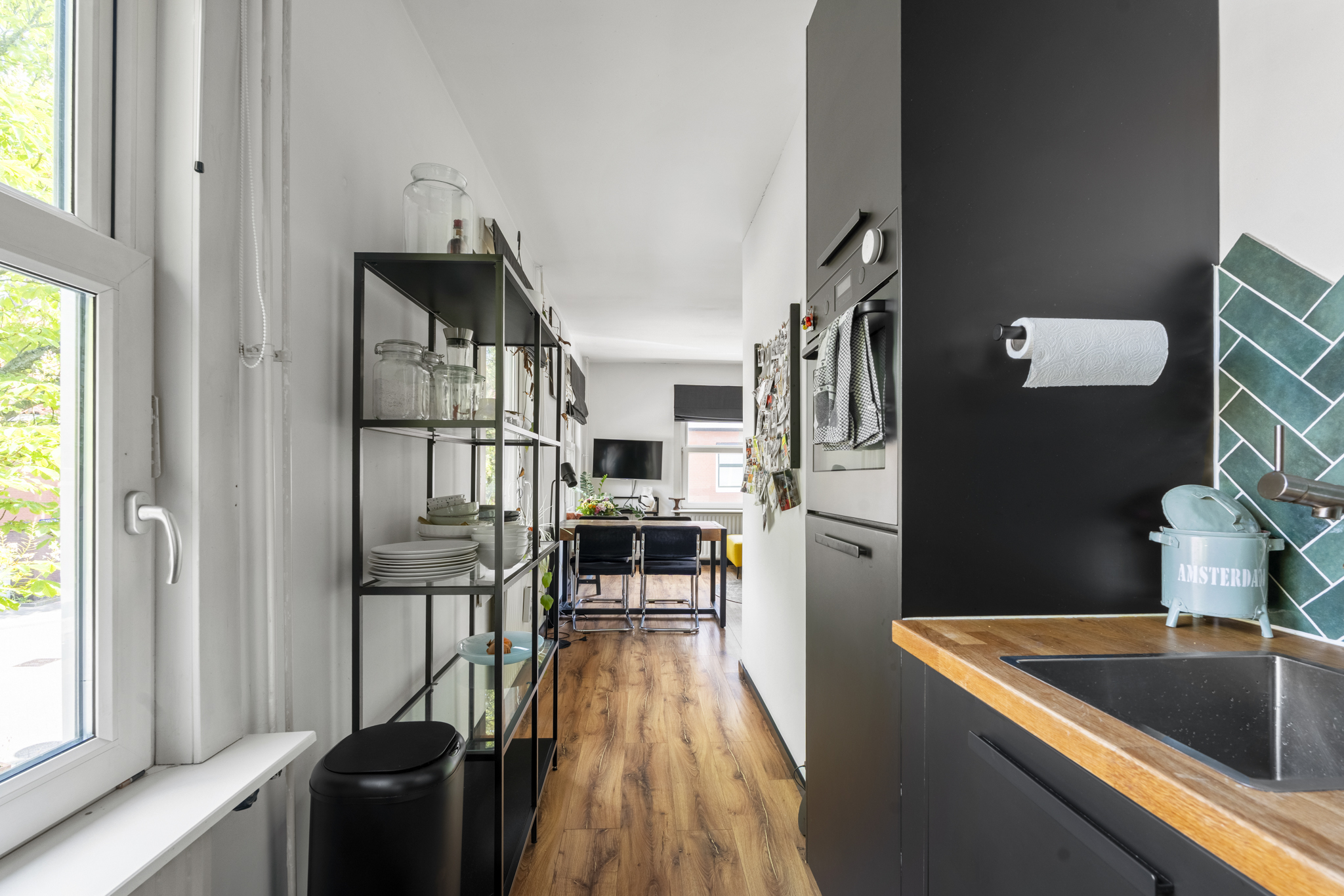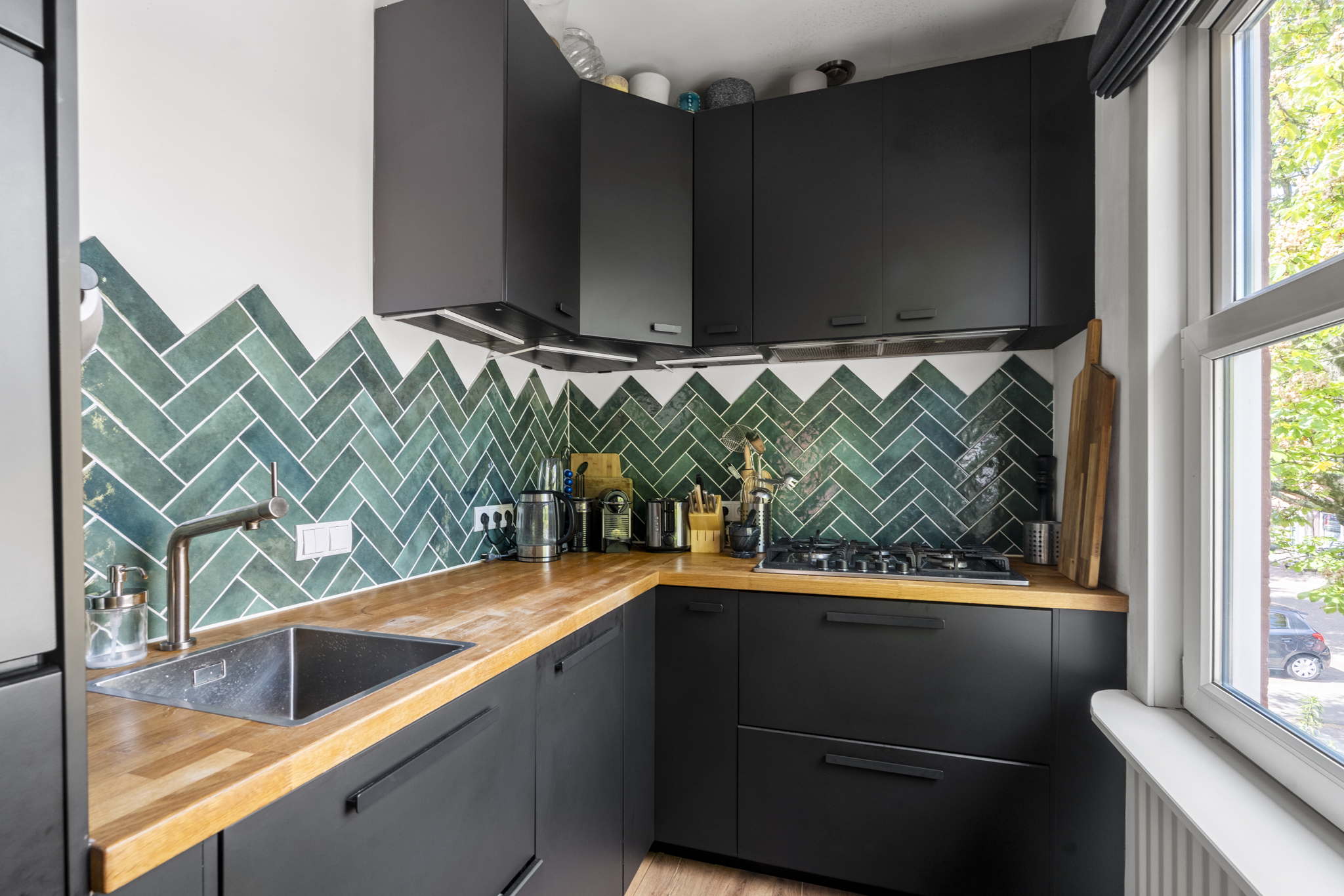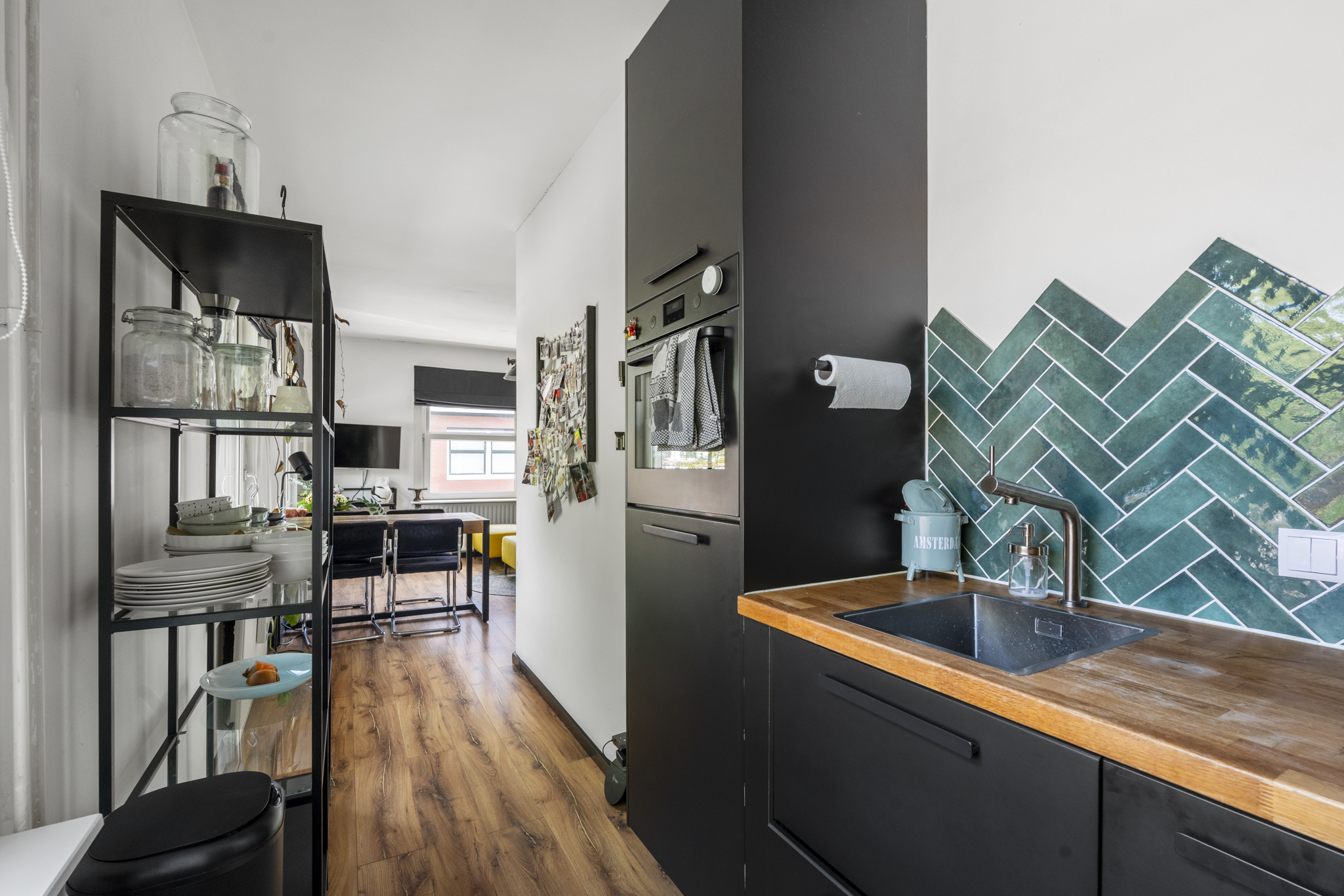 We gaan als eerste naar de woonkamer, met grote ramen aan twee zijden en uitzicht naar dit mooie stukje Amsterdam. Er is genoeg plek voor een hoekbank, eettafel en je favoriete woonaccessoires. In de open keuken staat een matzwarte hoekopstelling, met trendy groene tegels in visgraatmotief en een houten aanrechtblad. De 5-pits gaskookplaat, afzuigkap, combi-oven en koelkast met vriesvak zijn ingebouwd.