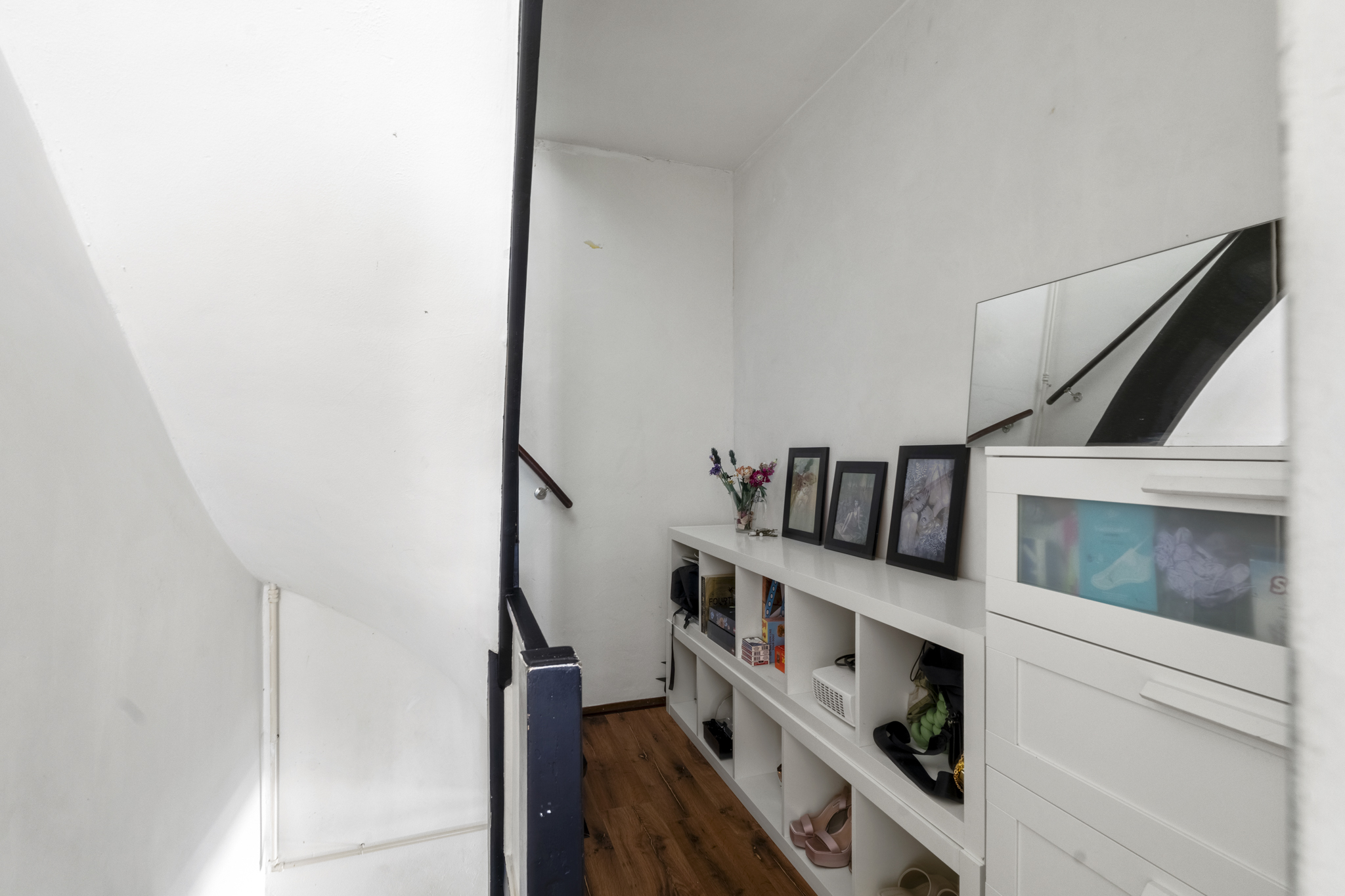 Eenmaal boven sta je op de ruime overloop, die toegang geeft tot de woonkamer en badkamer. De overloop is breed genoeg om kasten neer te zetten, waardoor je de ruimte optimaal kan benutten.