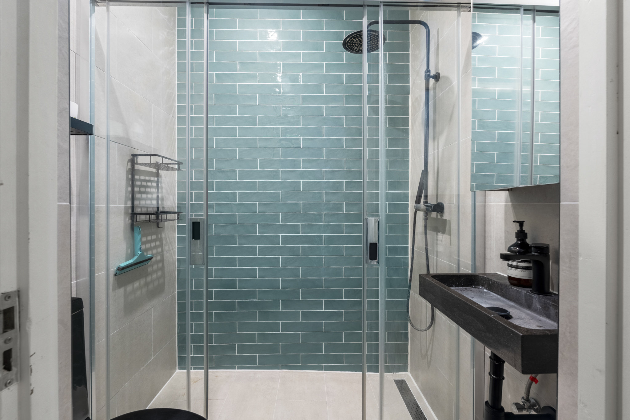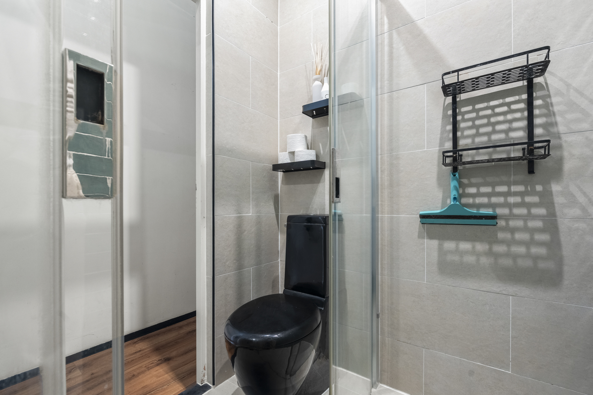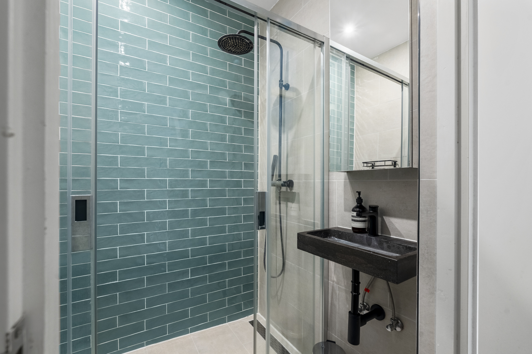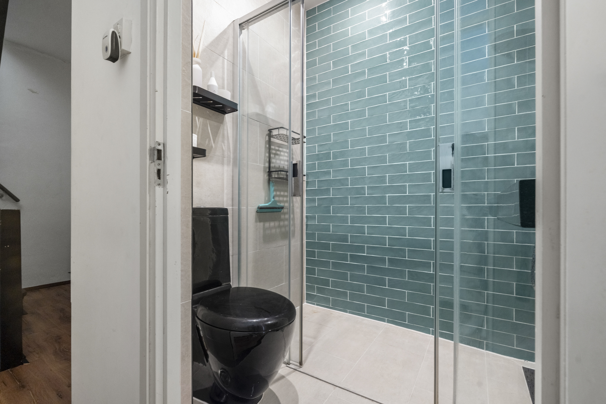 De badkamer is, net als de keuken, smaakvol verbouwd. Grote, lichte tegels zijn gecombineerd met groene wandtegels in de ruime douche. Boven de wastafel hangt een spiegelkast en het zwarte toilet past goed in het geheel.