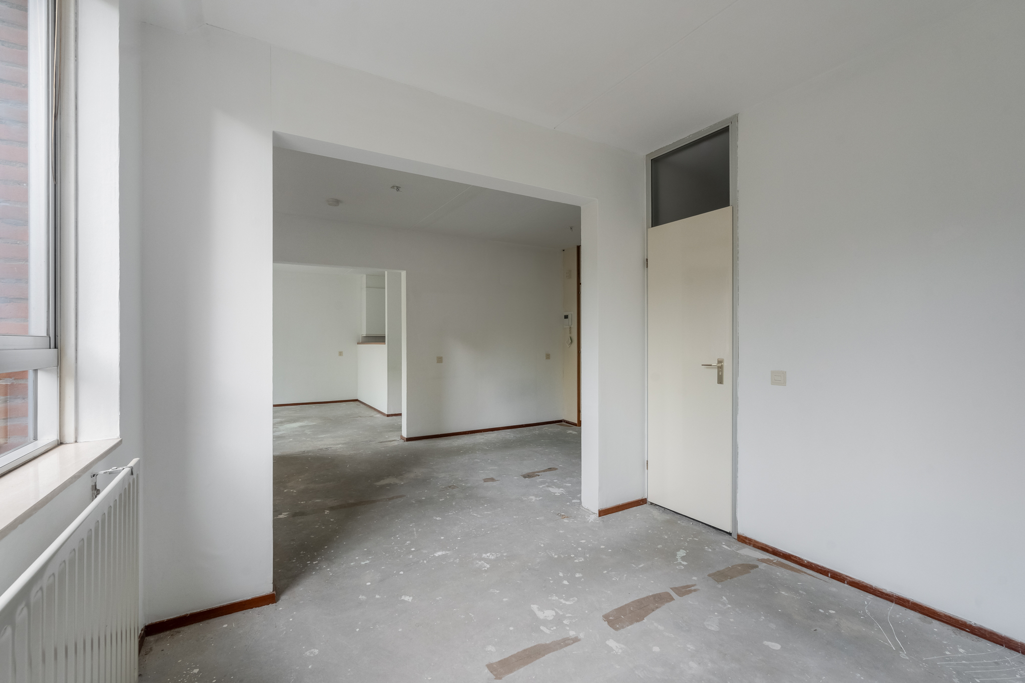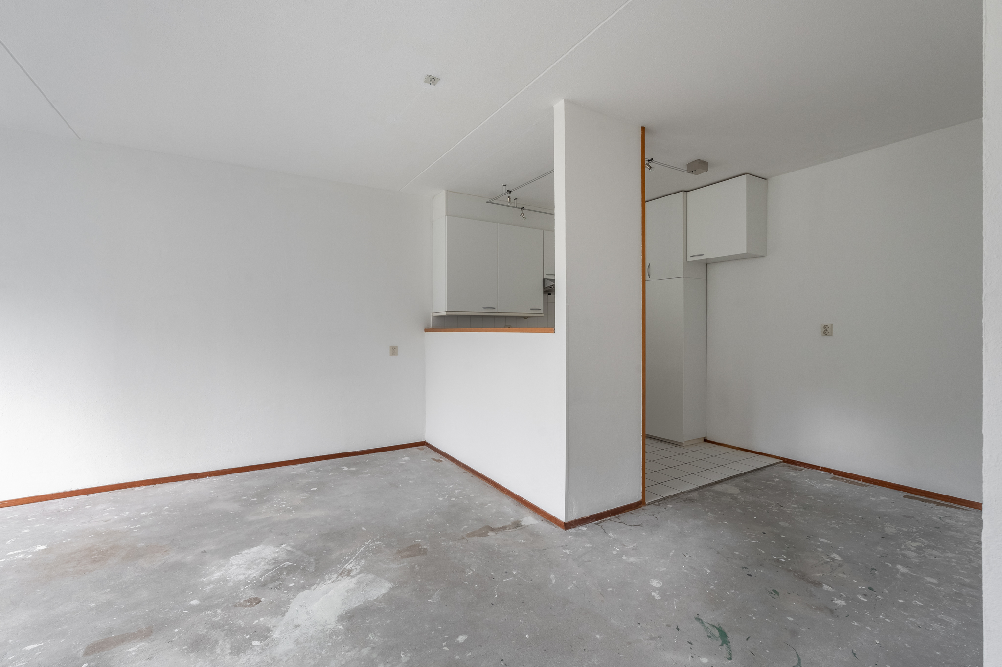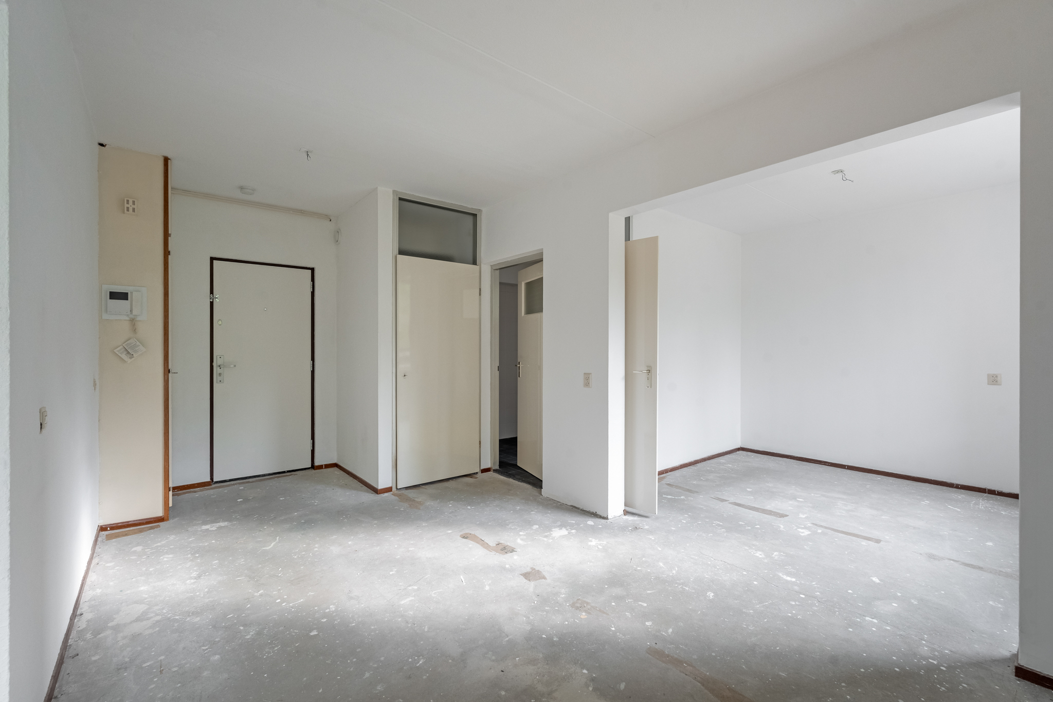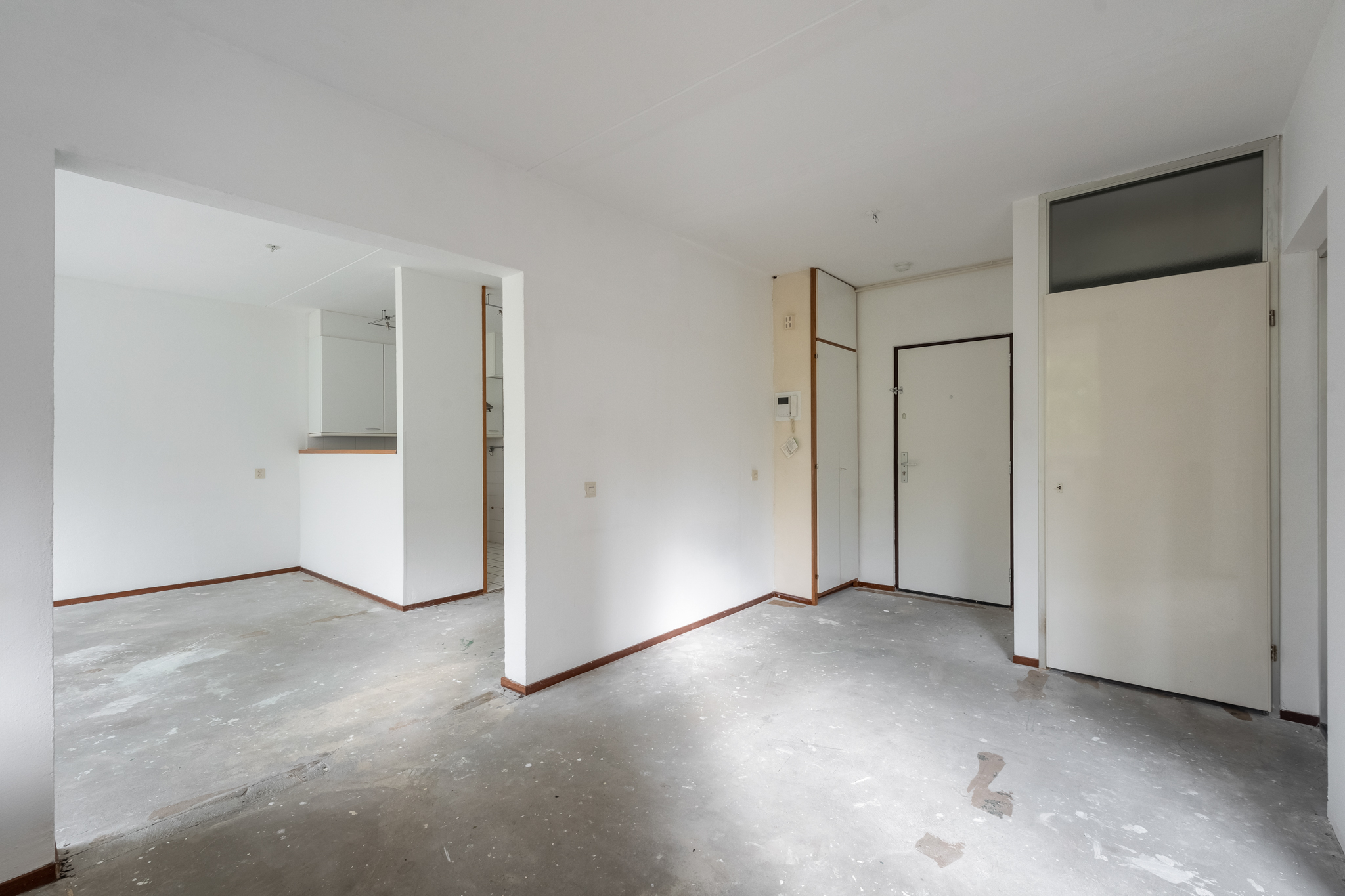 Entree hal met aan de linkerkant de slaapkamer en de badkamer met toilet. Vanuit de badkamer heb je toegang naar de slaapkamer en vanuit de slaapkamer heb je toegang tot het ruime balkon welke is gelegen op het zuiden. De woonkamer is zeer royaal en er is veel lichtinval, aansluitend is daar de open keuken.