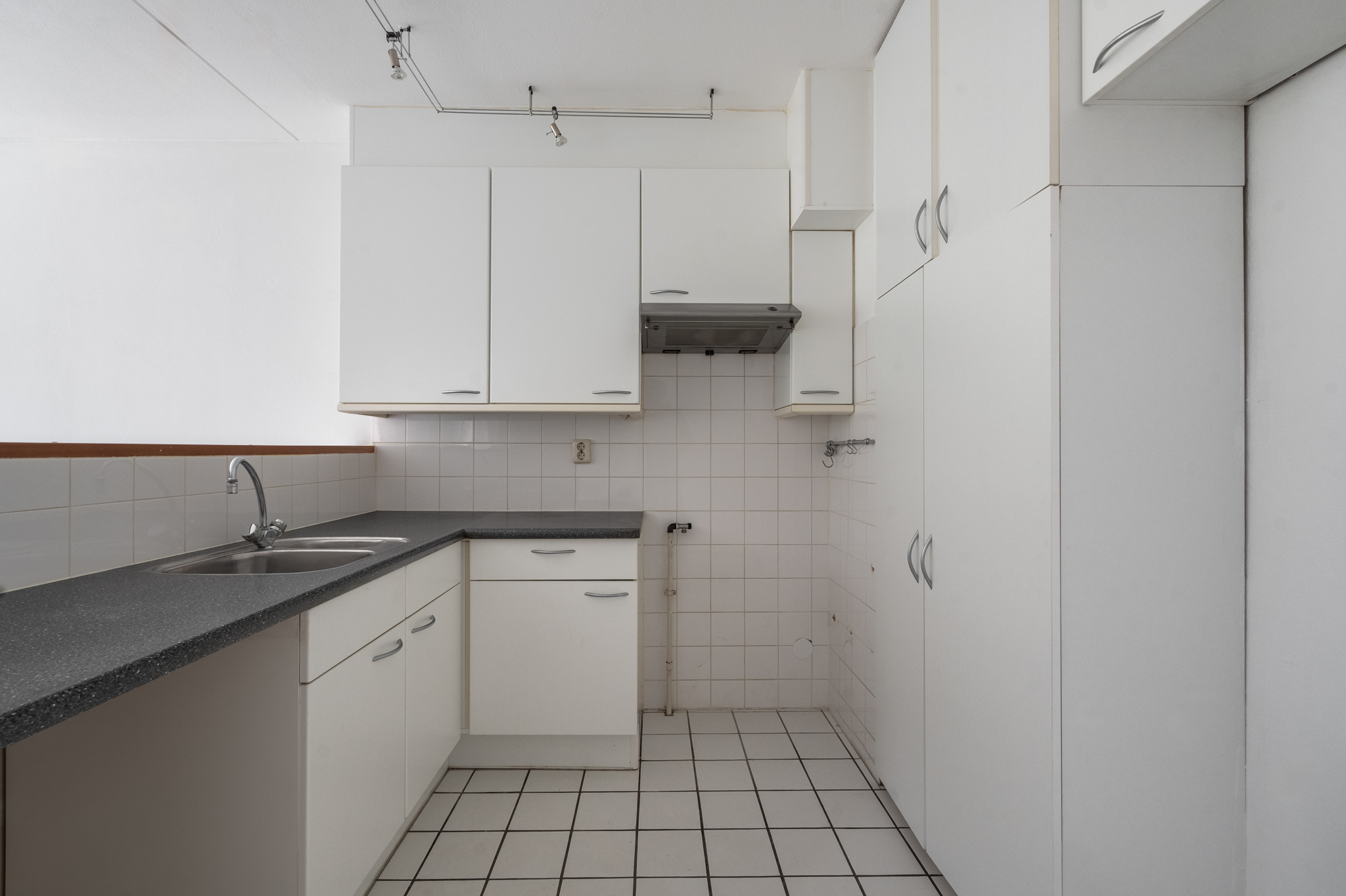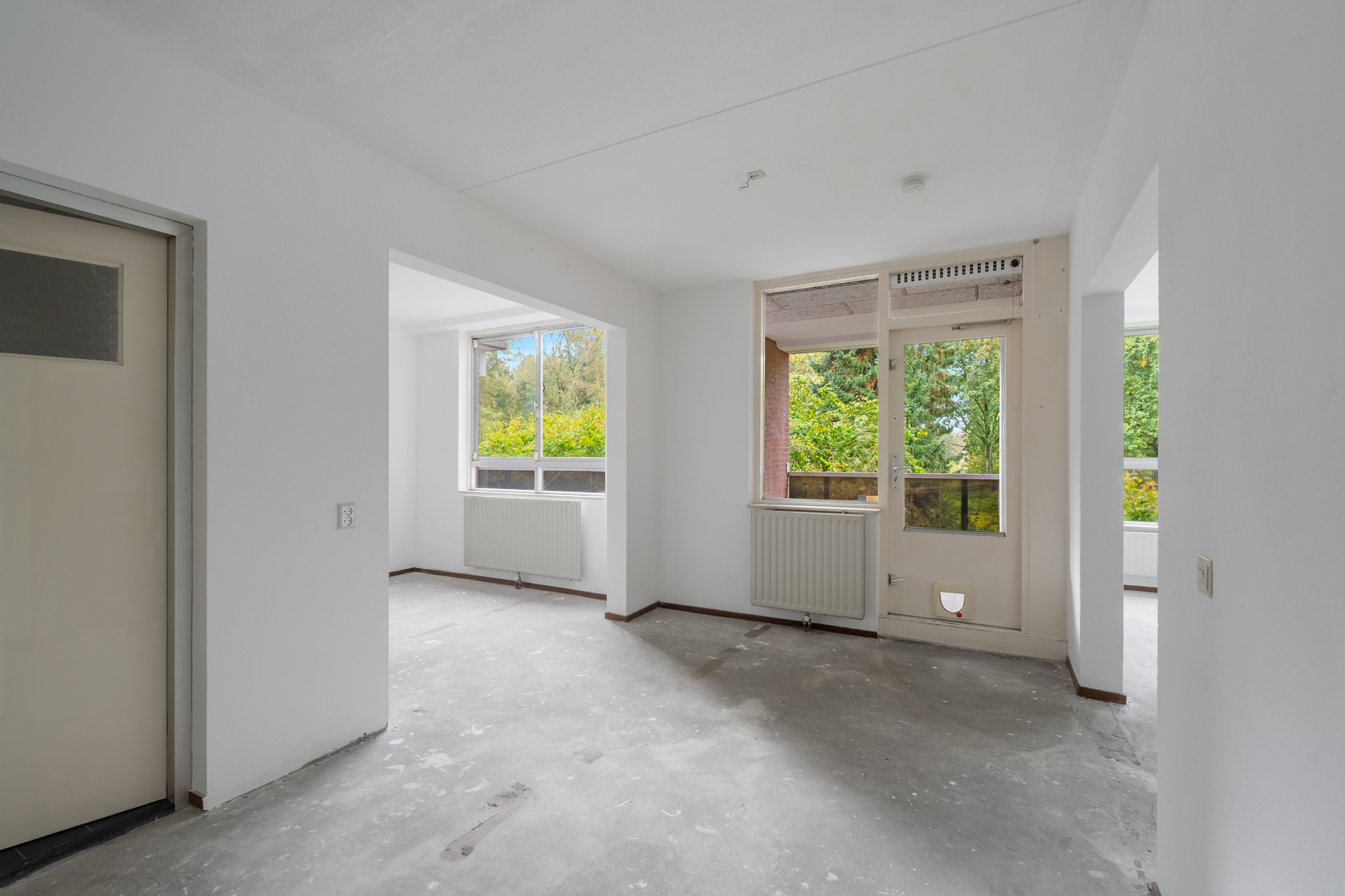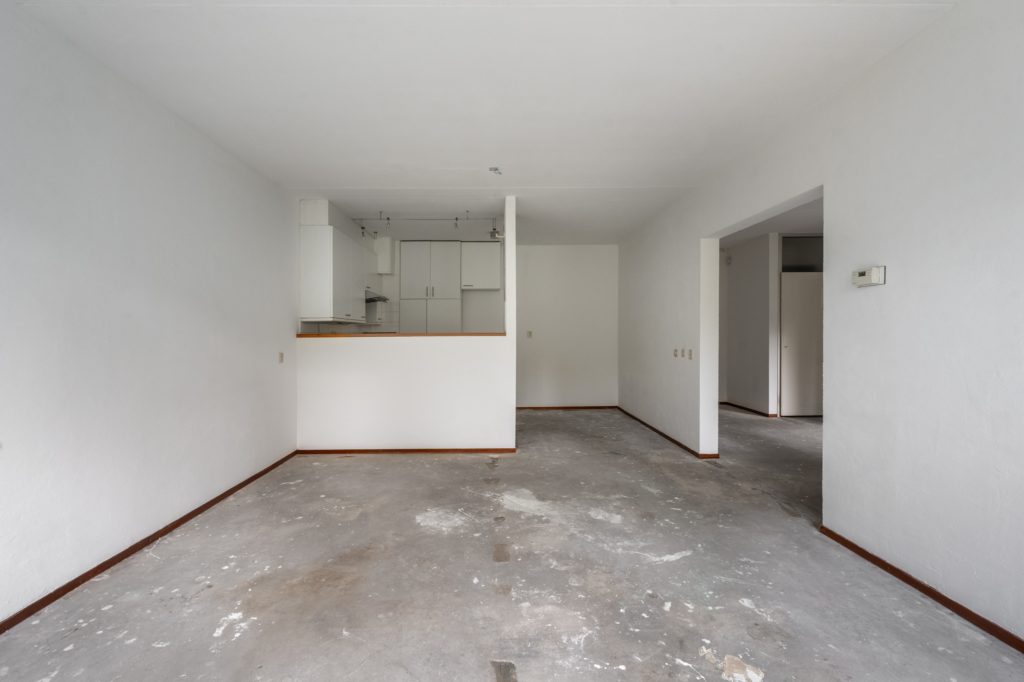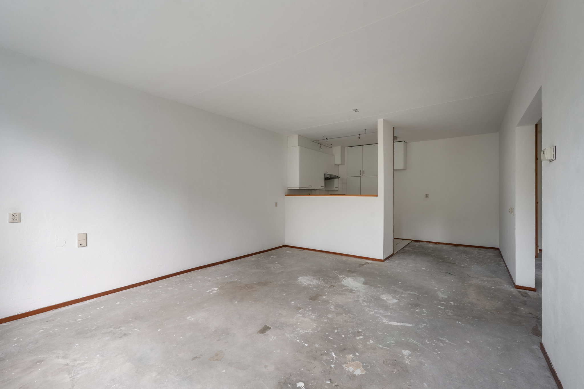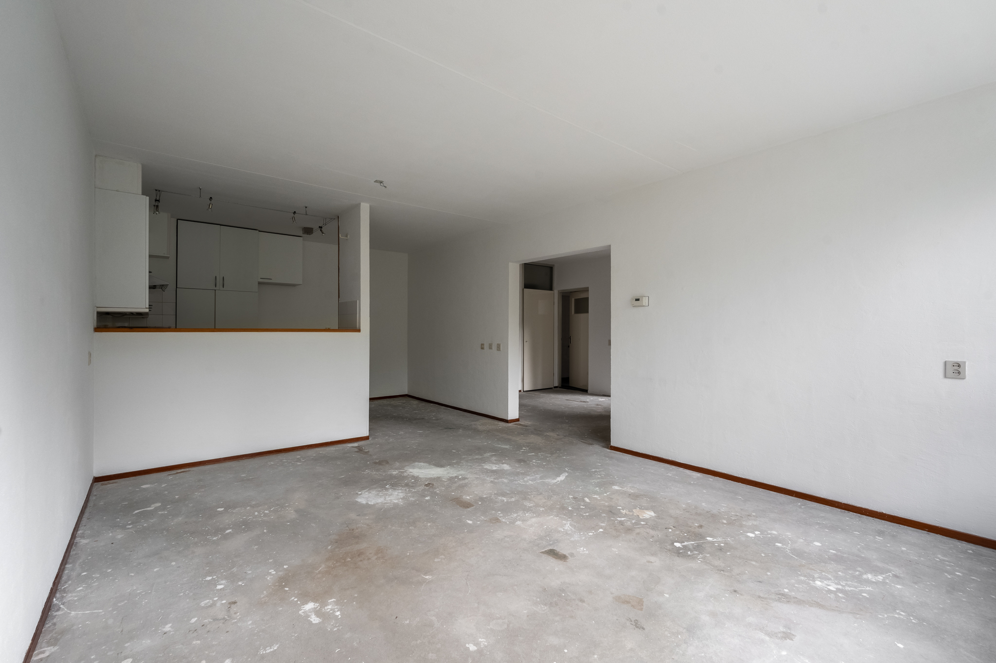 Entree hal met aan de linkerkant de slaapkamer en de badkamer met toilet. Vanuit de badkamer heb je toegang naar de slaapkamer en vanuit de slaapkamer heb je toegang tot het ruime balkon welke is gelegen op het zuiden. De woonkamer is zeer royaal en er is veel lichtinval, aansluitend is daar de open keuken.