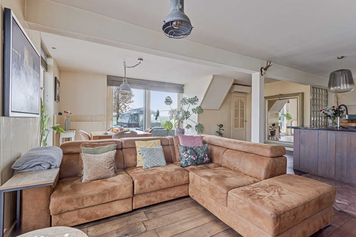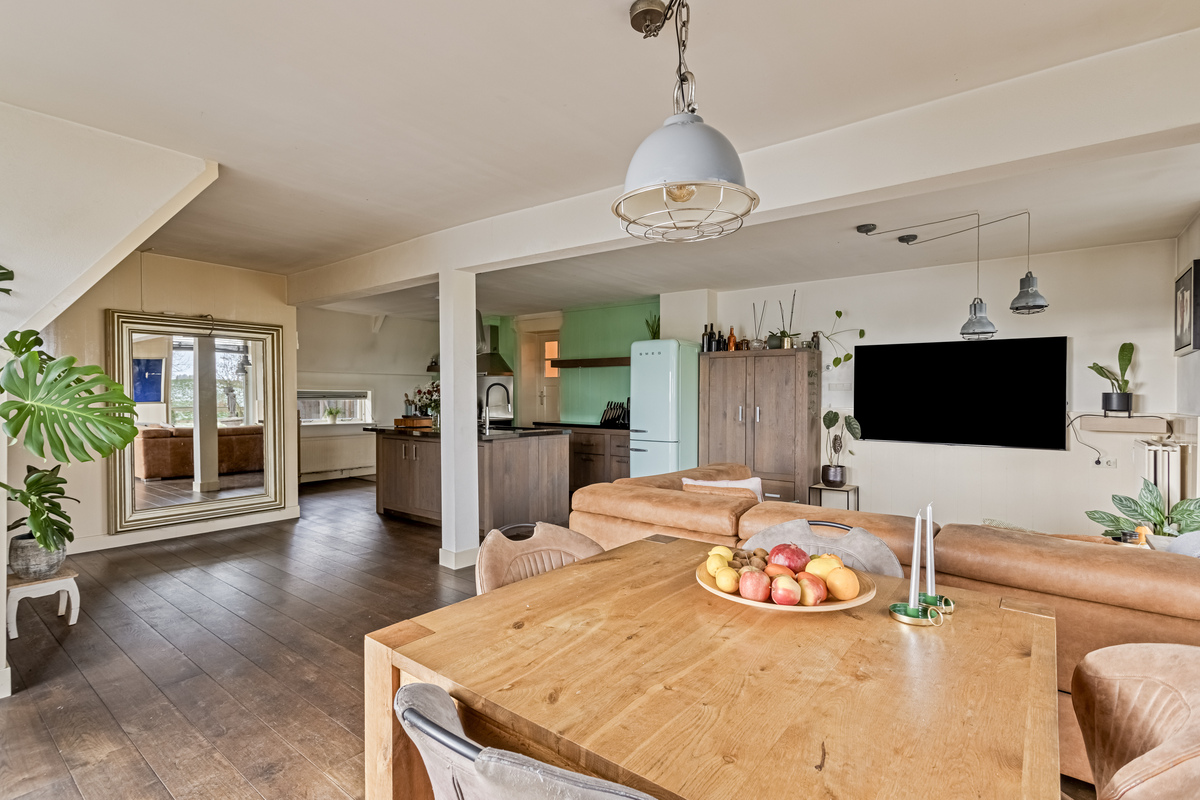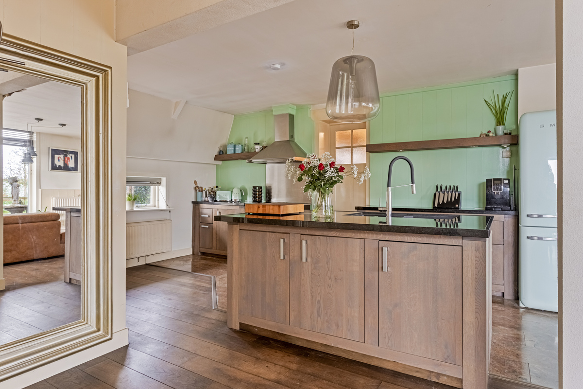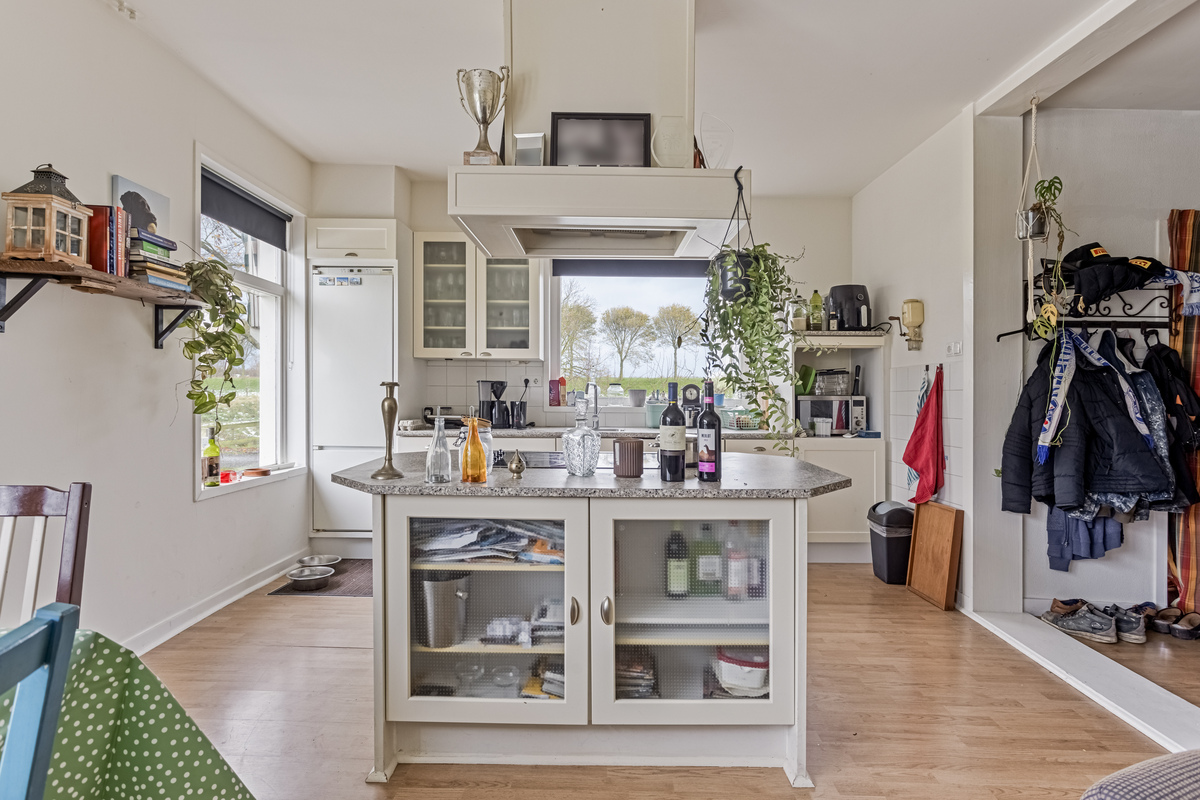 Aan de voorzijde is het eerste woongedeelte met een zithoek, eettafel en een ruime keukenopstelling met kookeiland. De keuken biedt, net als de woonkamer, mooi uitzicht naar de tuin. Alle benodigde apparatuur is aanwezig, inclusief een vaatwasser en een grote koel-/vriescombinatie.