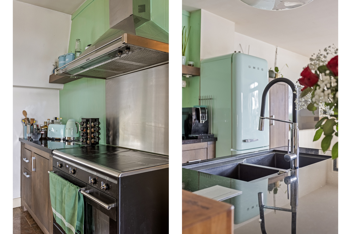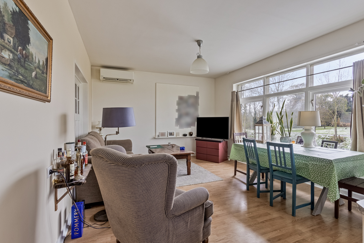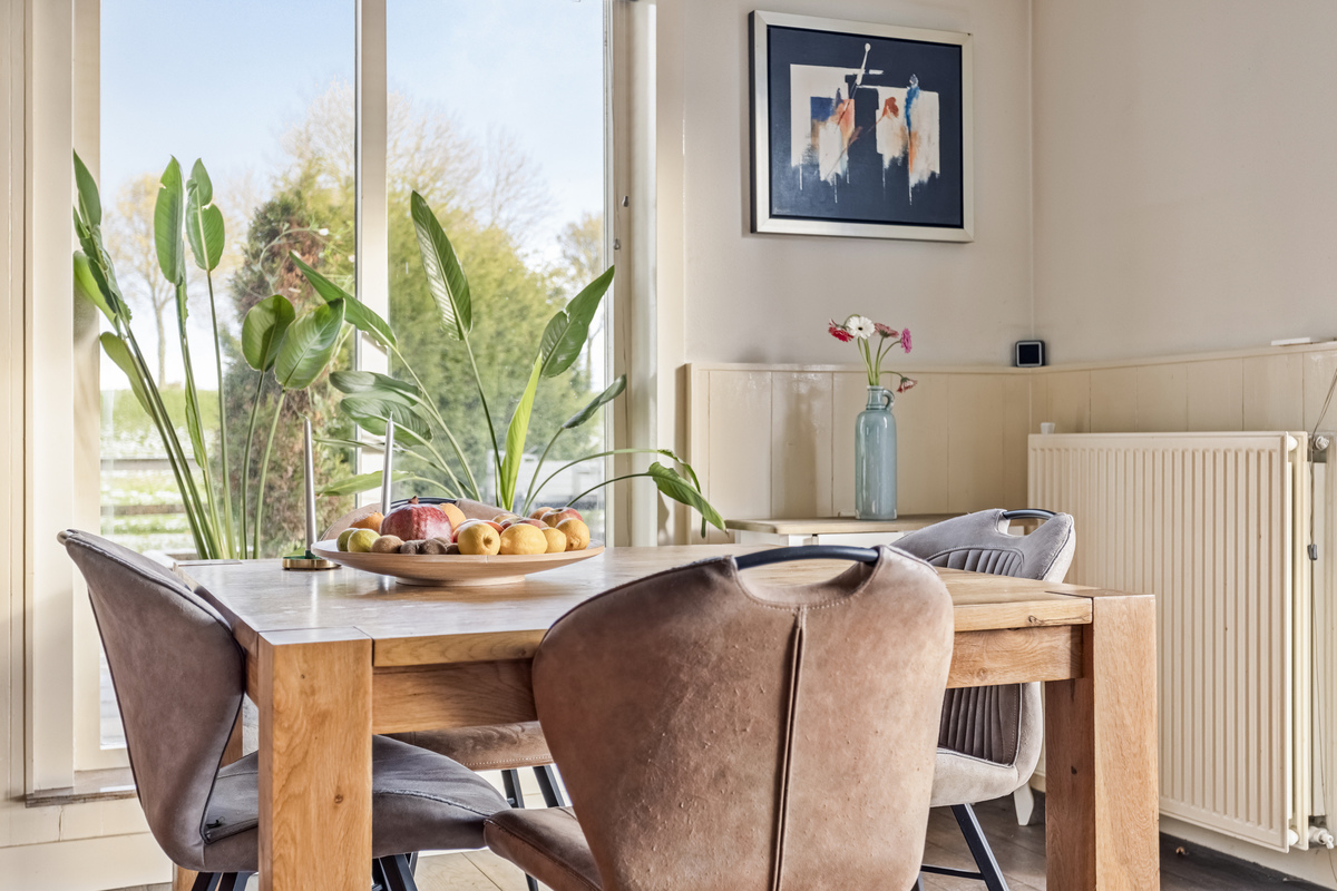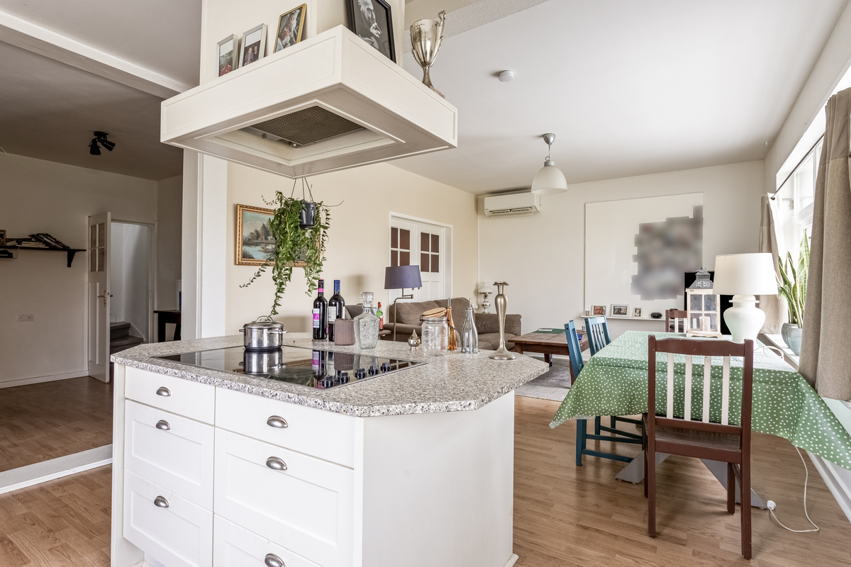 Aan de voorzijde is het eerste woongedeelte met een zithoek, eettafel en een ruime keukenopstelling met kookeiland. De keuken biedt, net als de woonkamer, mooi uitzicht naar de tuin. Alle benodigde apparatuur is aanwezig, inclusief een vaatwasser en een grote koel-/vriescombinatie.