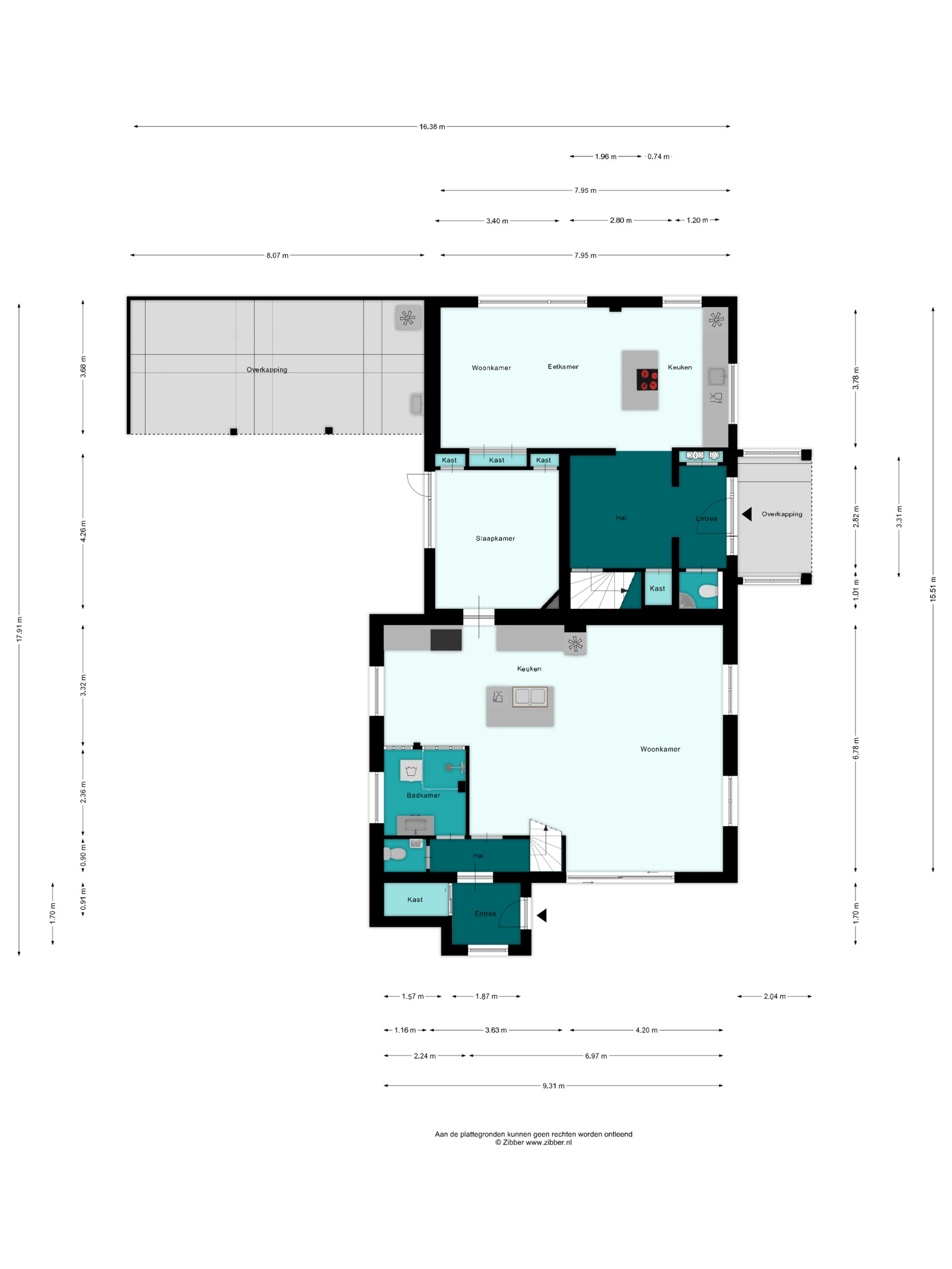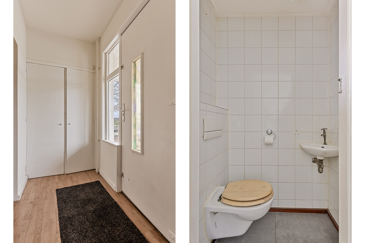 In de hal, aan de rechterzijde, is de meterkast en aan de linkerzijde een toiletruimte met fonteintje. Tweede, grootste deel van de hal biedt ruimte aan de eerste trap naar de eerste verdieping.