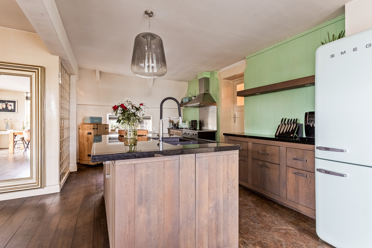 De woonkamer met open keuken van het tweede woongedeelte heeft een ruime opzet, met ramen aan drie zijden en een schuifpui aan de achterzijde. Sfeermakers zijn de eikenhouten vloer, marmeren vloer en de zeer ruime keukenopstelling met zwart granieten blad. Ook deze keuken is voorzien van diverse inbouwapparatuur, waaronder een zwart inductiefornuis met dubbele oven.