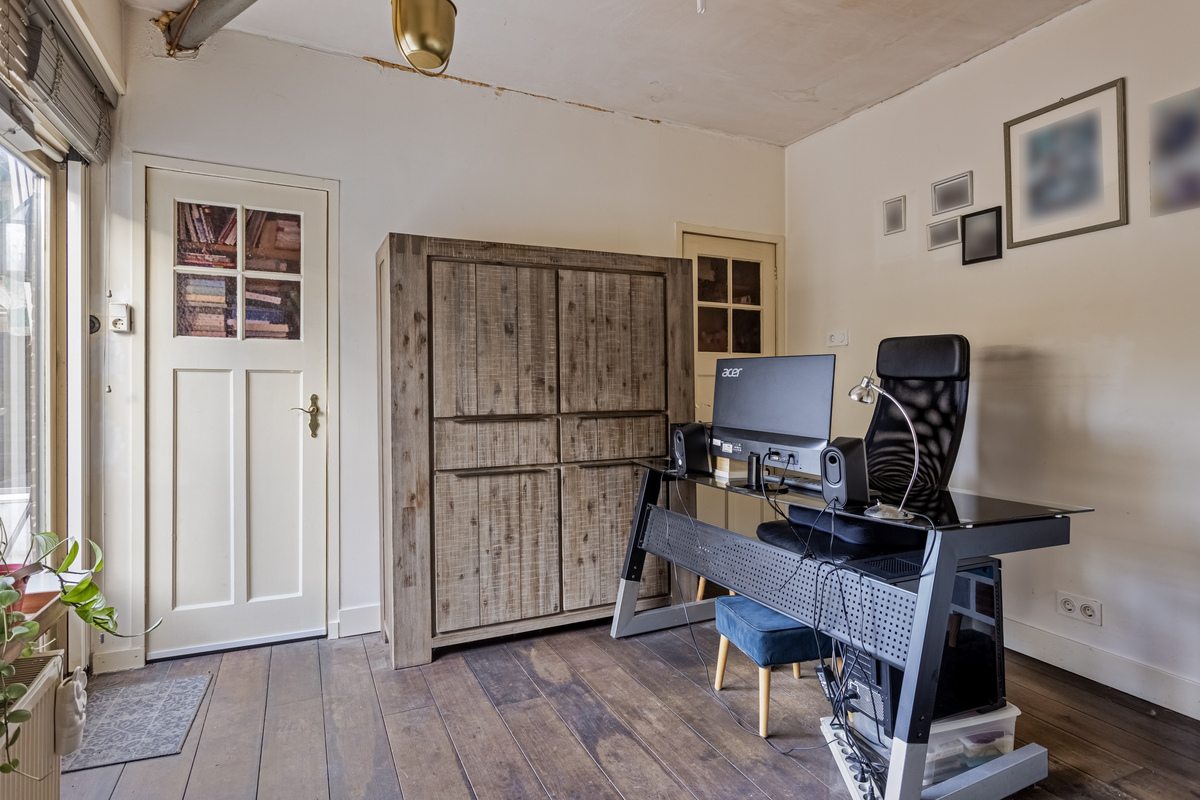 In het midden van de begane grond is een werkkamer, die nu te bereiken is vanuit het tweede woongedeelte. Er is een mogelijkheid om een entree bij het eerste woongedeelte te realiseren. De werkkamer biedt fraai uitzicht naar de tuin en heet een buitendeur richting het nabijgelegen overdekte terras.