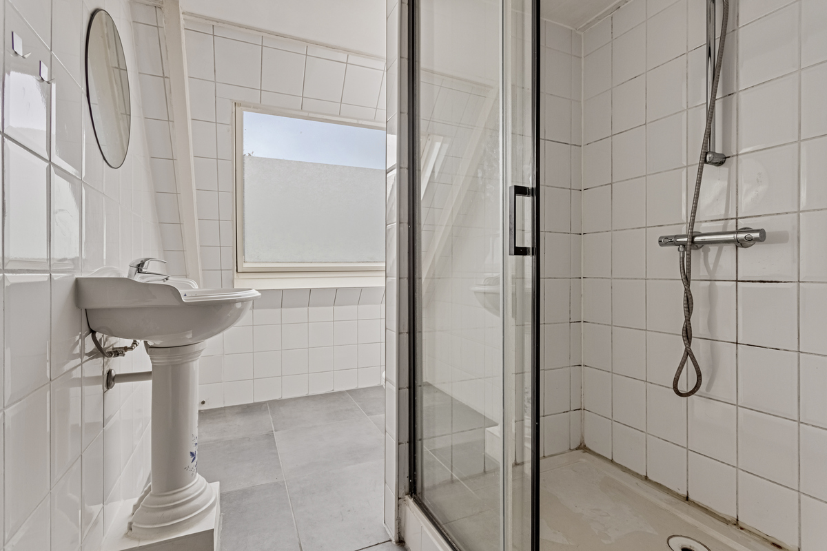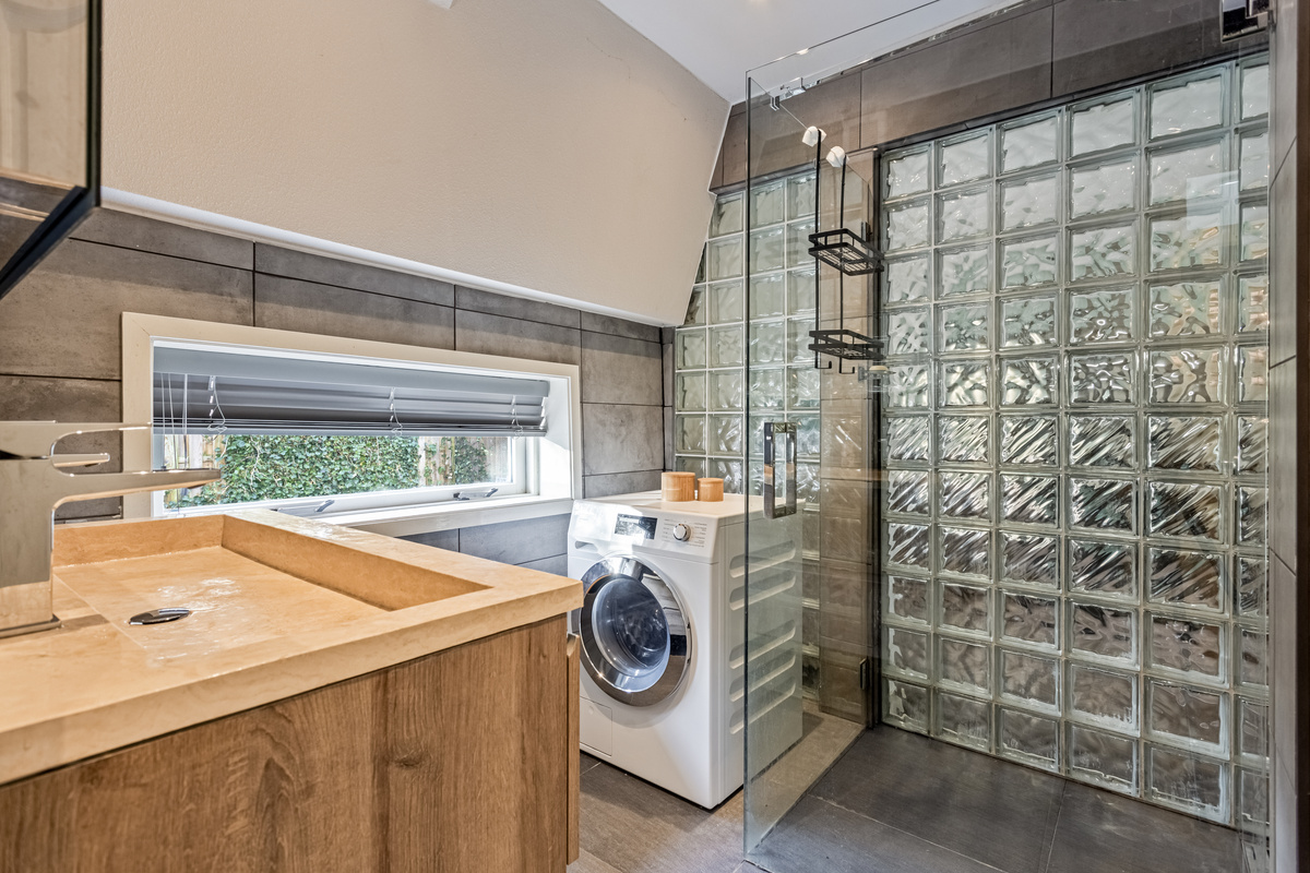 Het tweede woongedeelte heeft een eigen entree aan de achterzijde. Hier zijn een bergkast/garderobe en de hal met tweede trapopgang. Verder grenzen er een toiletruimte en badkamer aan deze hal. De moderne badkamer is ingedeeld met een douche, wastafelmeubel en de wasmachineaansluiting.