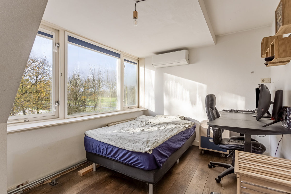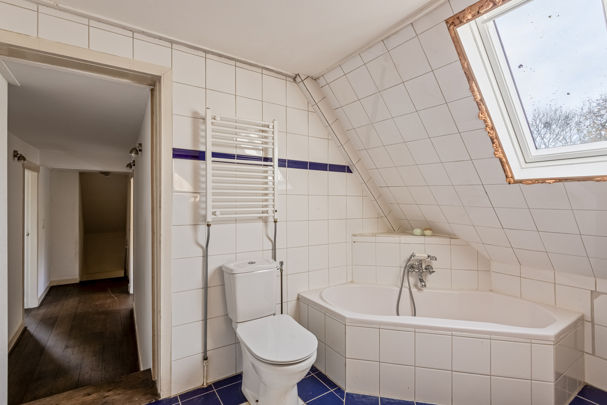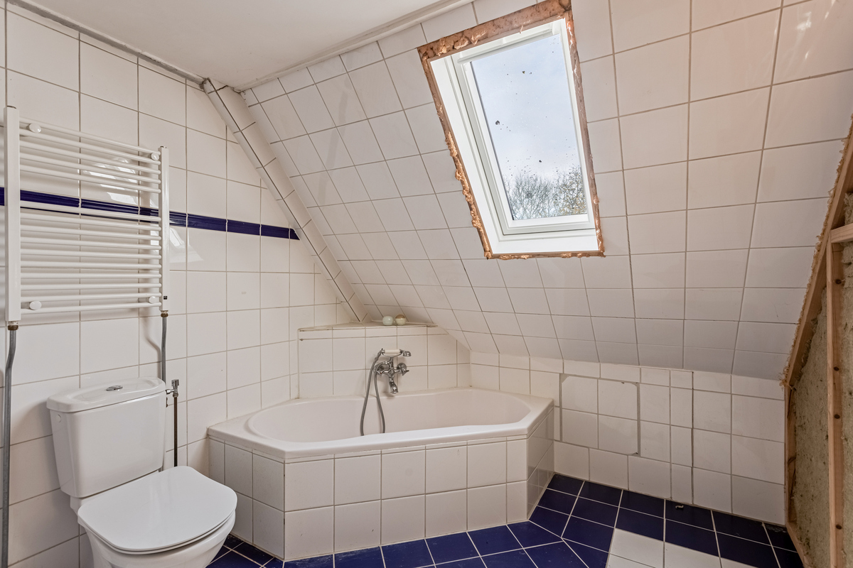 In de hal van het tweede woongedeelte is de tweede trap naar de eerste verdieping. Vanaf de lange overloop zijn twee slaapkamers en een badkamer te bereiken. Er ligt, net als op de begane grond, een eikenhouten vloer en vanuit de grootste slaapkamer is een inloopkast te bereiken. De tweede slaapkamer, met een dakkapel, bevindt zich tussen een kleedruimte en een badkamer. Deze badkamer, met een groot dakraam, is ingedeeld met een hoekbad, toilet en een handdoekenradiator.