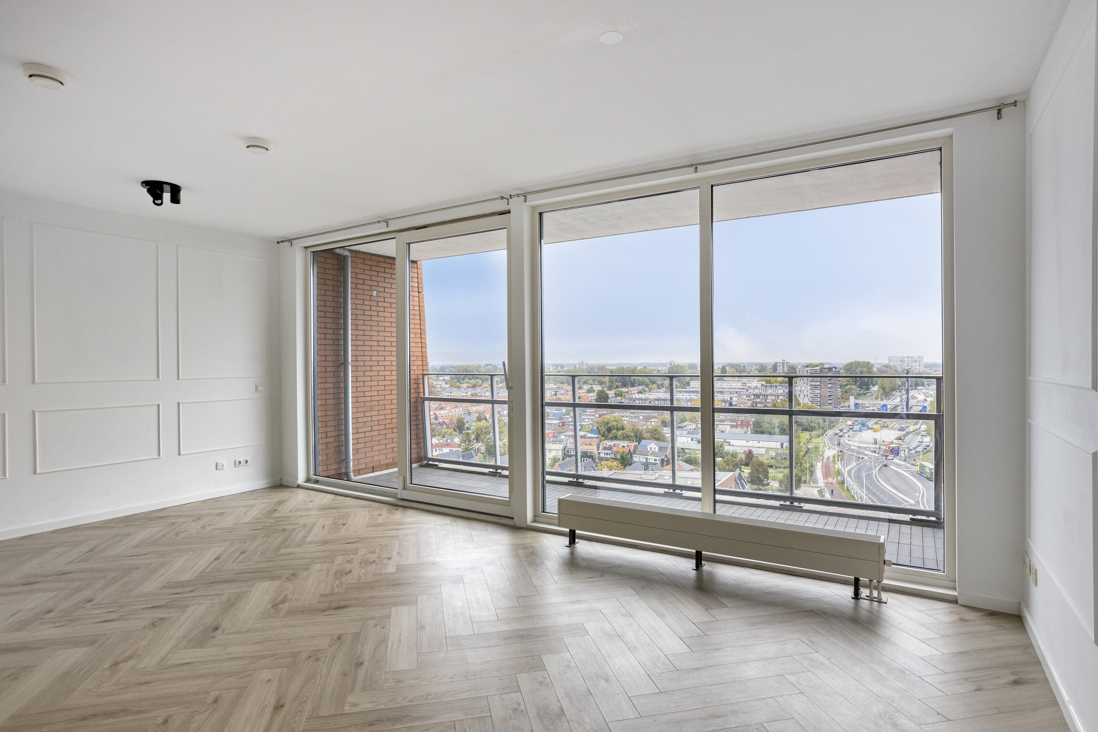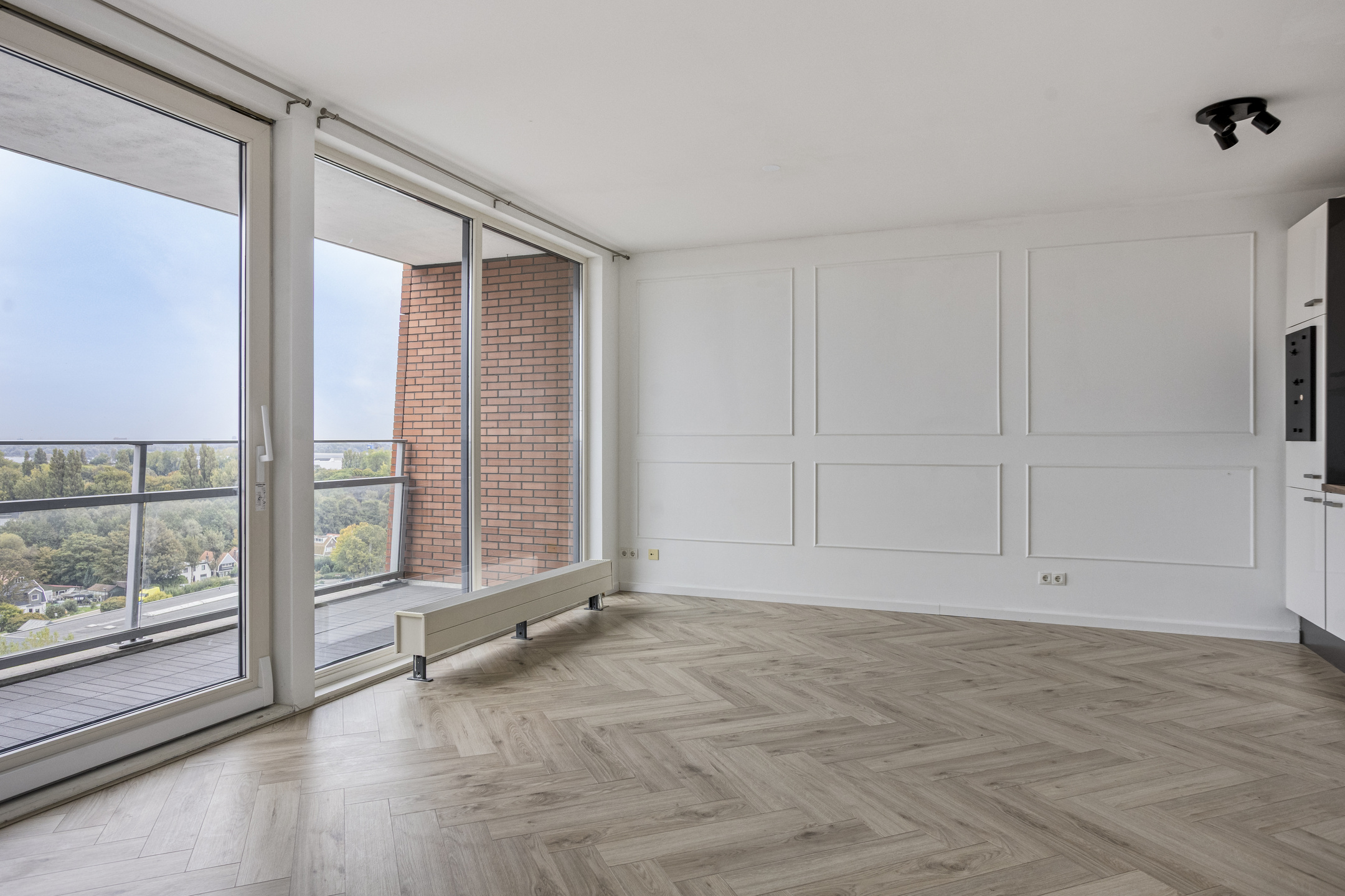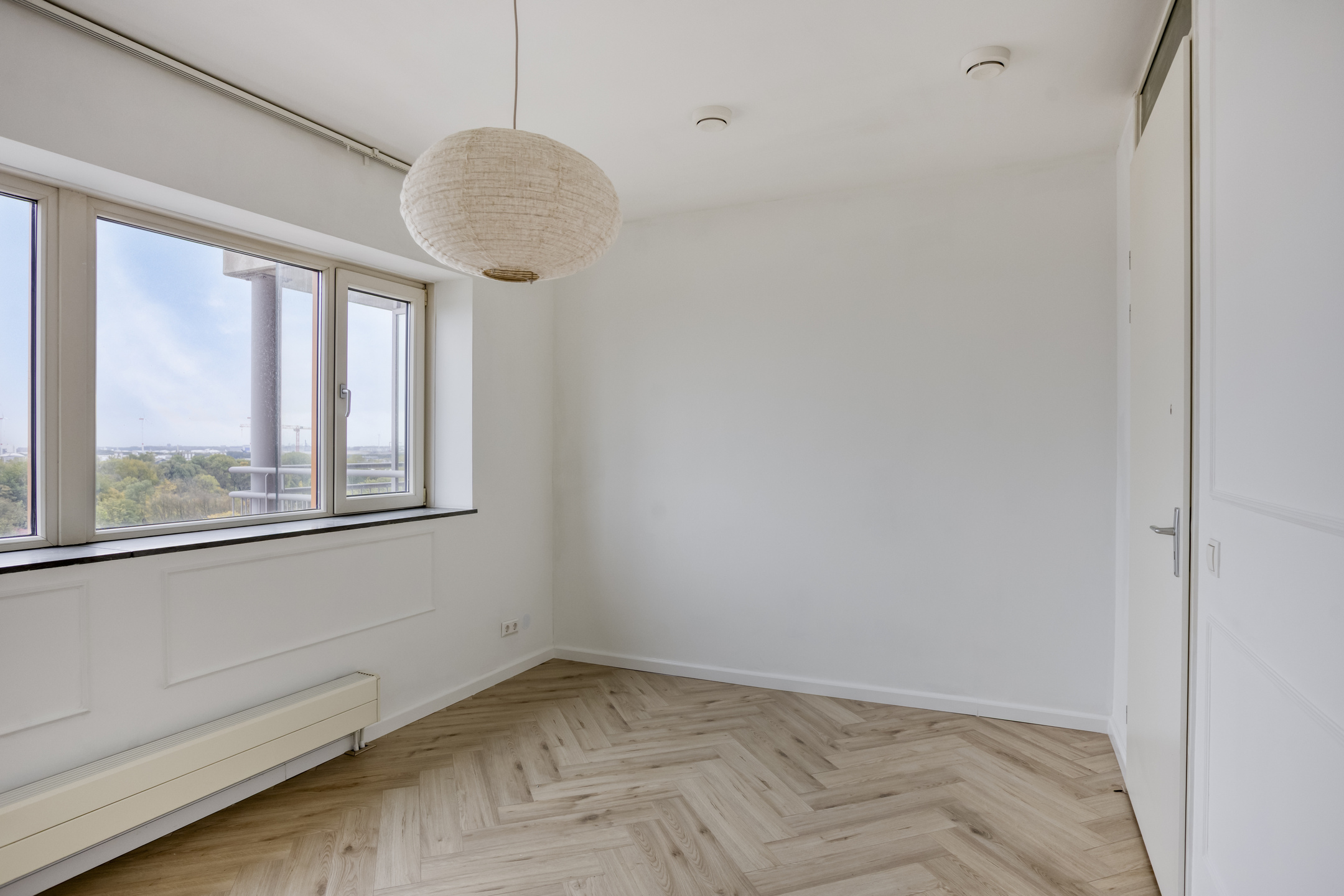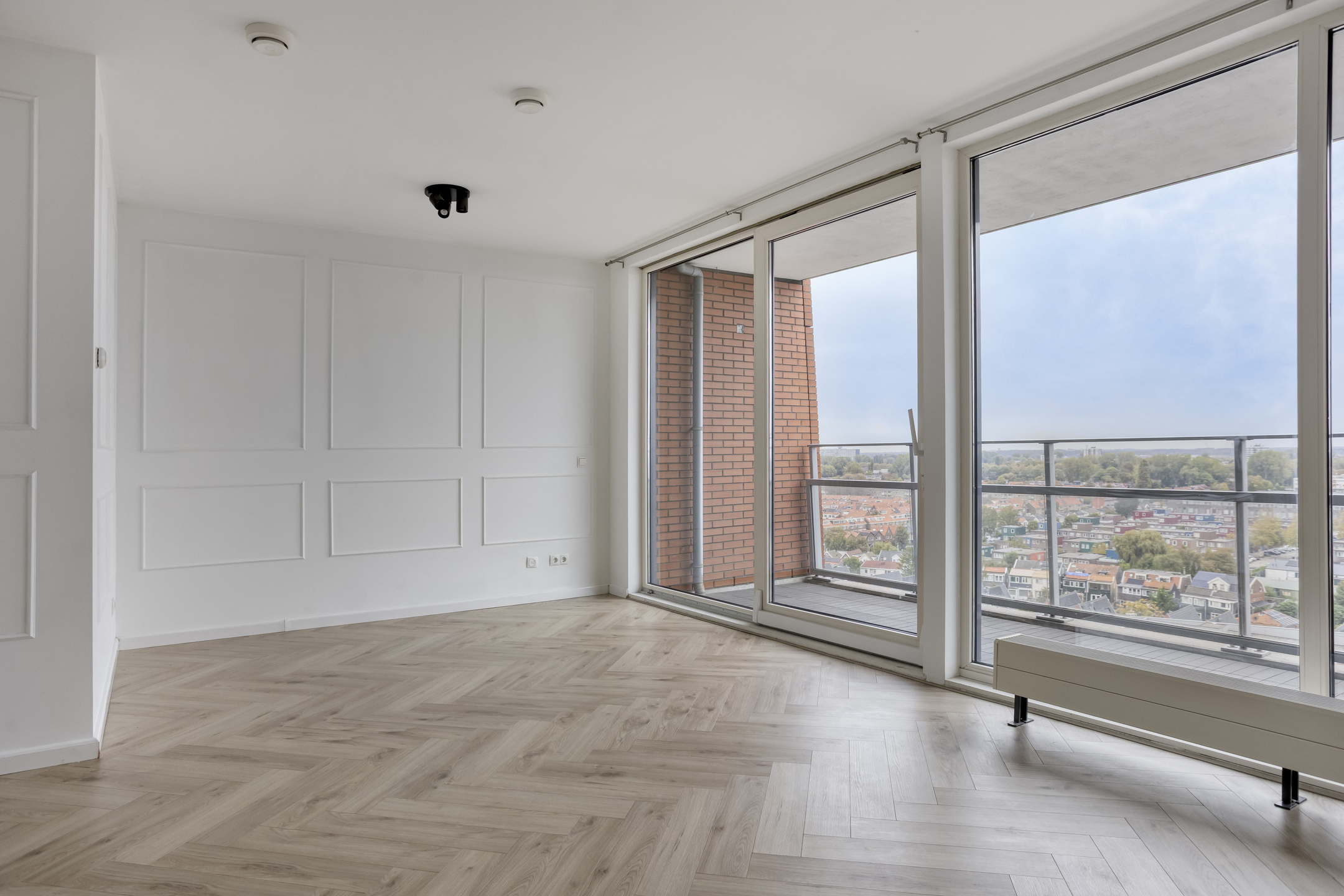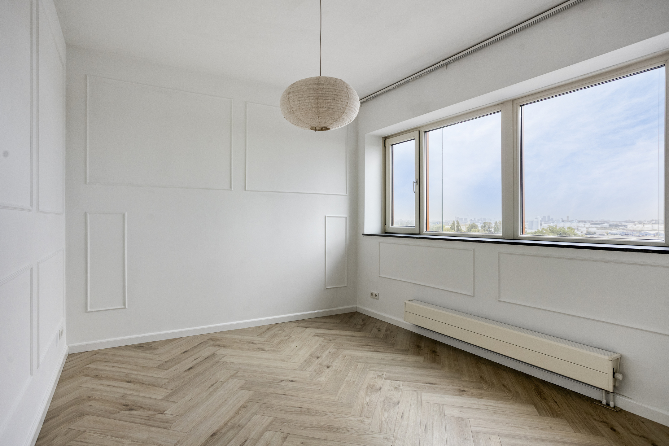 De woonkamer is licht en ruim, dankzij de grote ramen en de ligging op de 12e verdieping. Vanuit hier heb je direct toegang tot het ruime balkon op het oosten, waar je ’s ochtends heerlijk van de zon en het vrije uitzicht kunt genieten. De strakke visgraatvloer en de moderne sierlijsten geven het appartement een stijlvolle en eigentijdse uitstraling.
