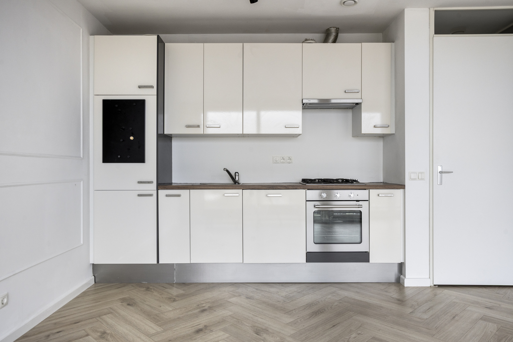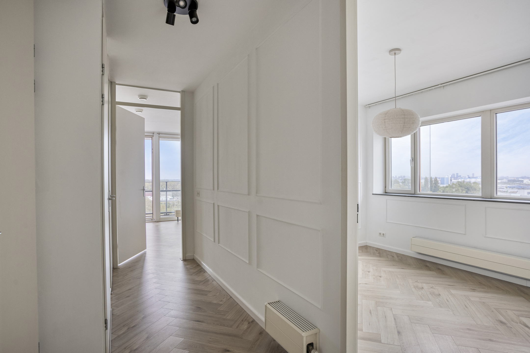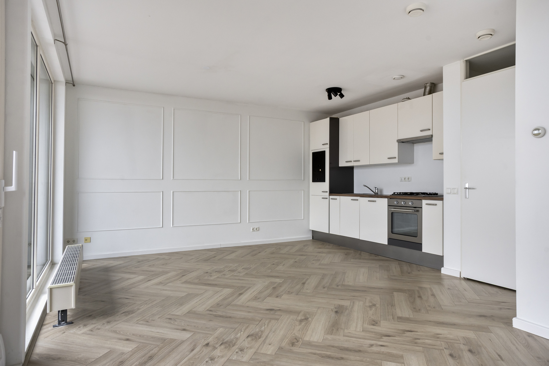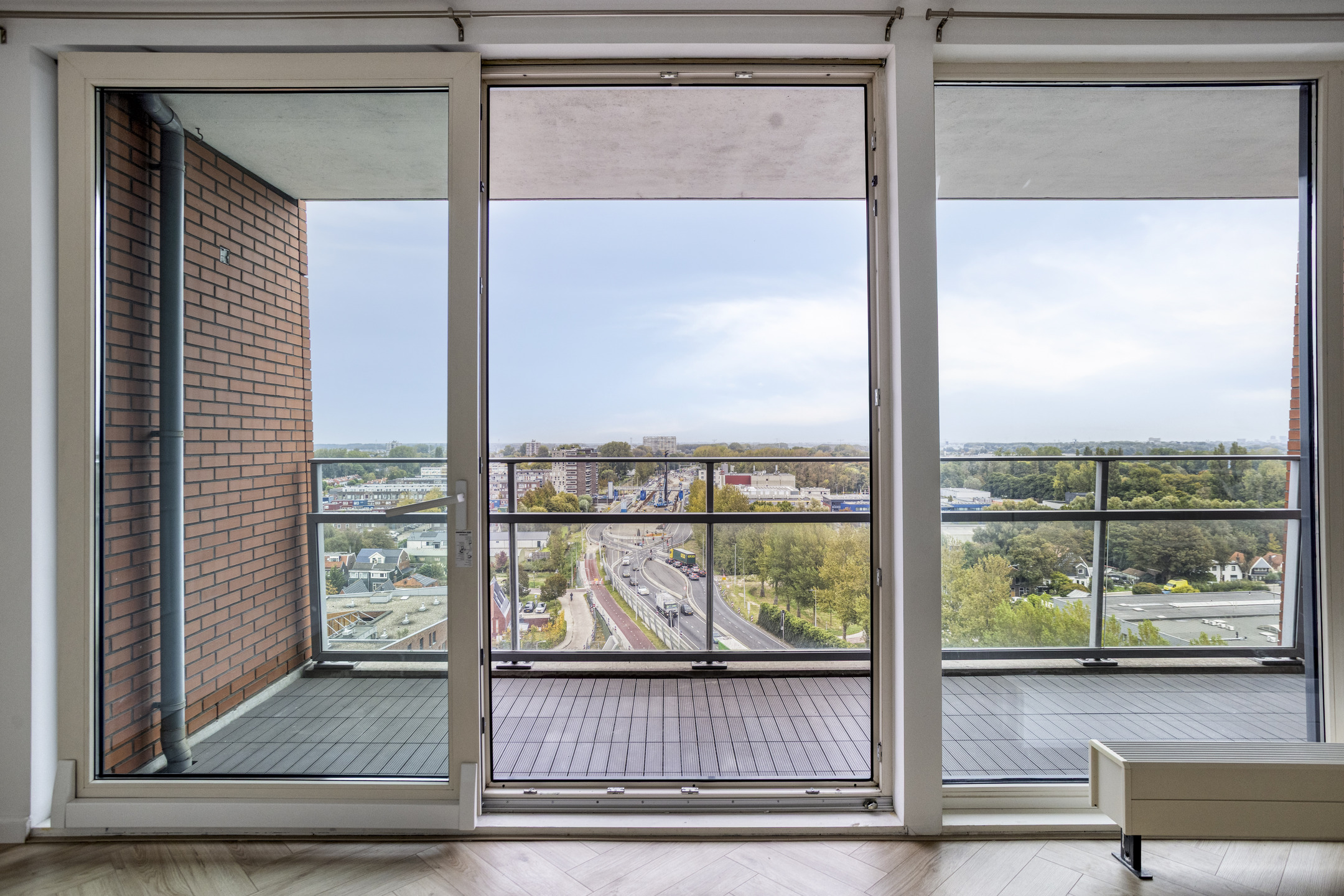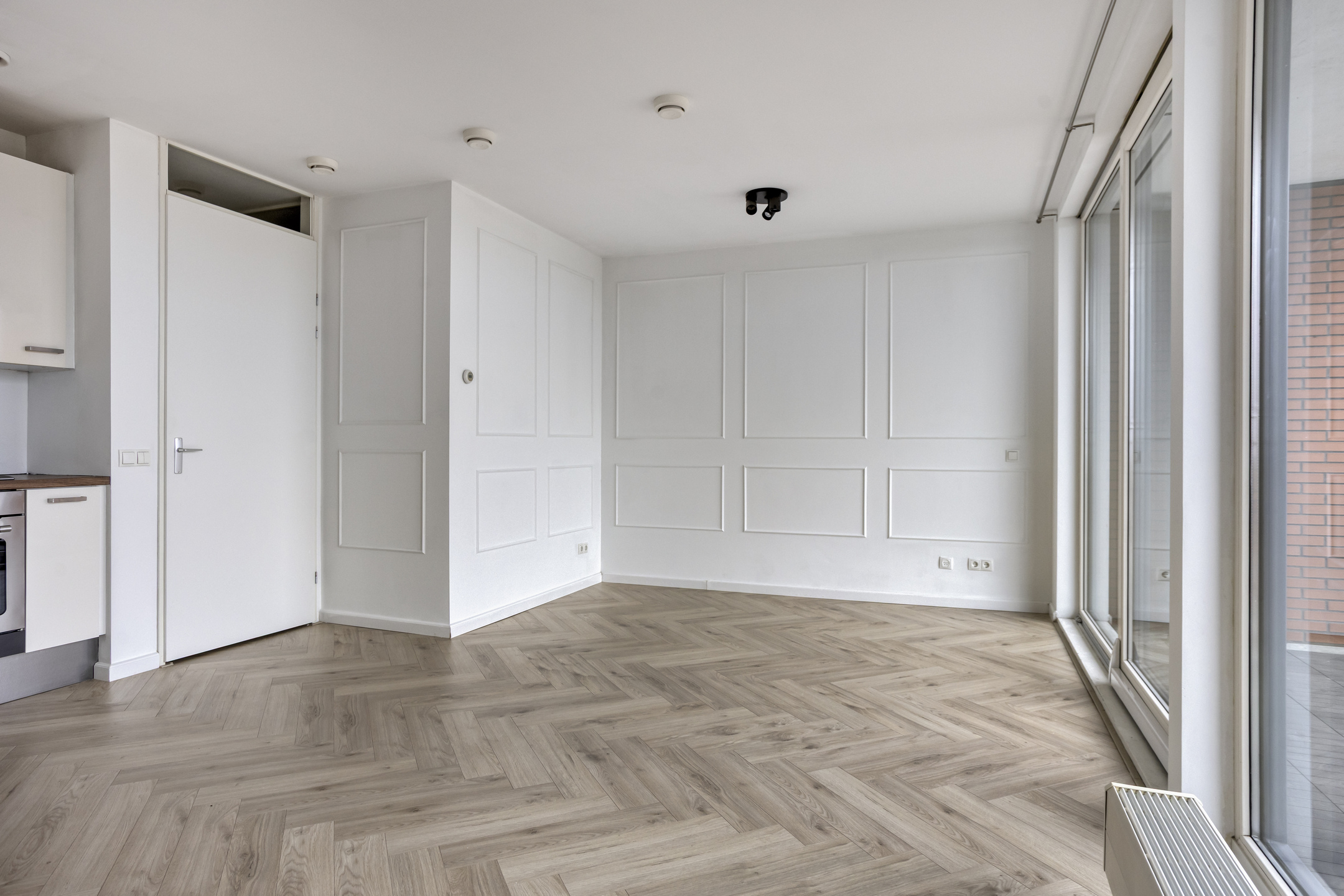 De woonkamer is licht en ruim, dankzij de grote ramen en de ligging op de 12e verdieping. Vanuit hier heb je direct toegang tot het ruime balkon op het oosten, waar je ’s ochtends heerlijk van de zon en het vrije uitzicht kunt genieten. De strakke visgraatvloer en de moderne sierlijsten geven het appartement een stijlvolle en eigentijdse uitstraling.