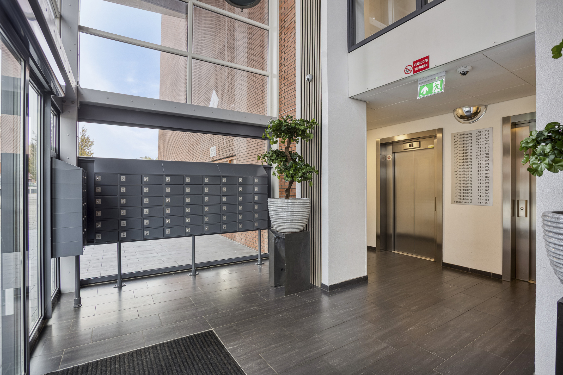 Bij binnenkomst in het complex word je verwelkomd in een verzorgde centrale hal met een moderne en nette uitstraling. Hier vind je de brievenbussen, het bellentableau en de toegang tot de lift en het trappenhuis. De entree is ruim opgezet en goed onderhouden, wat direct een prettige indruk geeft.