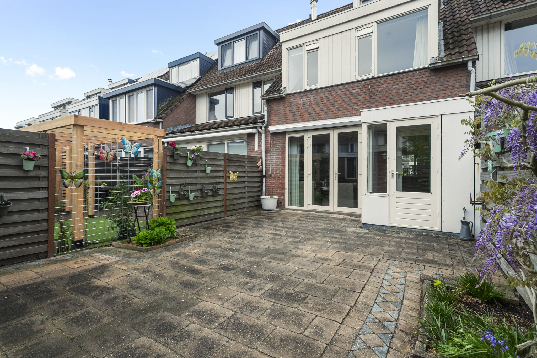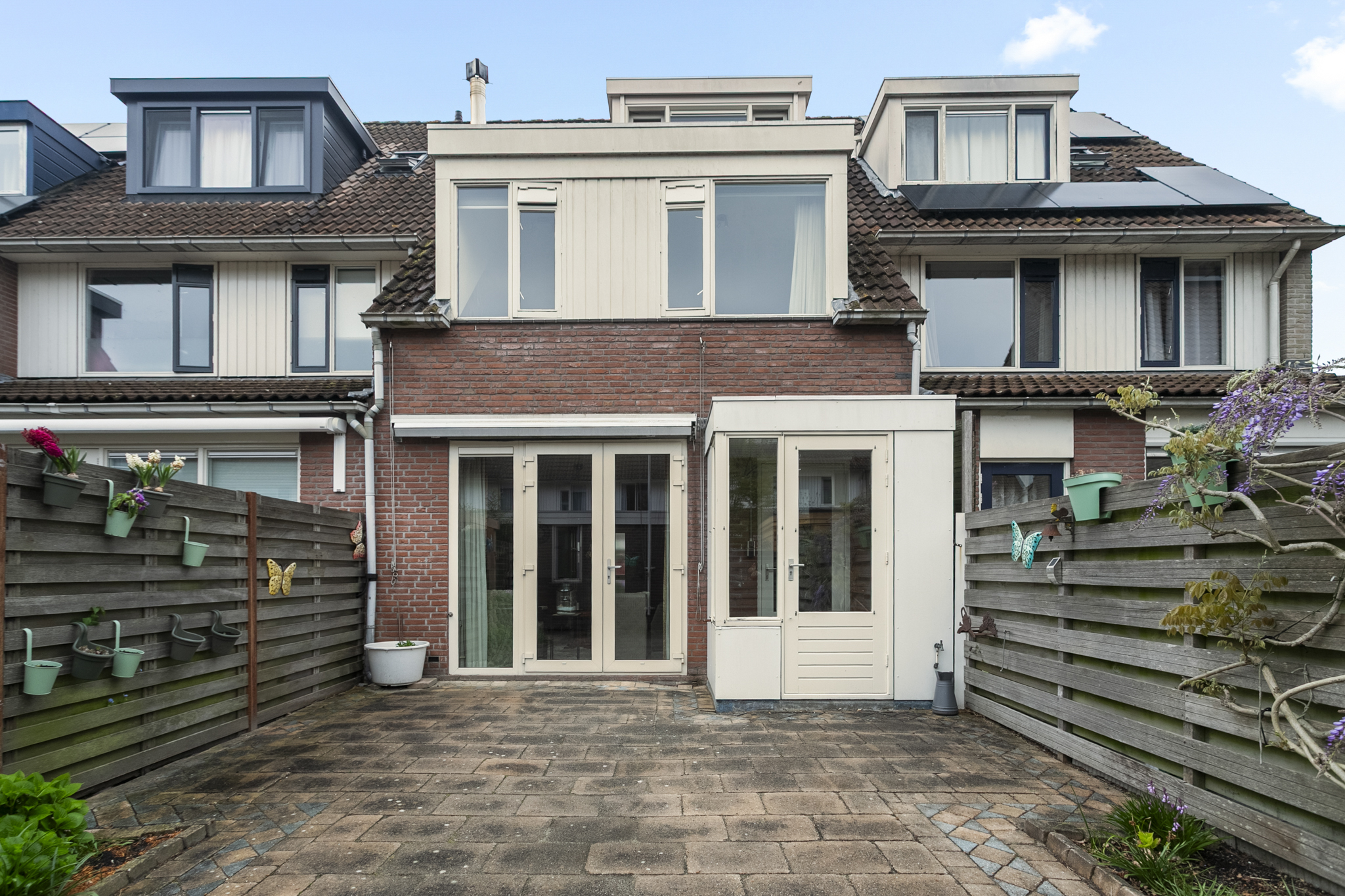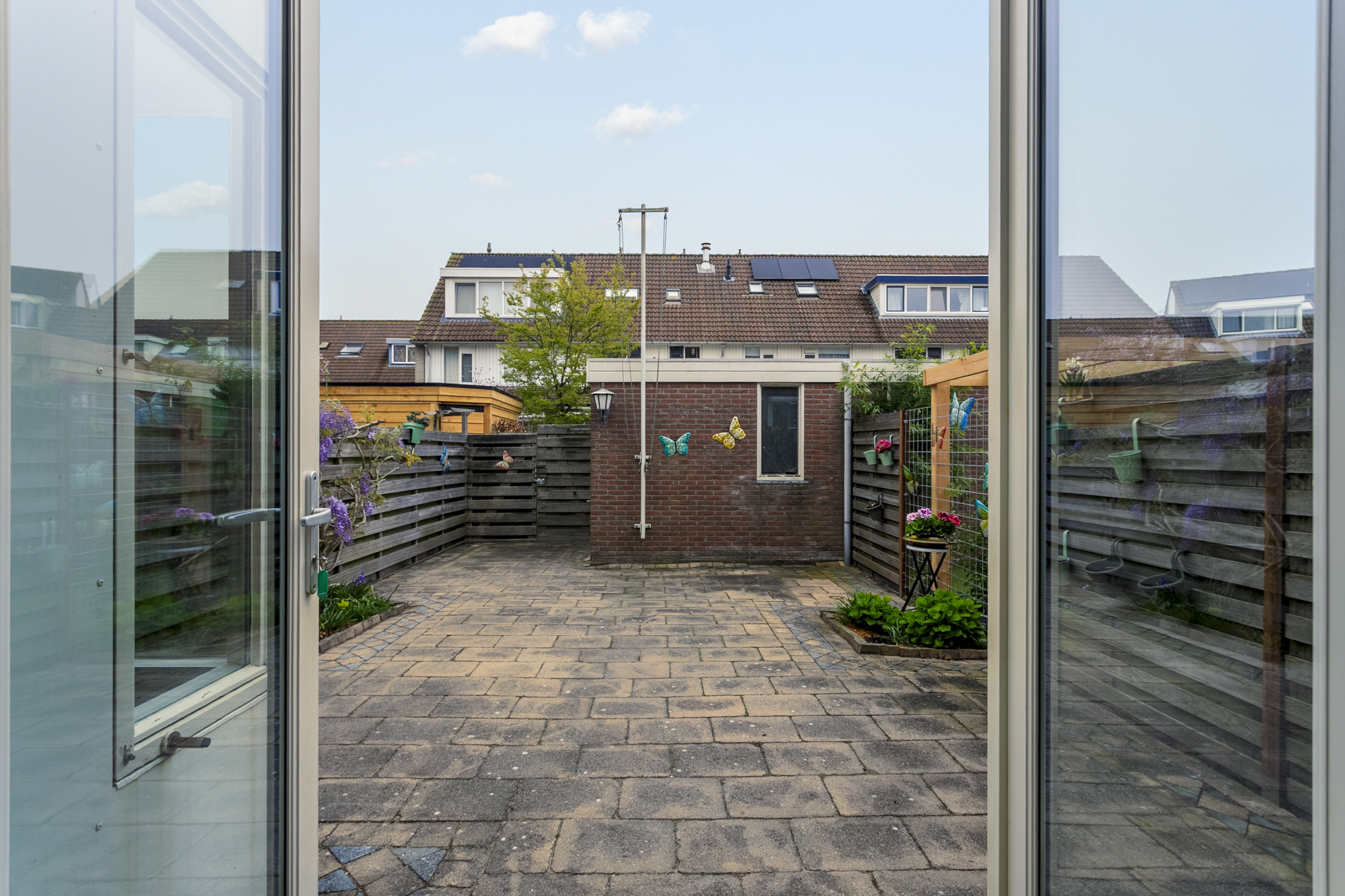 Vanuit de woonkamer en het portaal is de achtertuin te bereiken, gesitueerd op het oosten. Een groot deel van de tuin is bestraat, waardoor er genoeg plek is om buiten te zitten. Ook handig: naast de stenen berging is een poort naar de steeg.