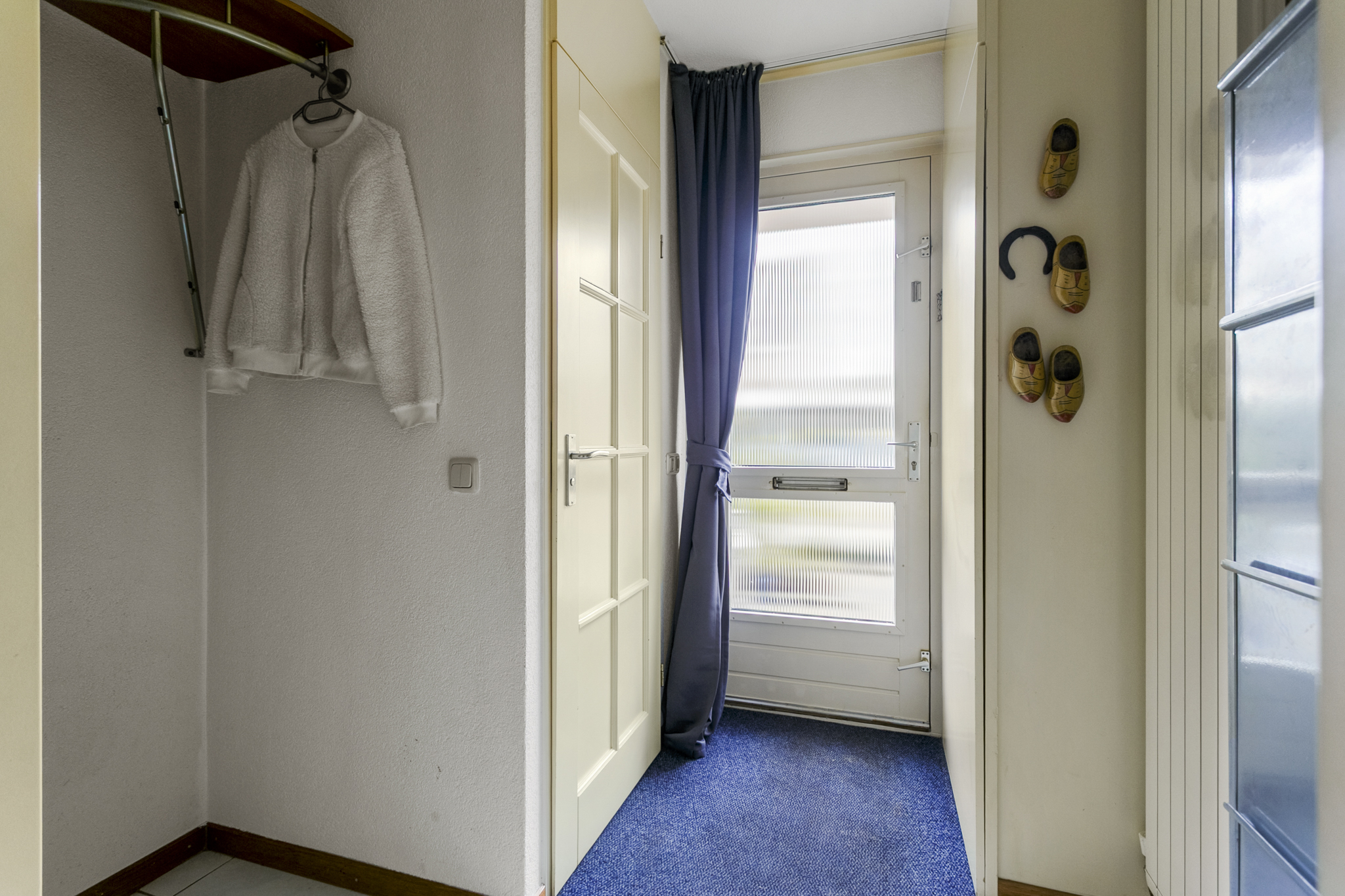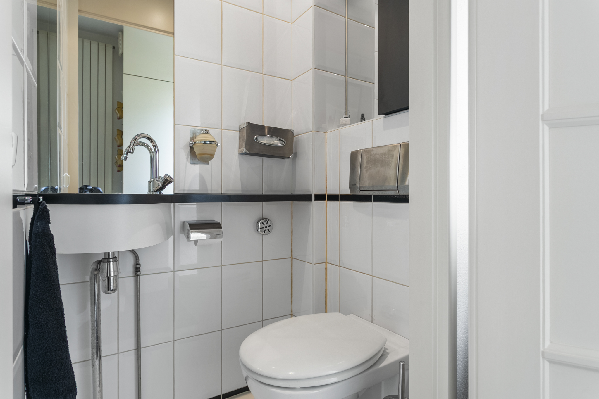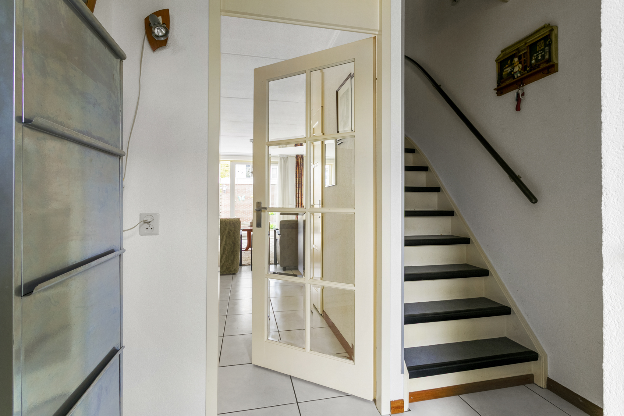 In de hal ligt, net als op bijna de hele begane grond, een lichte plavuizenvloer. Naast de meterkast hangt een hoge designradiator en aan de andere zijde, naast de toiletruimte, is ruimte voor een kapstok. Ook de trap naar de eerste verdieping bevindt zich in de hal.