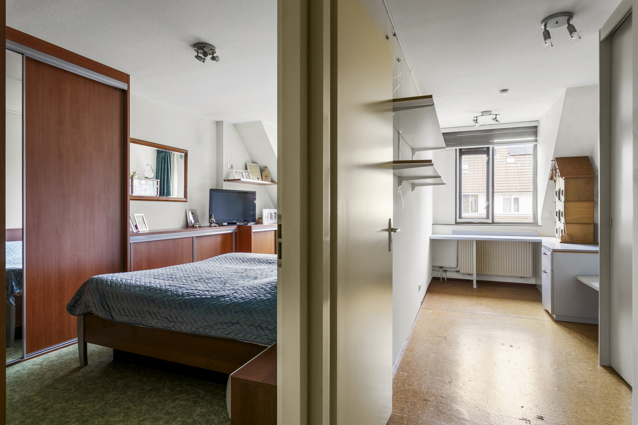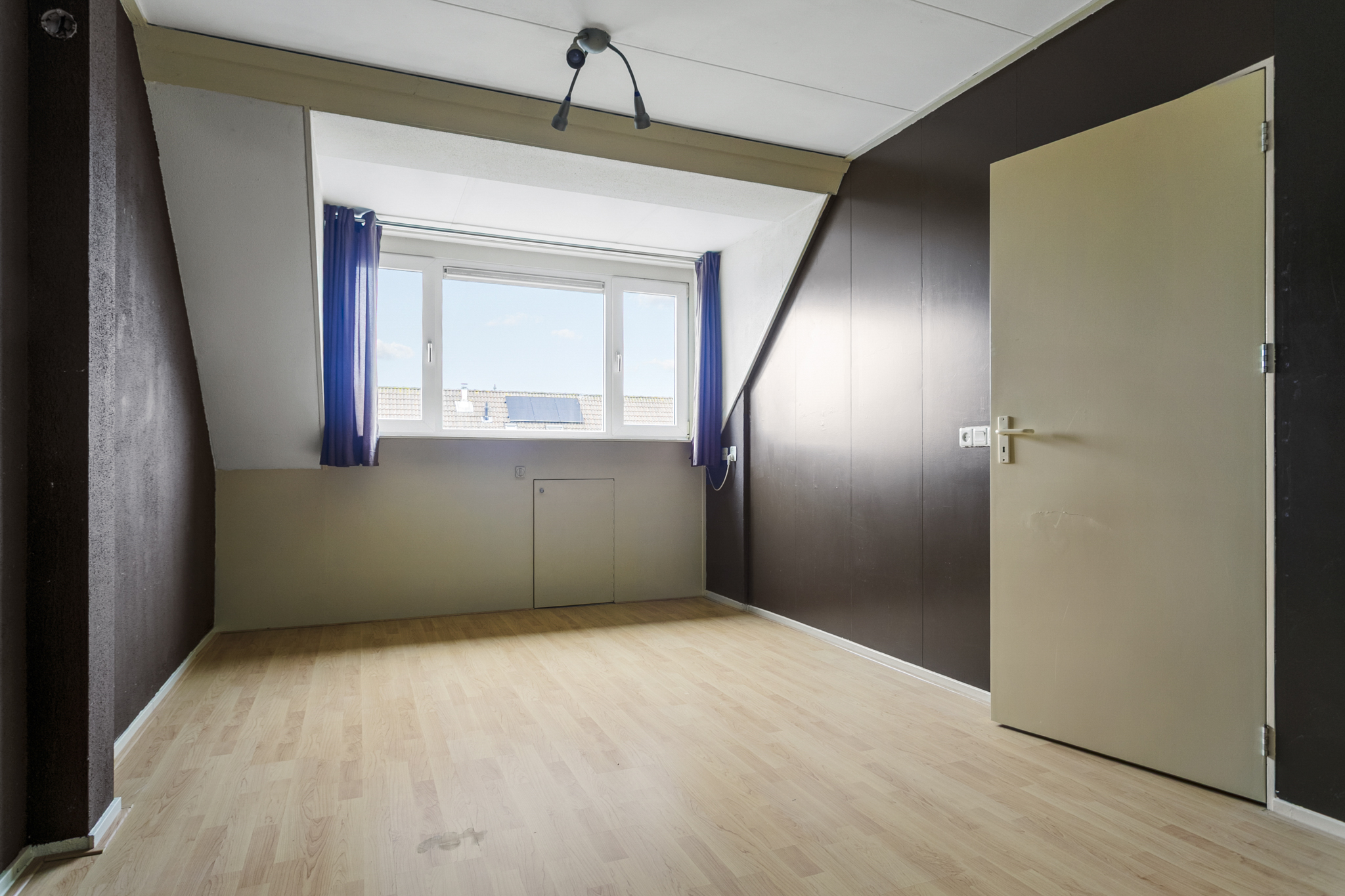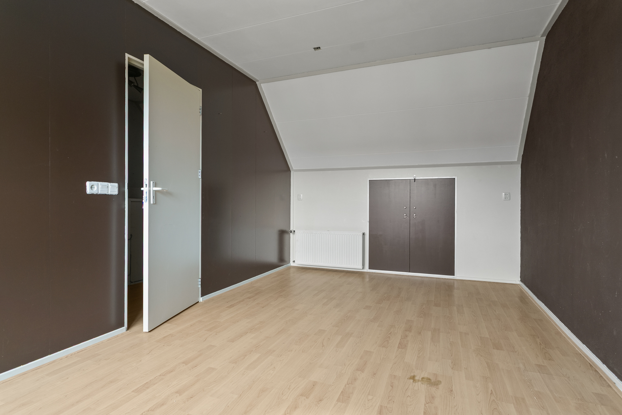 Niet alleen op de eerste verdieping, maar ook op de tweede verdieping is een dakkapel geplaatst. Het resultaat hiervan zie je in de vierde slaapkamer, met een hoog plafond en bergruimte in de schuinten van het dak.