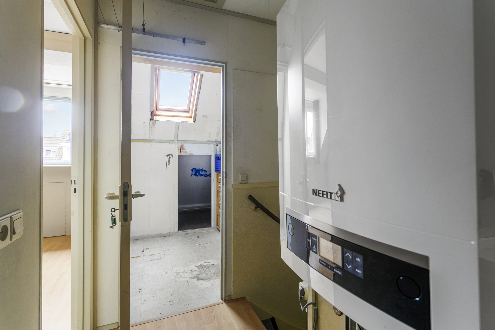 Deze slaapkamer grenst aan de overloop, waar de HR-ketel hangt en de wasmachineaansluiting is. Verder is er een hobbyruimte op deze verdieping, die verbouwd kan worden tot een fijne werkplek.