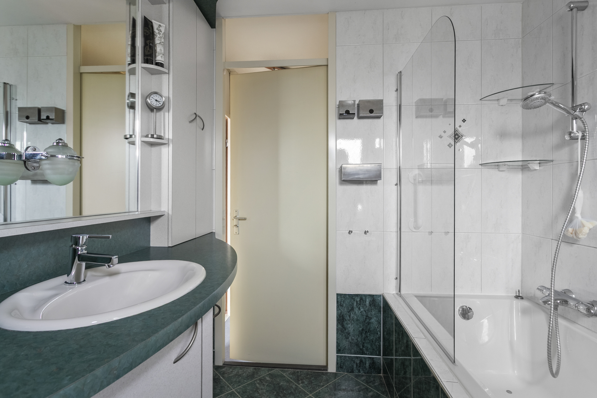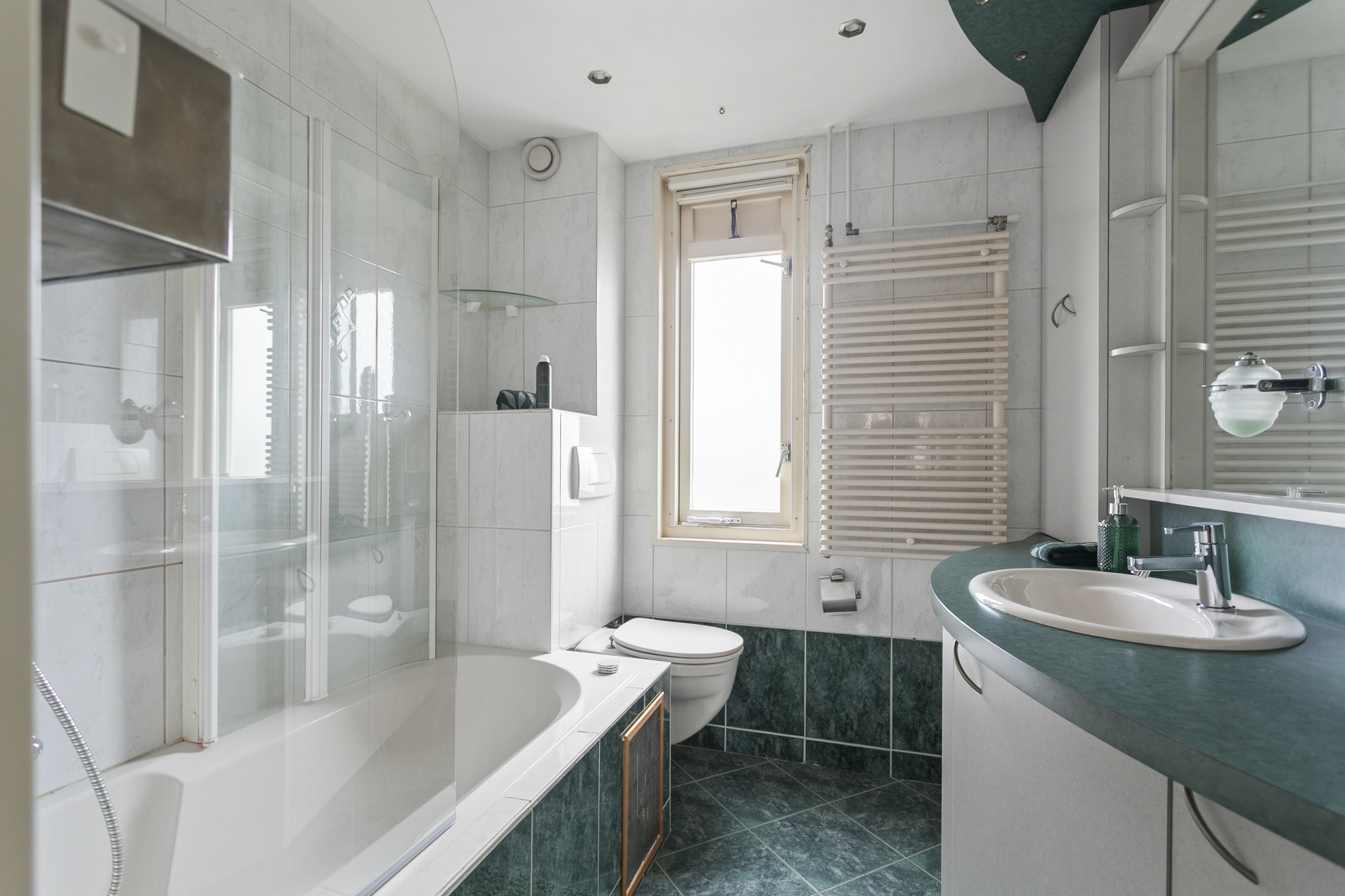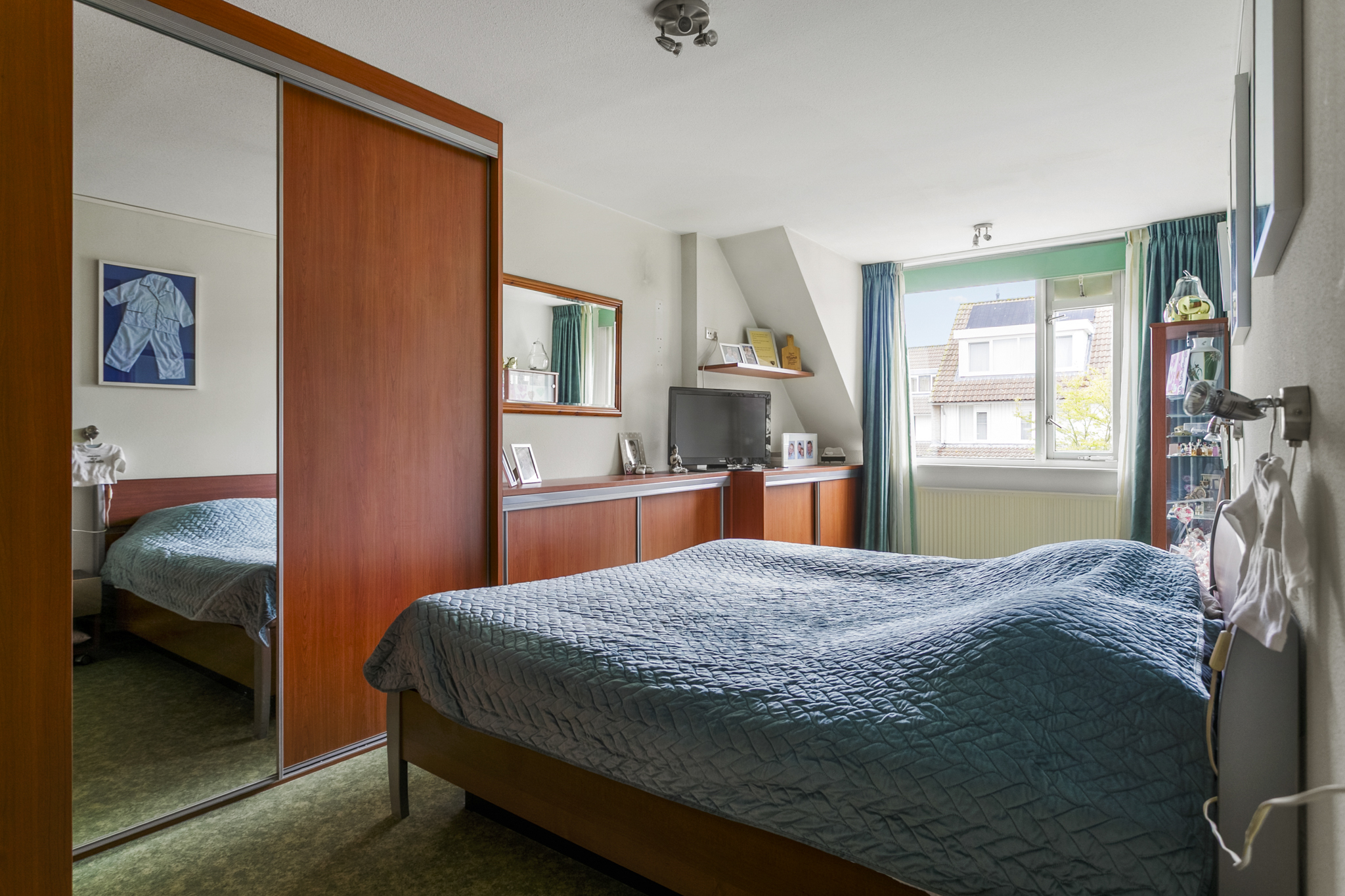 Dankzij de brede dakkapel aan de achterzijde is de ruimte op de eerste verdieping fors vergroot. Dit zie je vooral in de slaapkamers aan de achterzijde, ingericht als werkkamer/hobbyruimte en master bedroom. In de master bedroom zie je een maatwerk interieur, met hoge garderobekasten en een halfhoge kast met schuifdeuren. De derde slaapkamer bevindt zich, net als de badkamer, aan de voorzijde. De badkamer is optimaal ingedeeld met een ligbad/douchecombinatie, een wandcloset, handdoekenradiator en een groot wastafelmeubel.