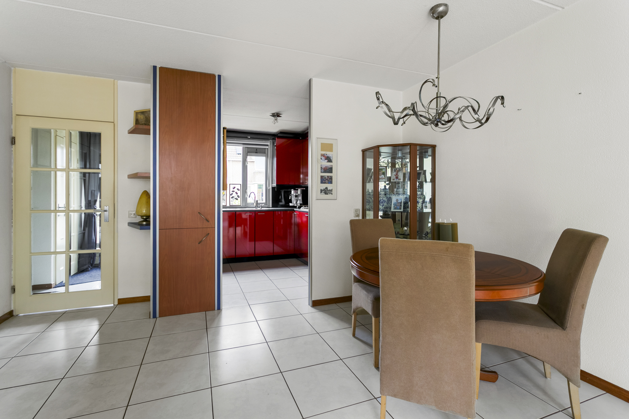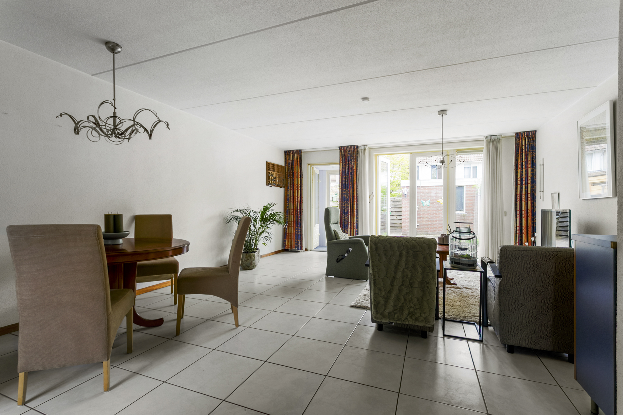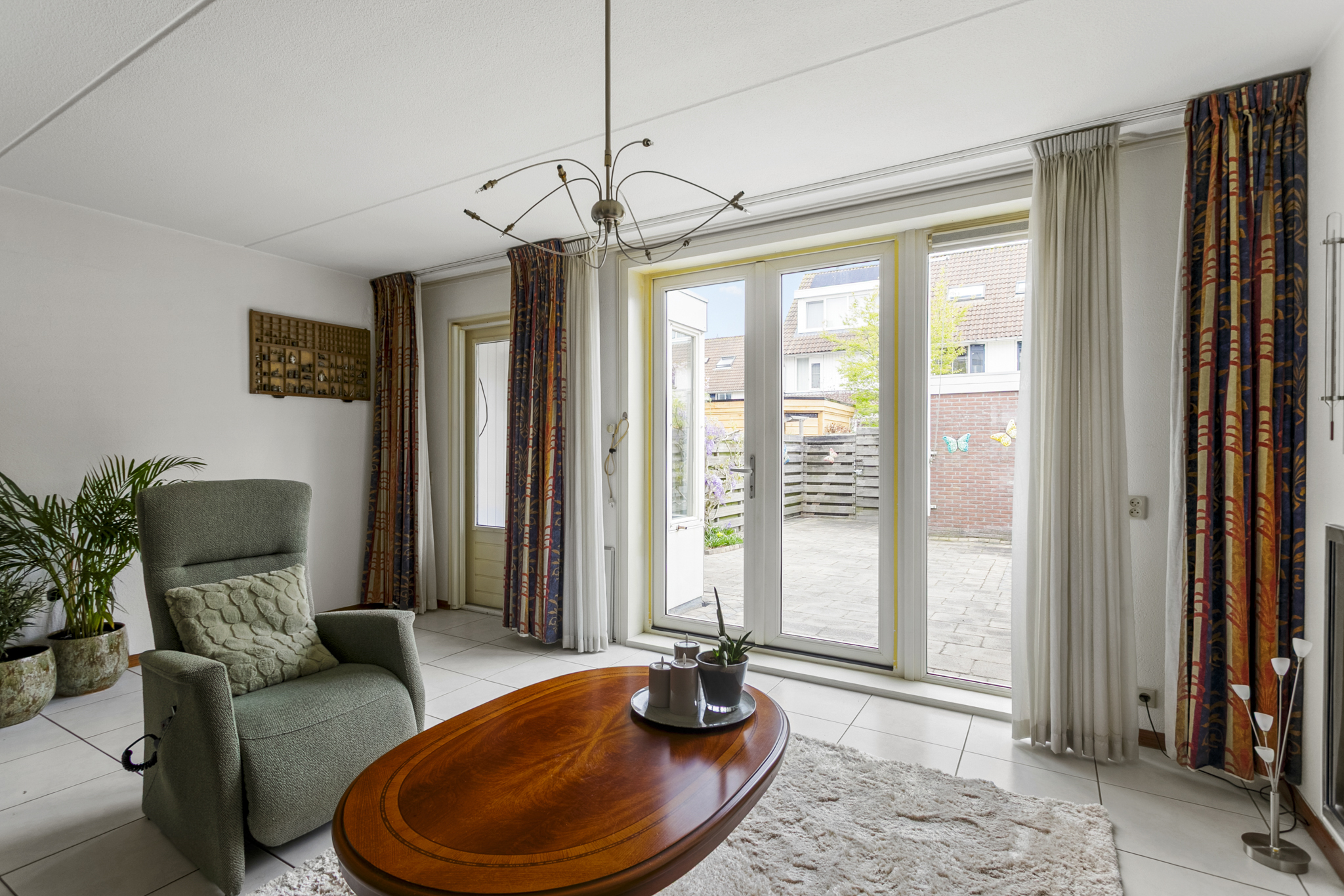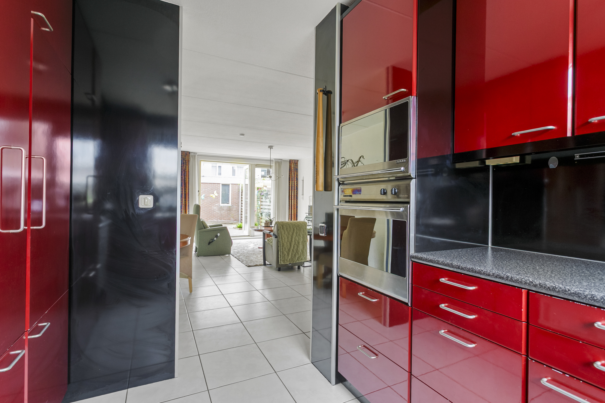 De woonkamer is een lichte en goed in te delen leefruimte, met openslaande deuren naar de tuin en een deur naar een aangebouwd portaal. Het zitgedeelte heeft een breedte van ruim 5.10 meter en het eetgedeelte grenst aan de halfopen keuken. Hier staat een hoogglans rode U-opstelling met een gaskookplaat, afzuigkap, vaatwasser, oven, magnetron, koelkast en een vriezer. Door de ramen bij het spoelgedeelte kijk je naar de voortuin en de rustige straat.