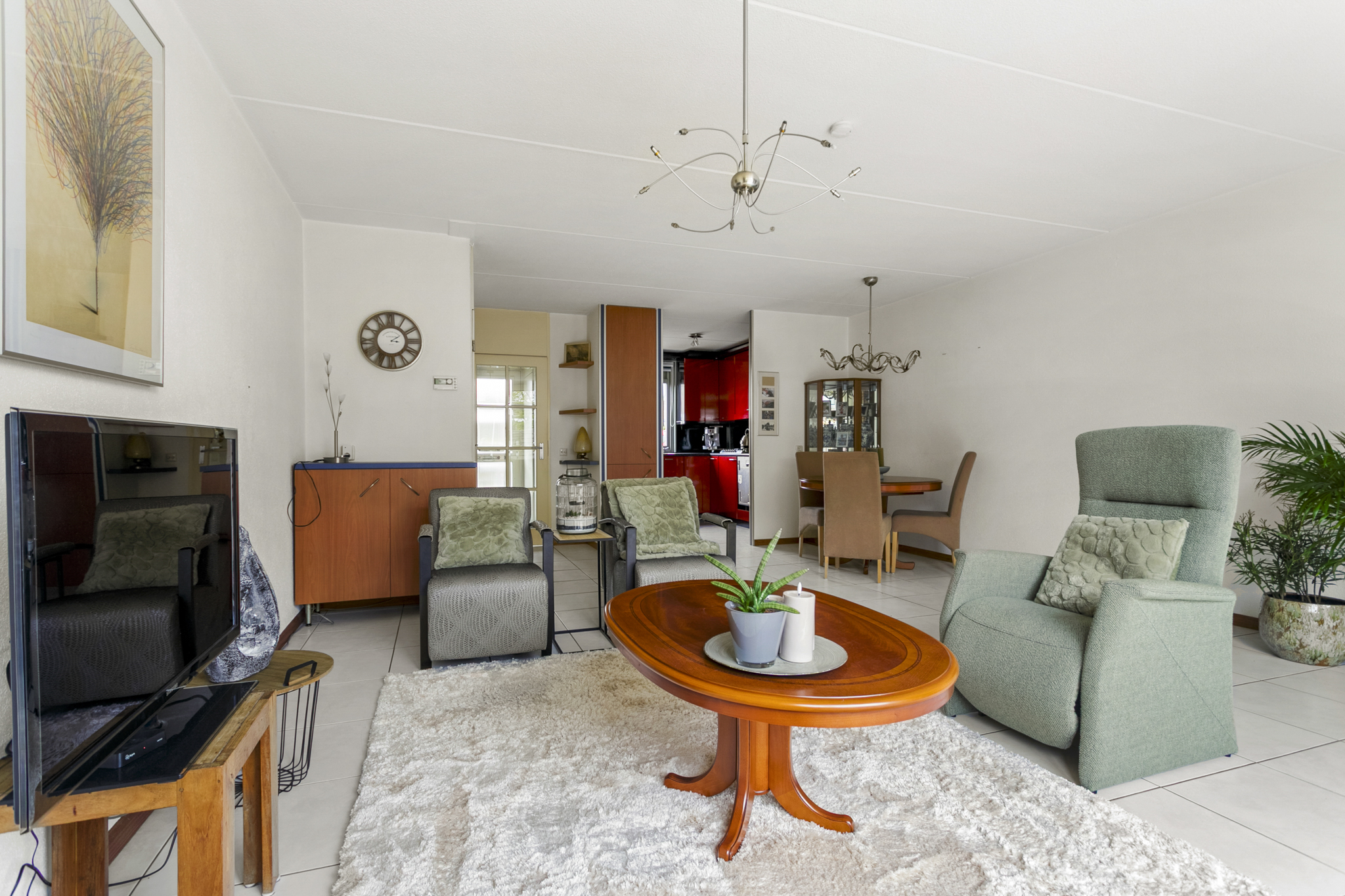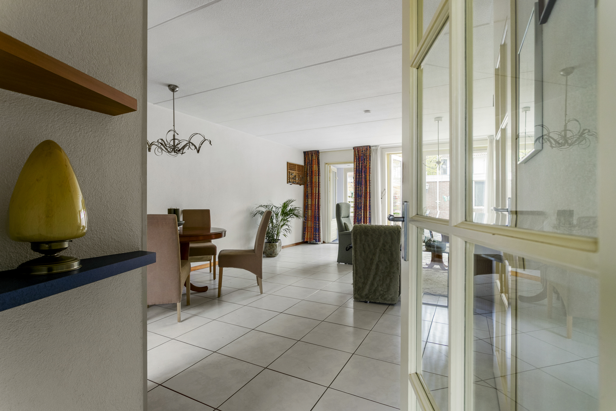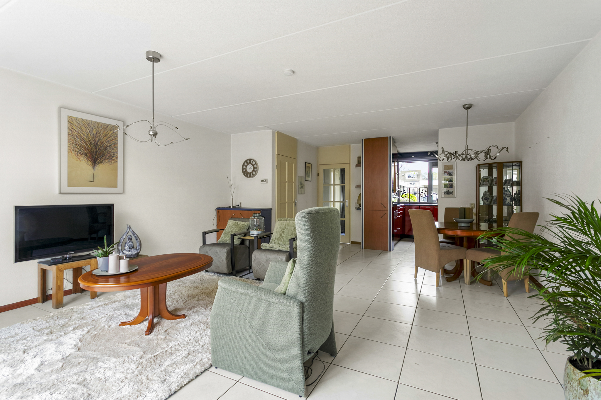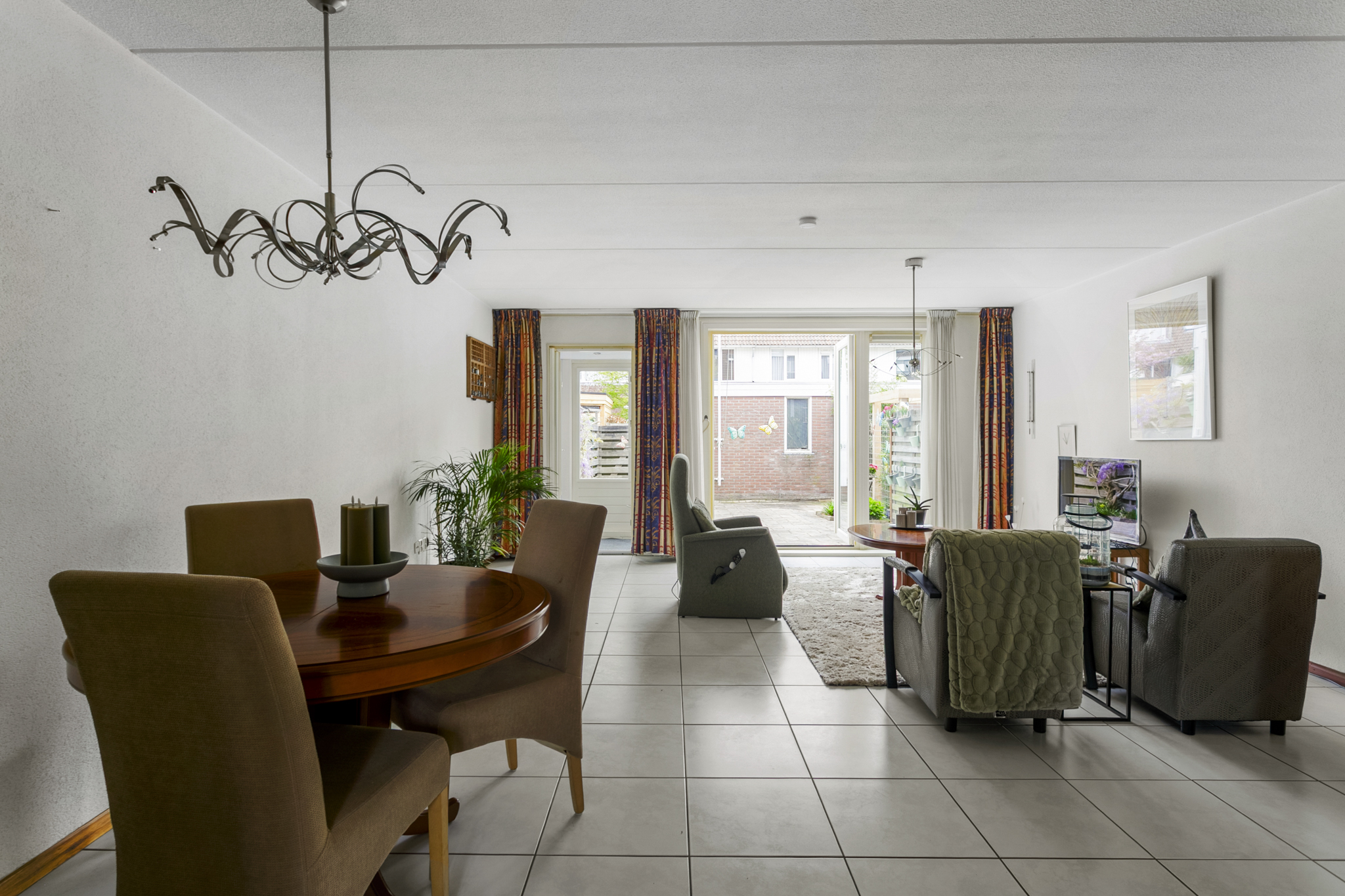 De woonkamer is een lichte en goed in te delen leefruimte, met openslaande deuren naar de tuin en een deur naar een aangebouwd portaal. Het zitgedeelte heeft een breedte van ruim 5.10 meter en het eetgedeelte grenst aan de halfopen keuken. Hier staat een hoogglans rode U-opstelling met een gaskookplaat, afzuigkap, vaatwasser, oven, magnetron, koelkast en een vriezer. Door de ramen bij het spoelgedeelte kijk je naar de voortuin en de rustige straat.