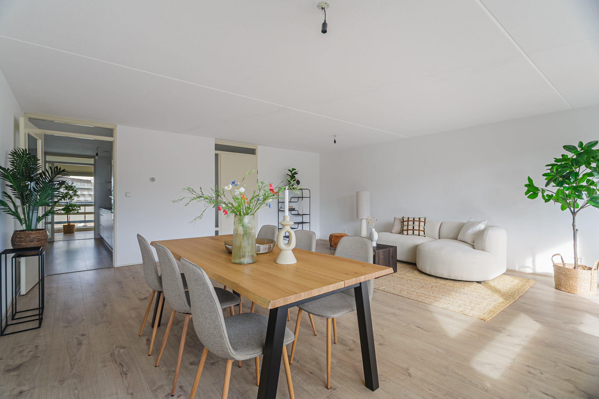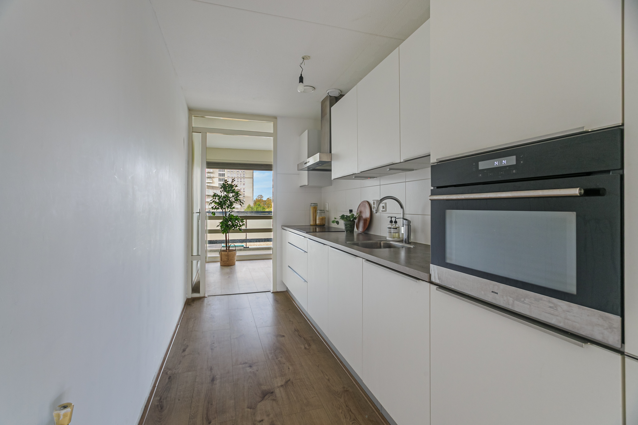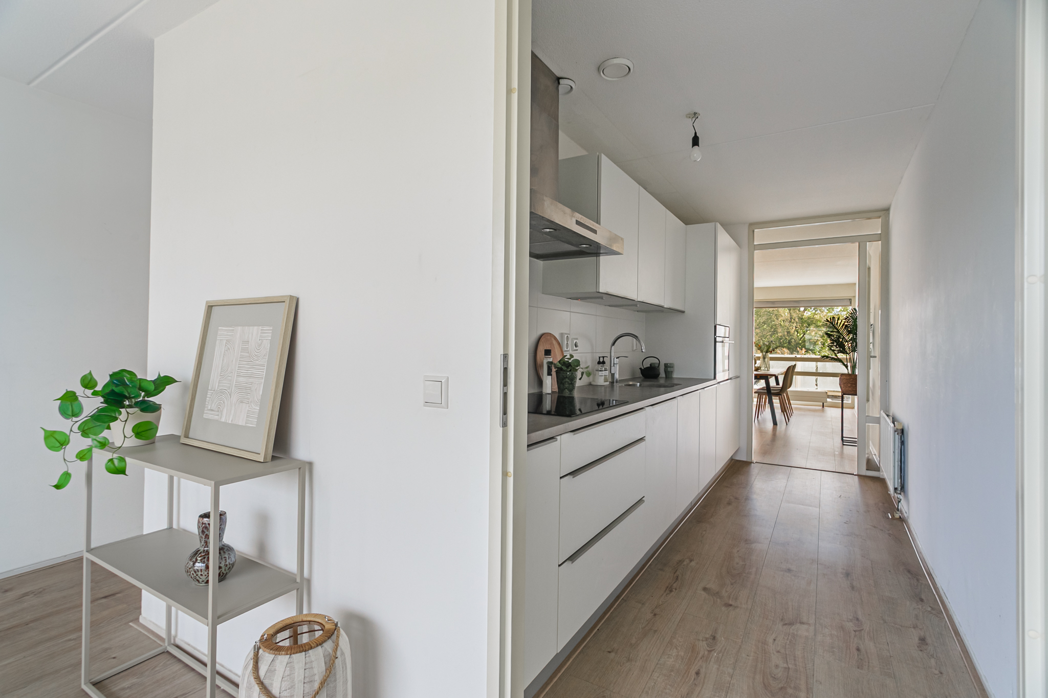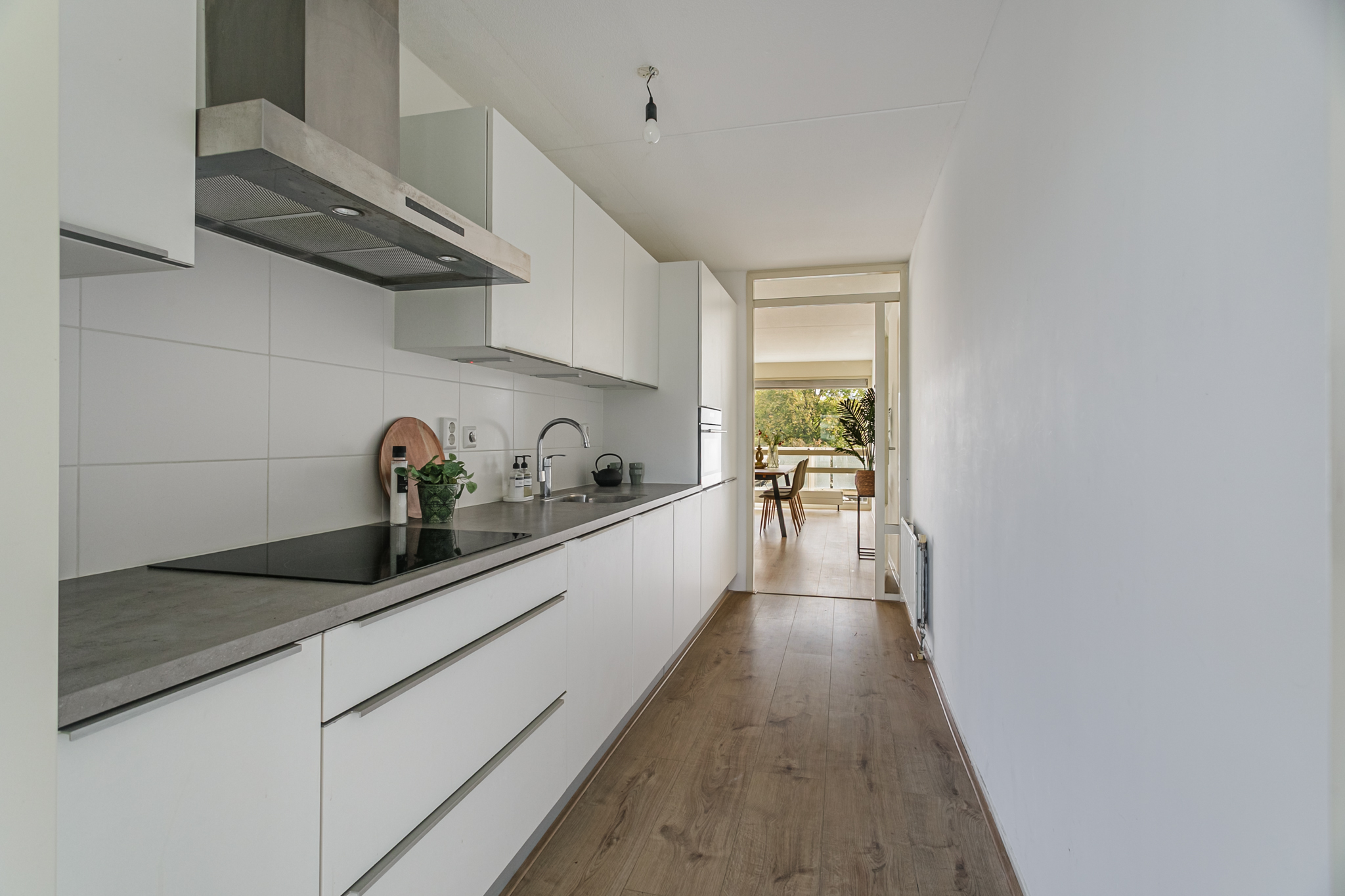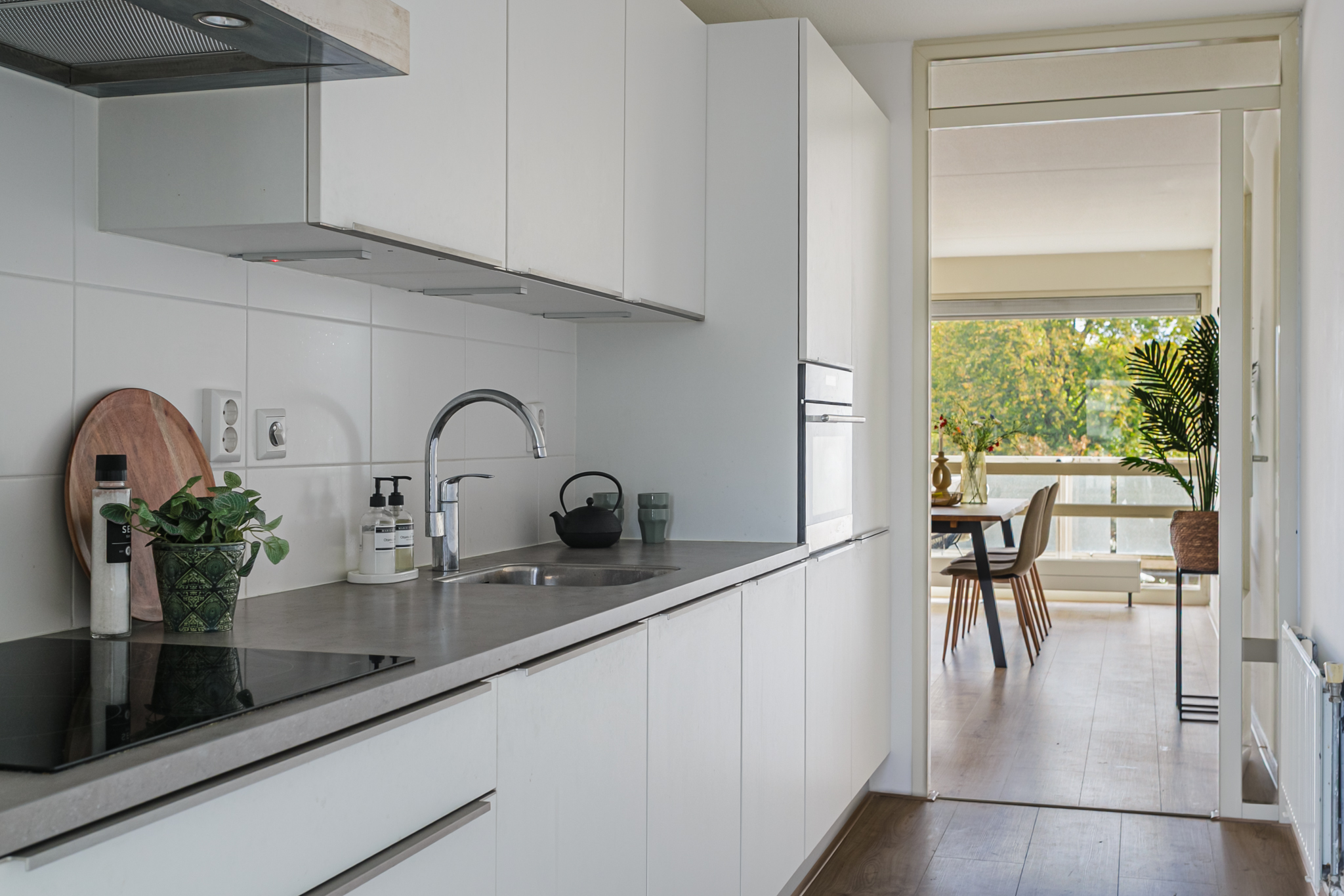 De nette keuken is voorzien van diverse inbouwapparatuur en biedt voldoende kastruimte en werkoppervlak. Vanuit de keuken loop je door naar de royale woonkamer en eetkamer. Dankzij de grote raampartijen geniet je hier van veel daglicht en heb je directe toegang tot het balkon op het zuiden — een heerlijke plek om in alle rust van de zon te genieten, met vrij uitzicht over de groene en rustige omgeving.