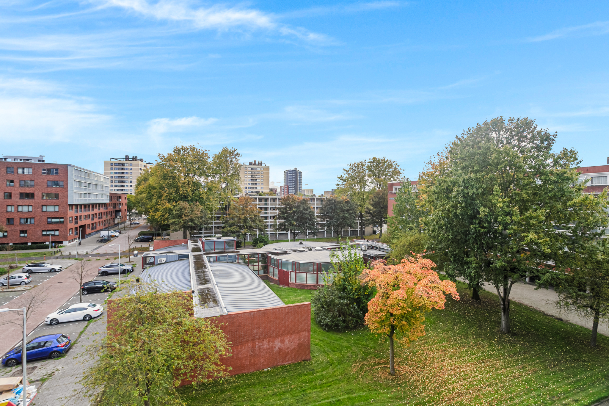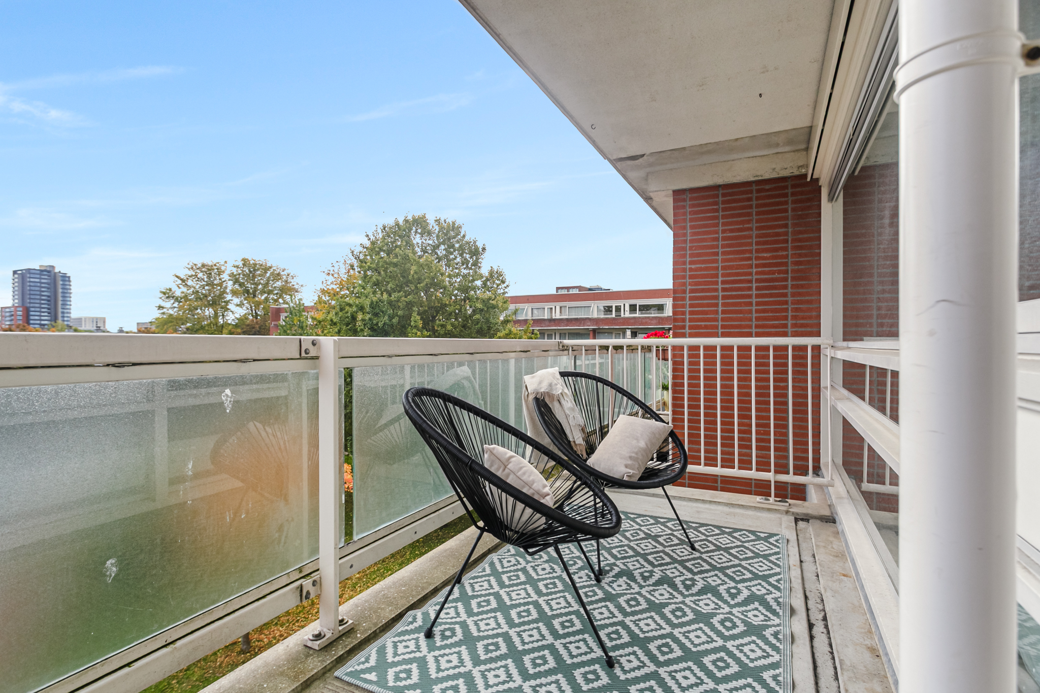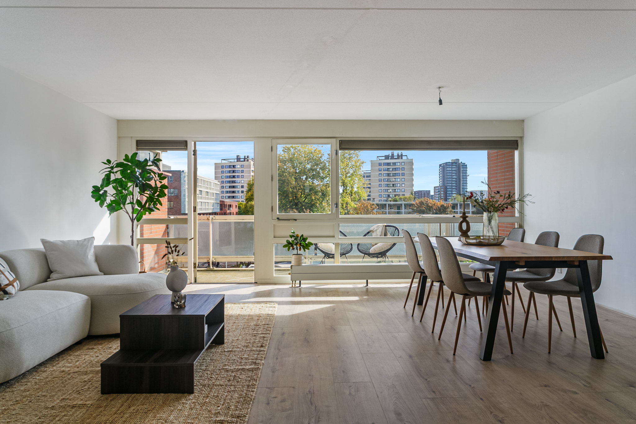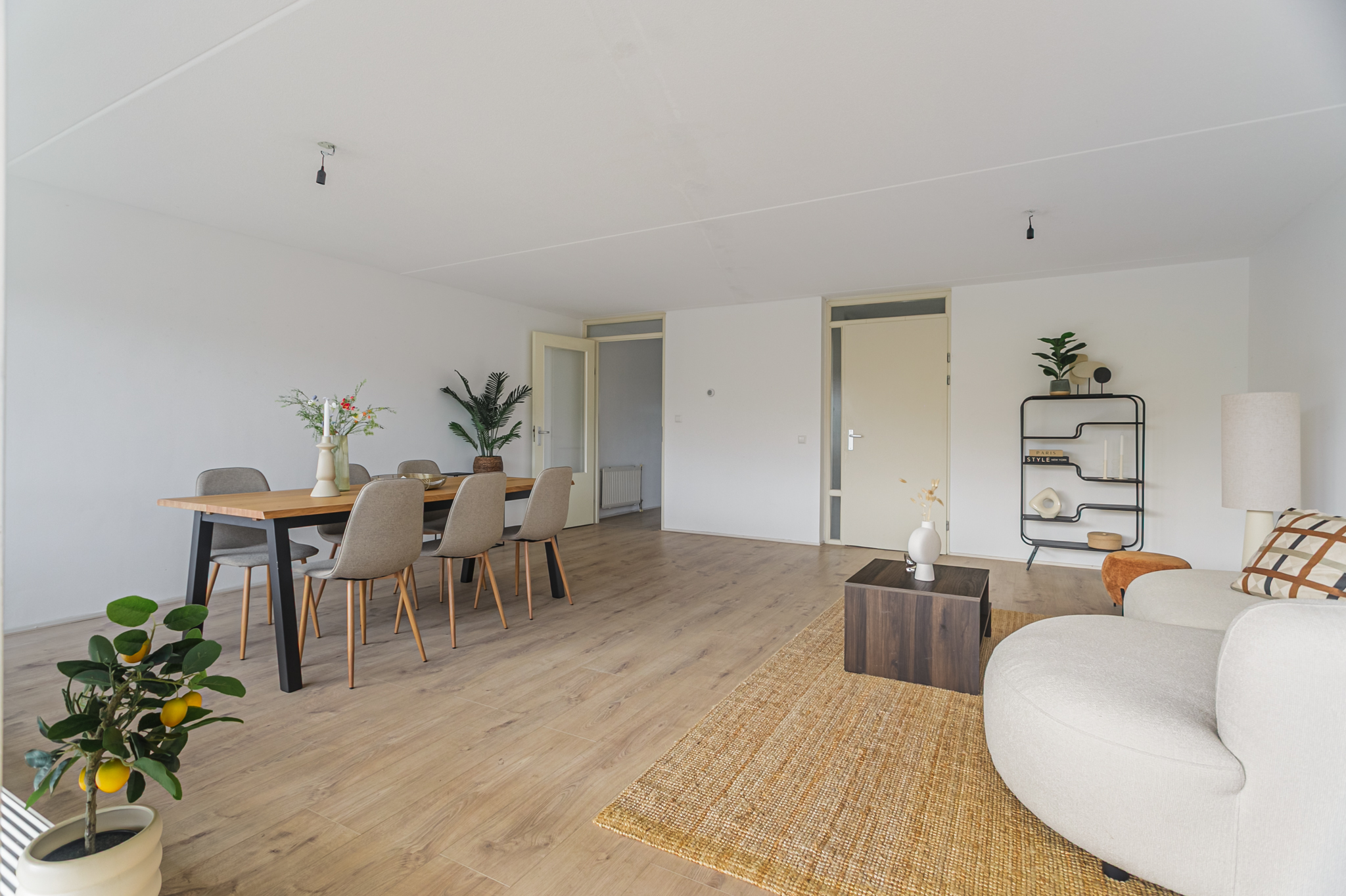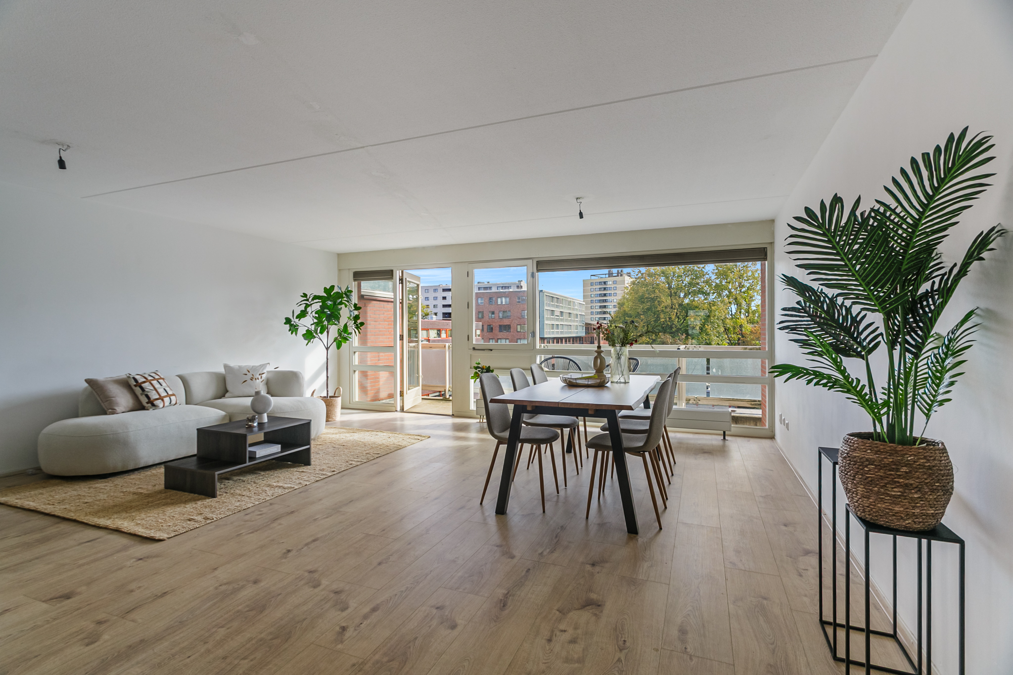 De nette keuken is voorzien van diverse inbouwapparatuur en biedt voldoende kastruimte en werkoppervlak. Vanuit de keuken loop je door naar de royale woonkamer en eetkamer. Dankzij de grote raampartijen geniet je hier van veel daglicht en heb je directe toegang tot het balkon op het zuiden — een heerlijke plek om in alle rust van de zon te genieten, met vrij uitzicht over de groene en rustige omgeving.