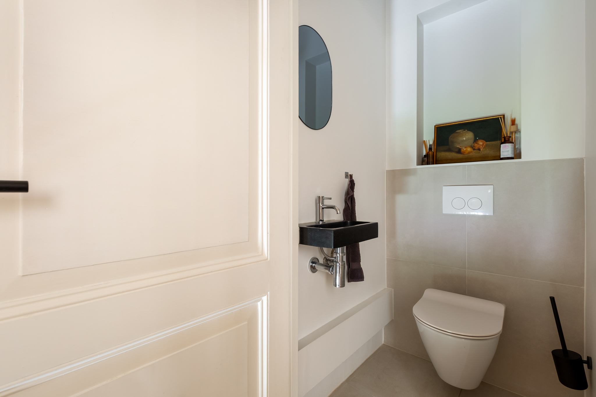 Indeling: Begane grond: Via een eigen entree op de begane grond betreed je de woning. De hal geeft toegang tot een interne trapopgang die je naar de woonverdiepingen leidt. Eerste verdieping: Hier bevindt zich de riante leefruimte met aan de achterzijde een lichte woonkamer, voorzien van openslaande deuren naar het ruime balkon. Aan de voorzijde met het Franse balkon op het zuiden, ligt de eetkamer met open keuken, uitgerust met diverse inbouwapparatuur en centraal kookeiland. Op deze verdieping is tevens een separaat toilet met fonteintje en een ruime garderobekast aanwezig.