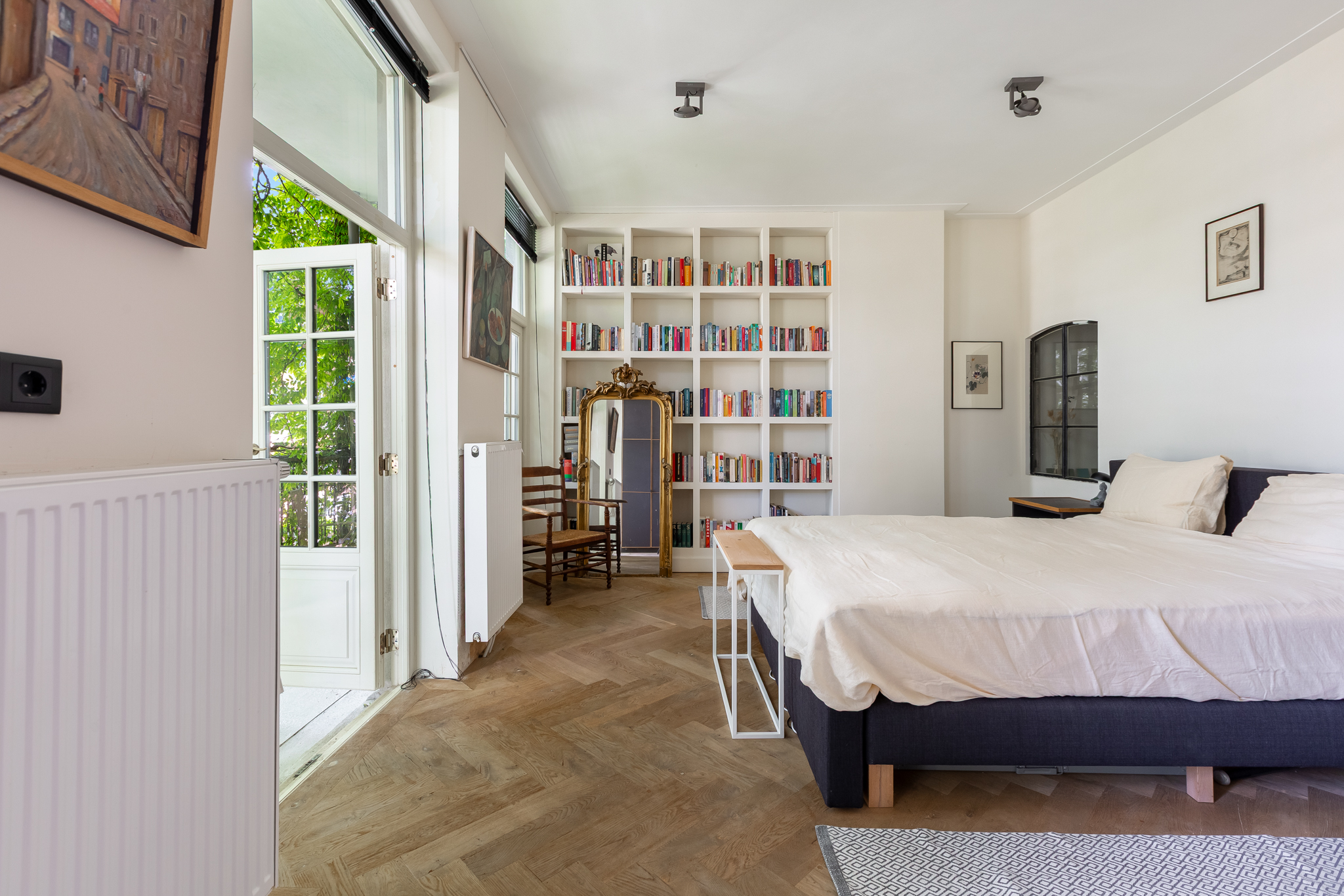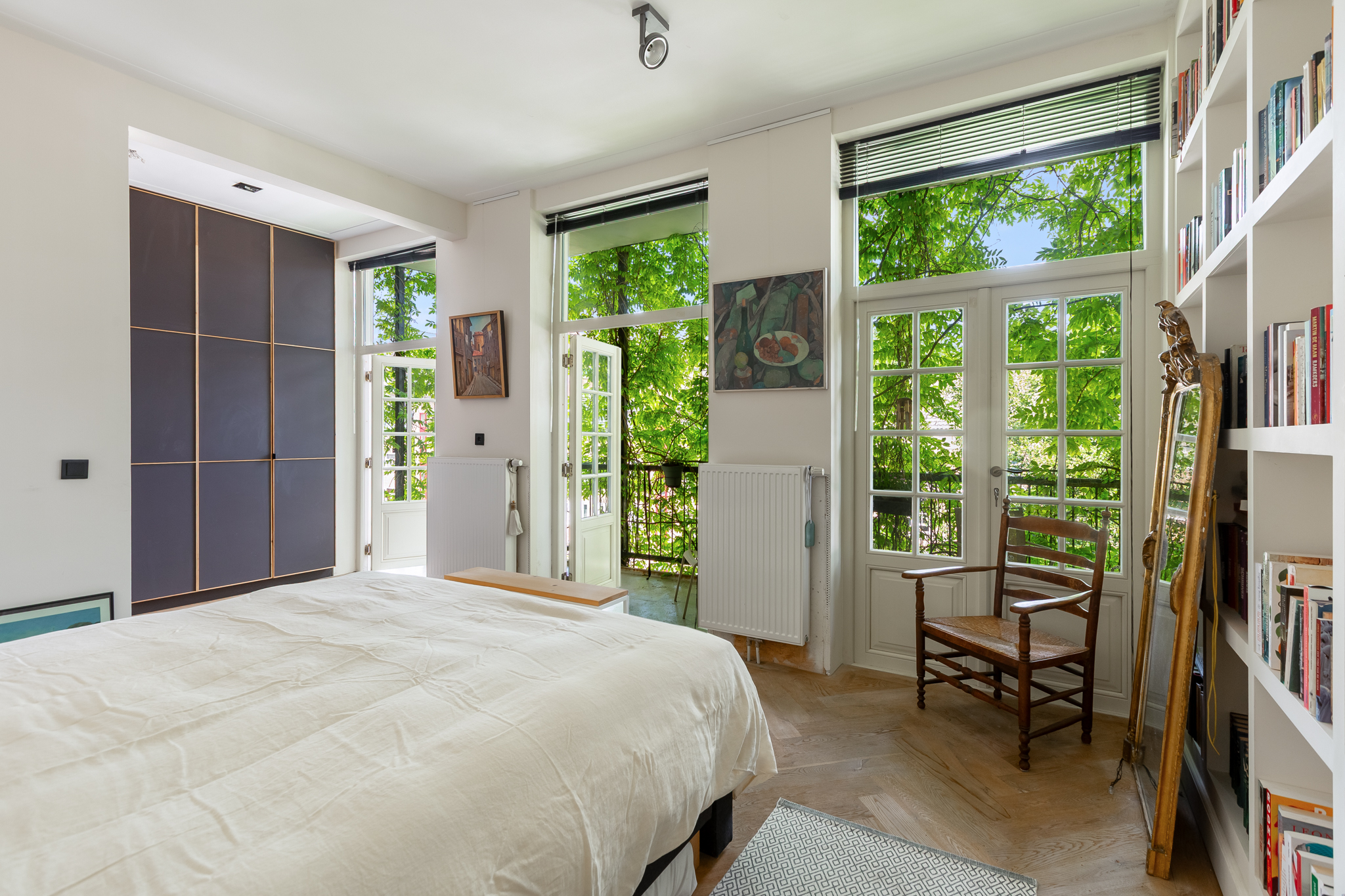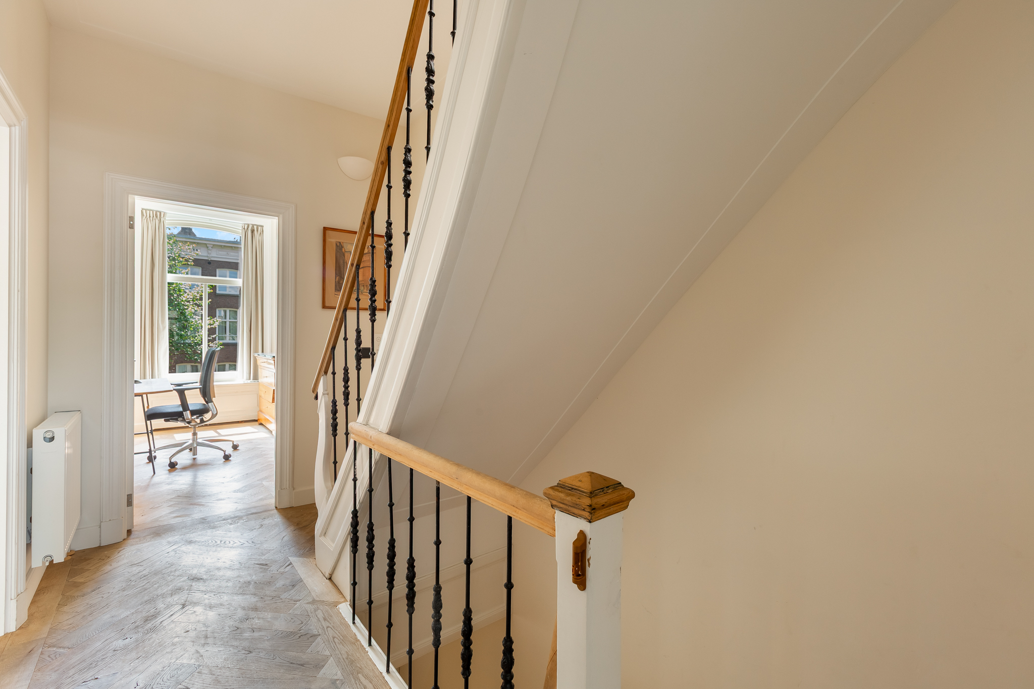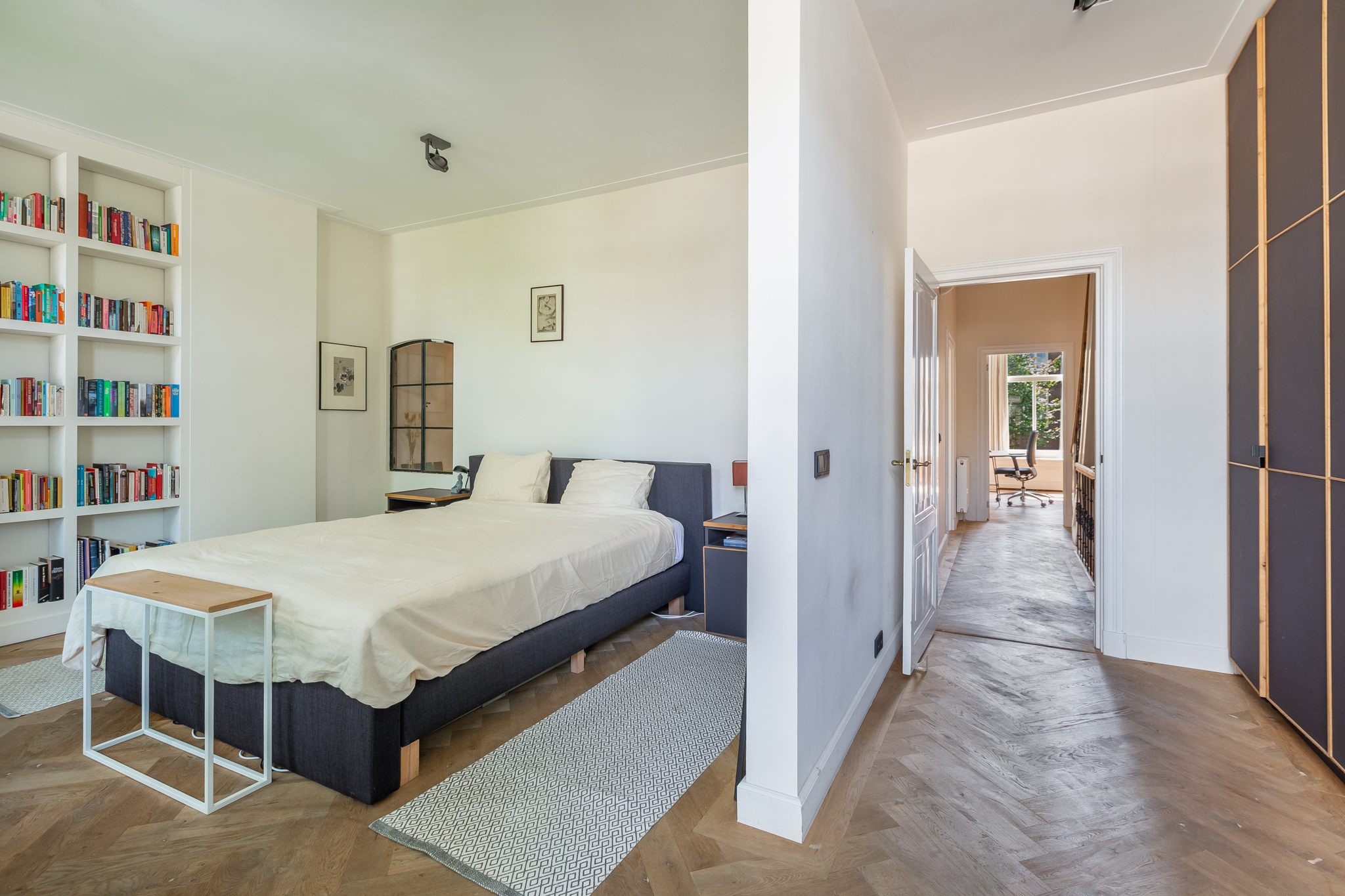 Tweede verdieping: Deze verdieping telt drie slaapkamers, allen goed van formaat. De eerste slaapkamer met over de hele breedte inbouwkasten ligt aan de achterzijde en heeft toegang tot een derde balkon. De badkamer is centraal gesitueerd en beschikt over een toilet, een ligbad, aparte douche, een wastafel en voldoende ruimte. Aan de voorkant is een ruime slaapkamer met twee grote ramen. Daarnaast is een kleinere slaapkamer, die ook geschikt is als werkkamer.
