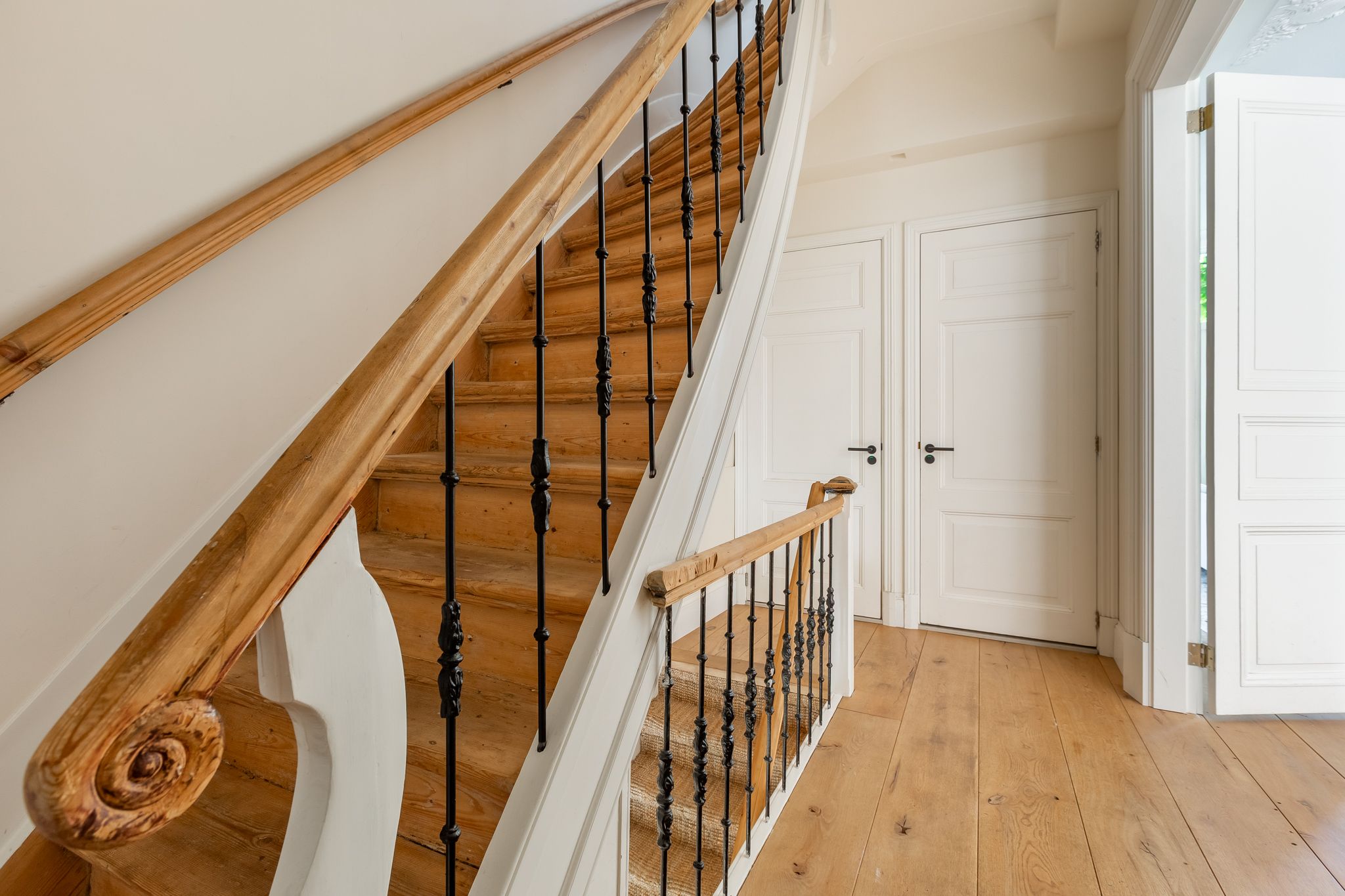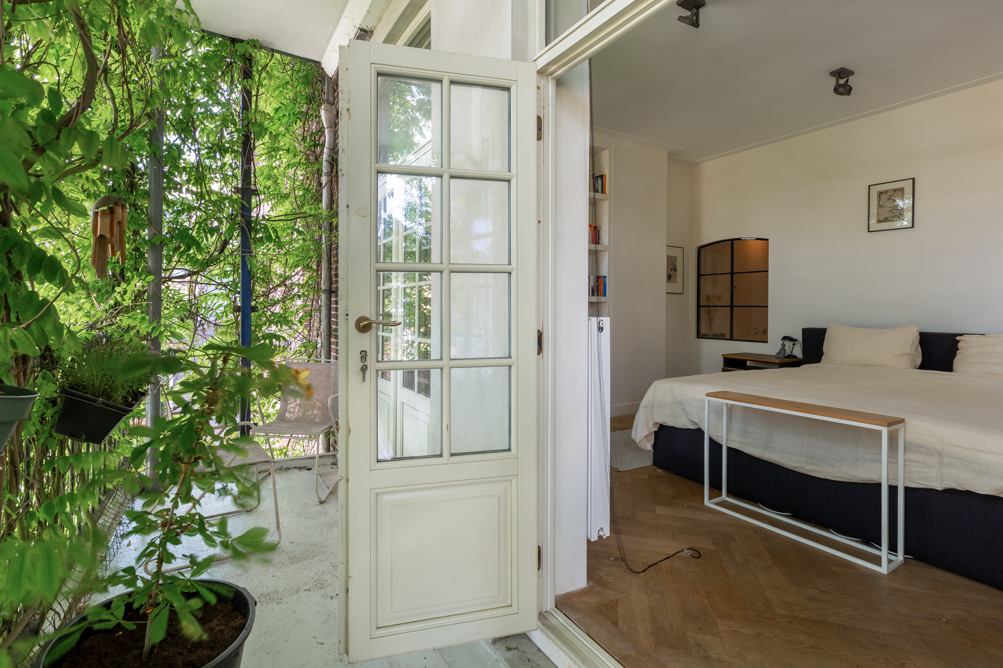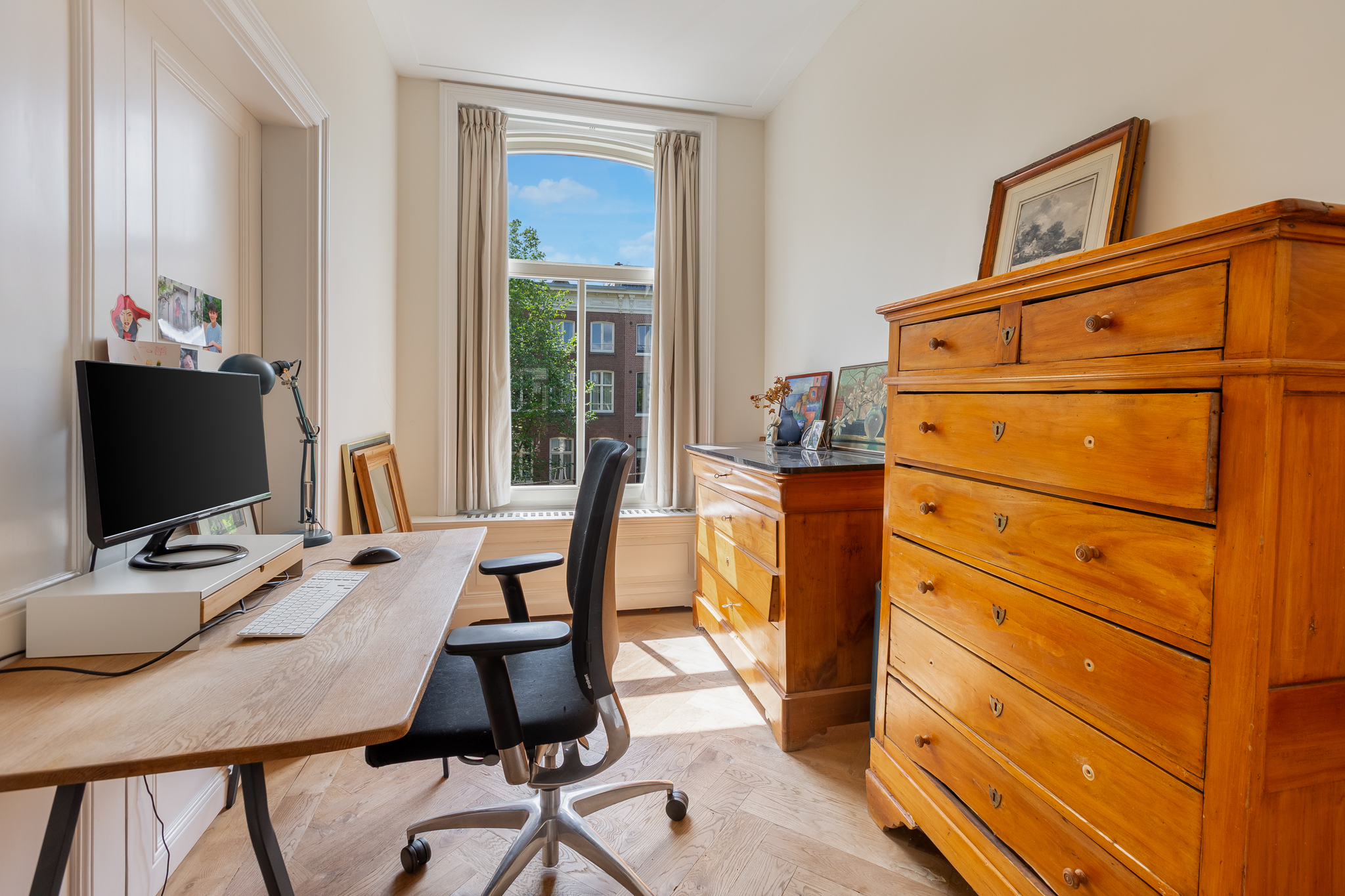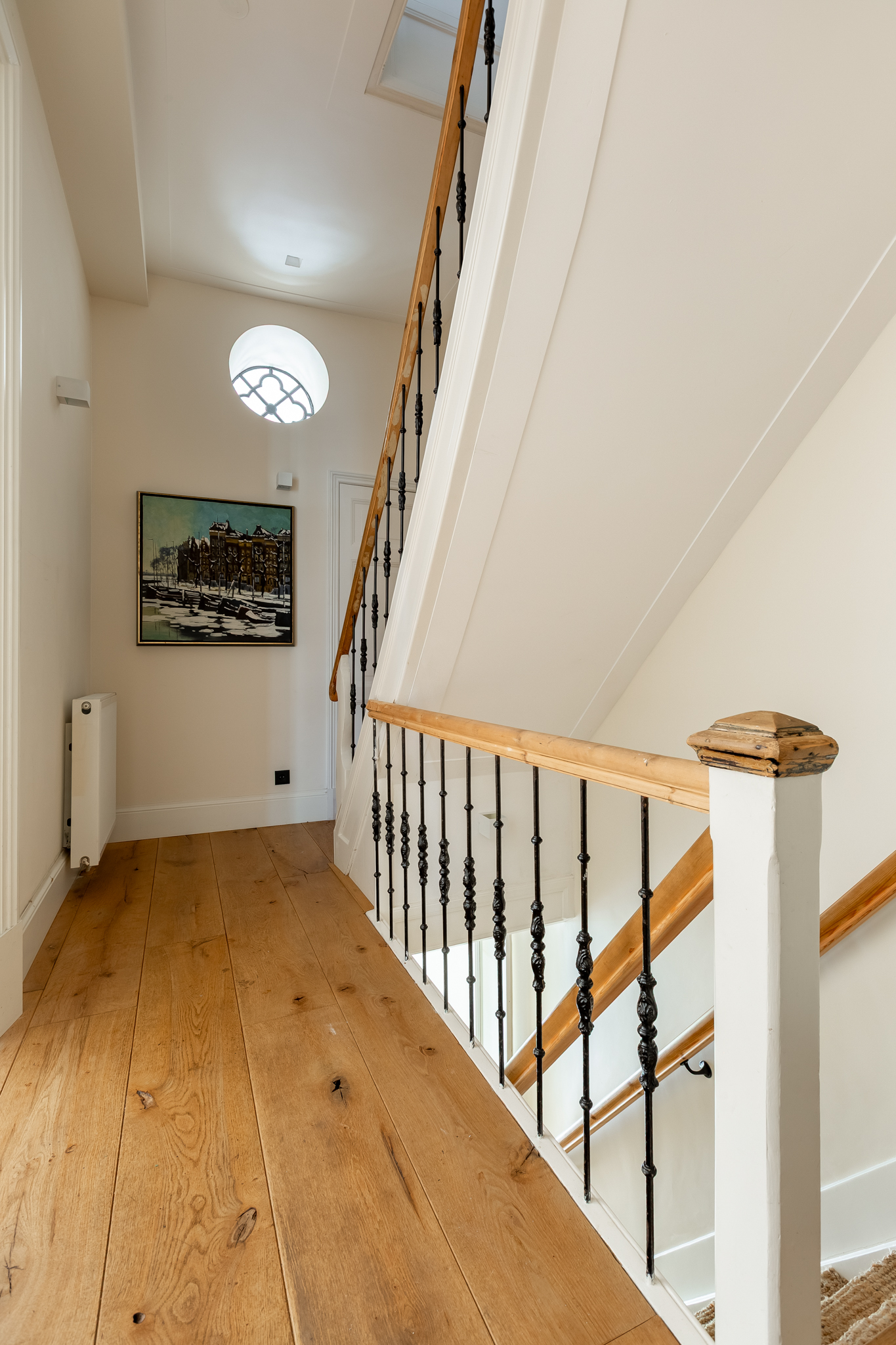 Tweede verdieping: Deze verdieping telt drie slaapkamers, allen goed van formaat. De eerste slaapkamer met over de hele breedte inbouwkasten ligt aan de achterzijde en heeft toegang tot een derde balkon. De badkamer is centraal gesitueerd en beschikt over een toilet, een ligbad, aparte douche, een wastafel en voldoende ruimte. Aan de voorkant is een ruime slaapkamer met twee grote ramen. Daarnaast is een kleinere slaapkamer, die ook geschikt is als werkkamer.