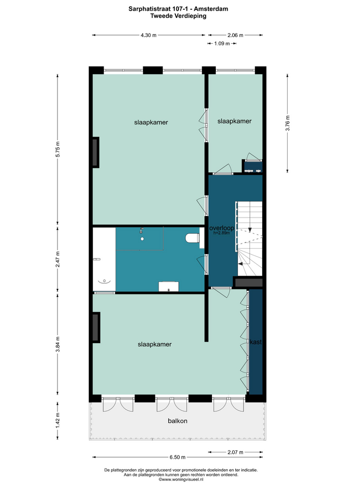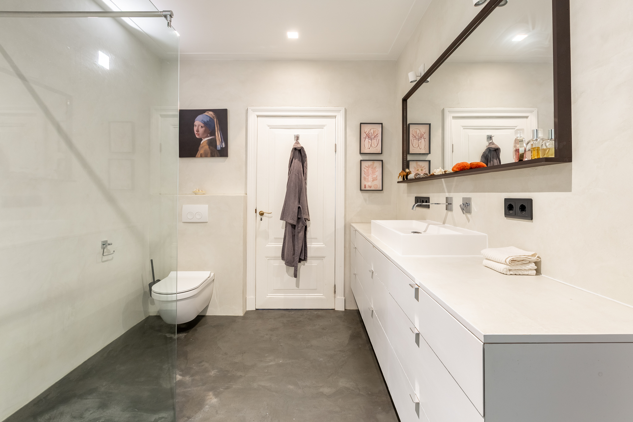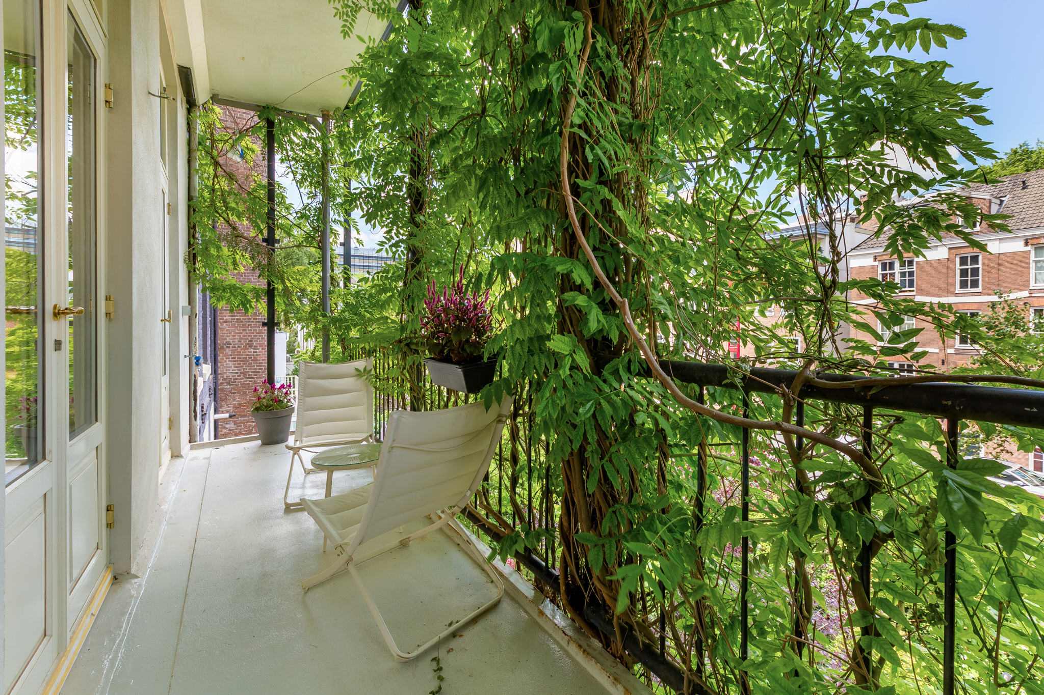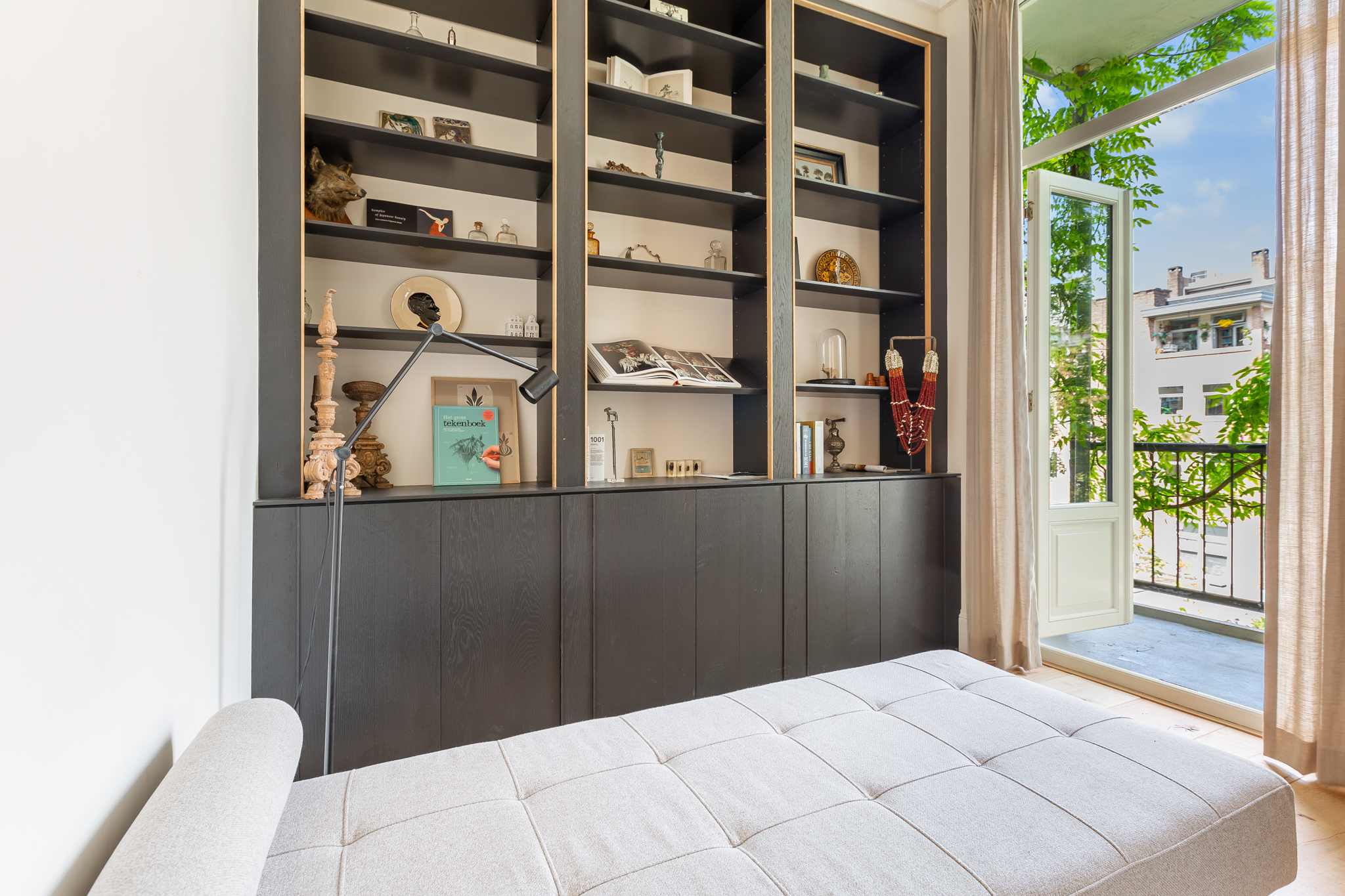 Tweede verdieping: Deze verdieping telt drie slaapkamers, allen goed van formaat. De eerste slaapkamer met over de hele breedte inbouwkasten ligt aan de achterzijde en heeft toegang tot een derde balkon. De badkamer is centraal gesitueerd en beschikt over een toilet, een ligbad, aparte douche, een wastafel en voldoende ruimte. Aan de voorkant is een ruime slaapkamer met twee grote ramen. Daarnaast is een kleinere slaapkamer, die ook geschikt is als werkkamer.