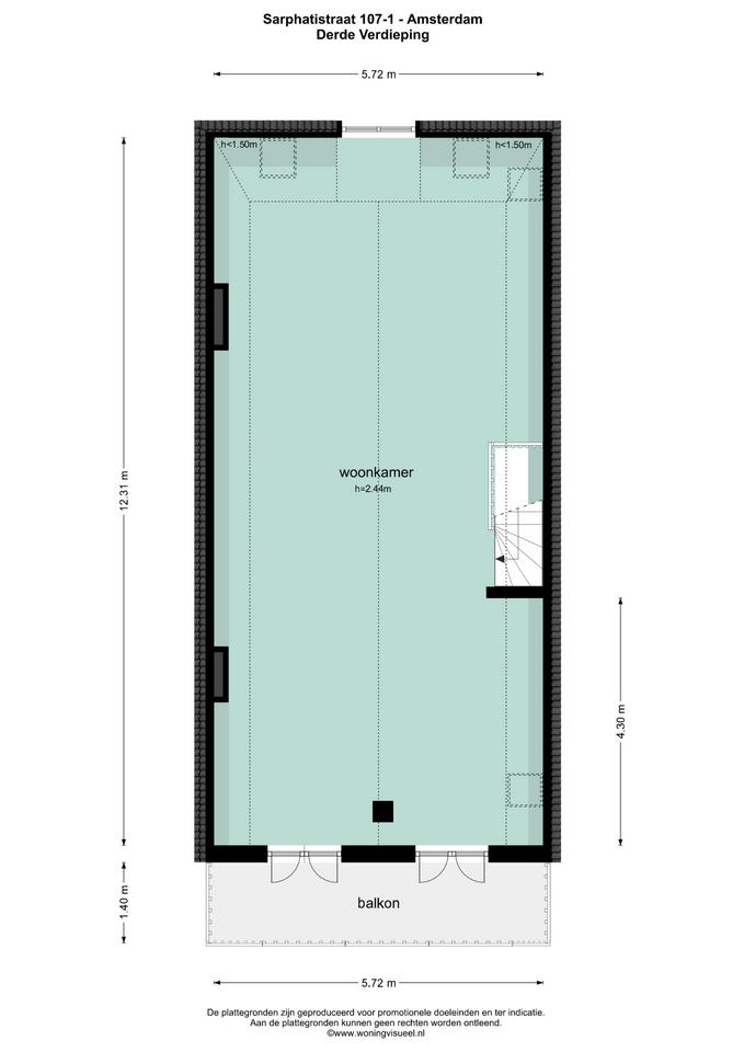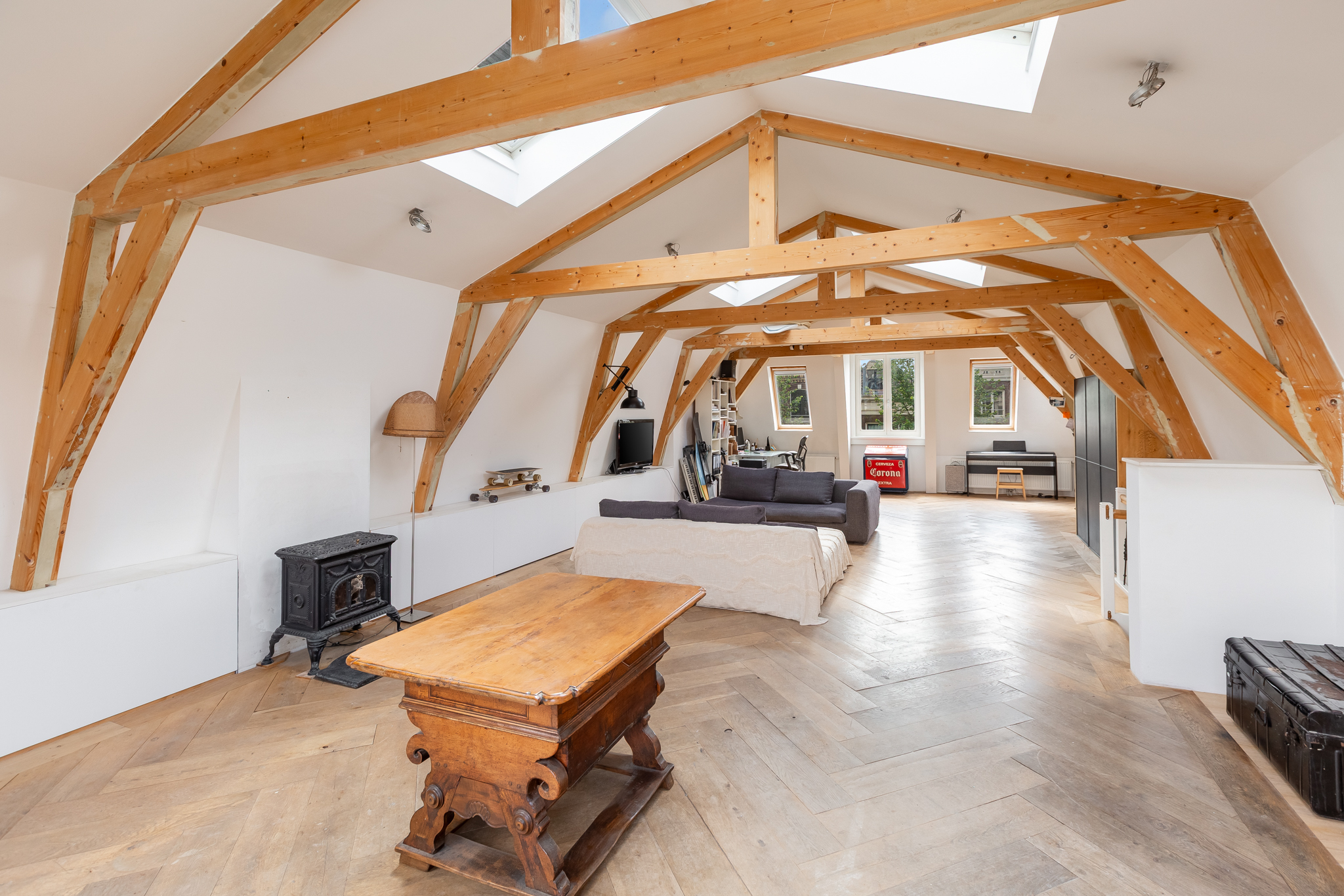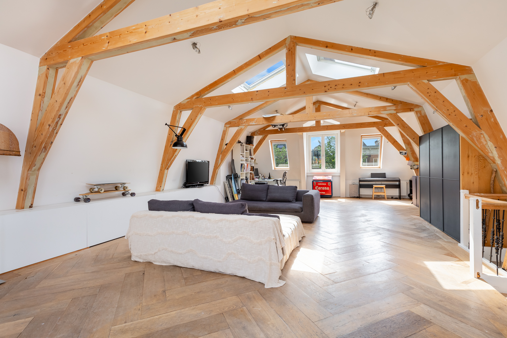 Derde verdieping: Op de bovenste verdieping vind je de loft. Dit is een multifunctionele ruimte (ideaal als thuiswerkplek, yogazolder of om meer slaapkamers te creëren), met toegang tot het vierde balkon. Dankzij de grote openslaande deuren aan de achterzijde en de dakramen, de balken en de hoogte is dit een heerlijk lichte ruimte.