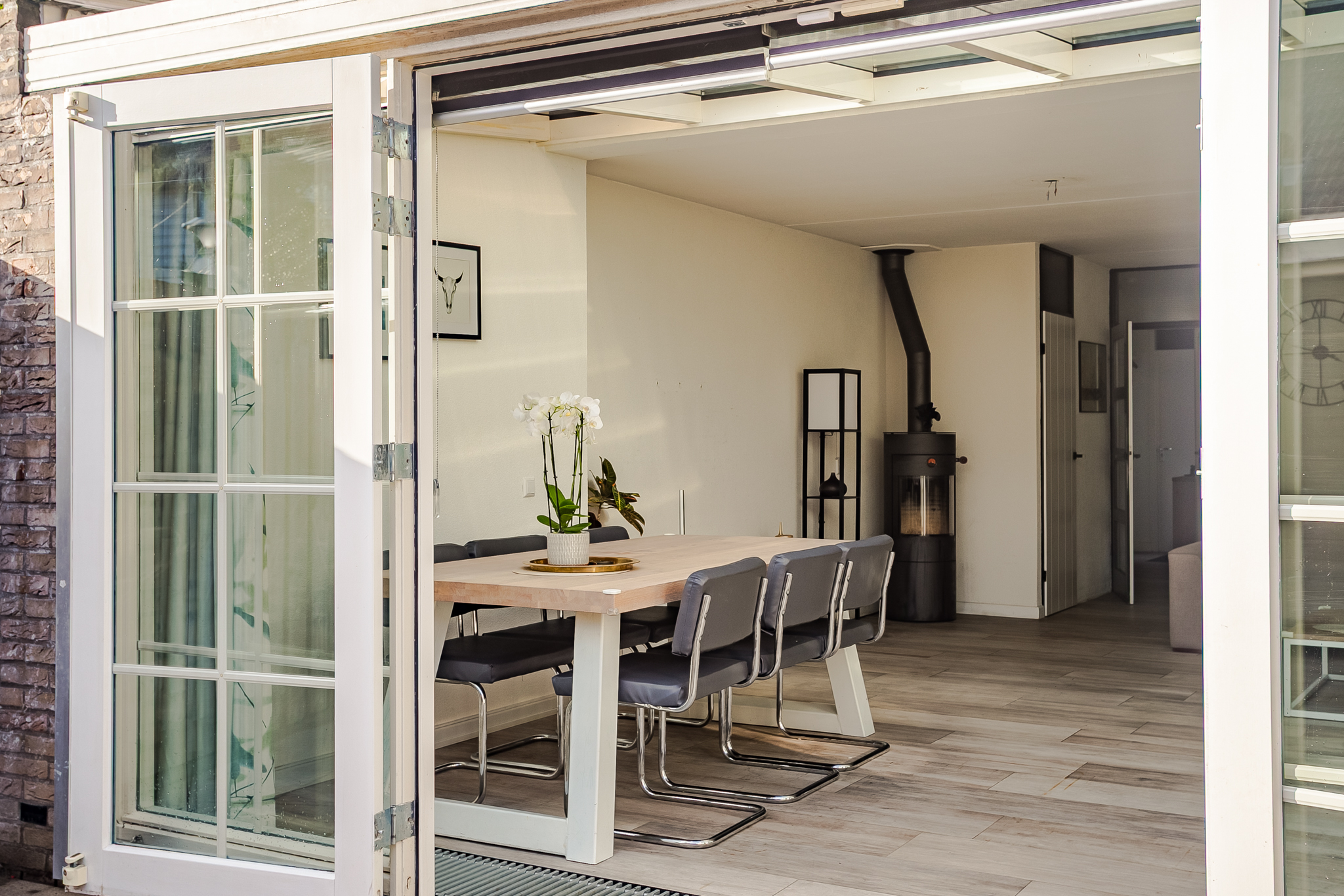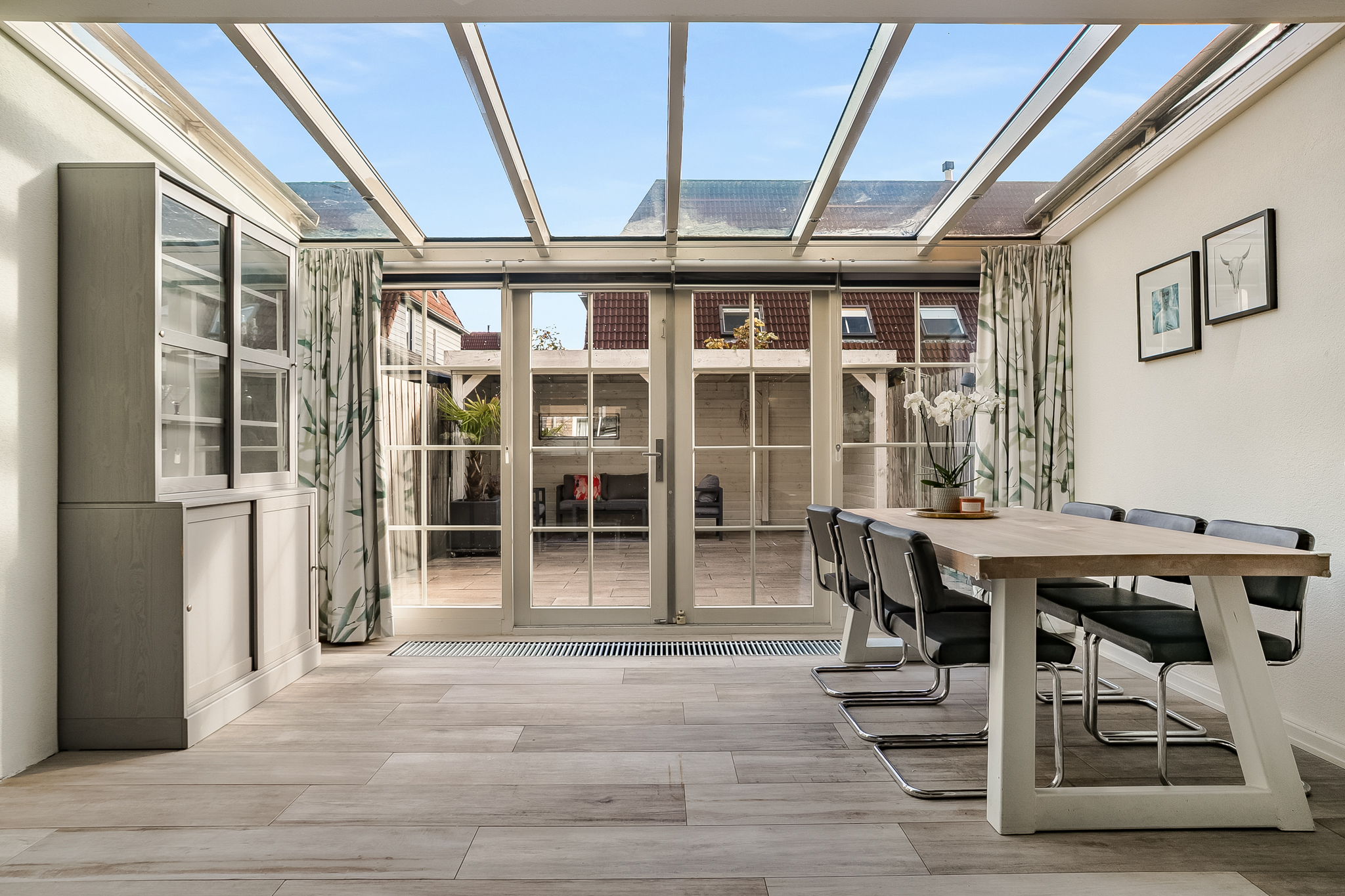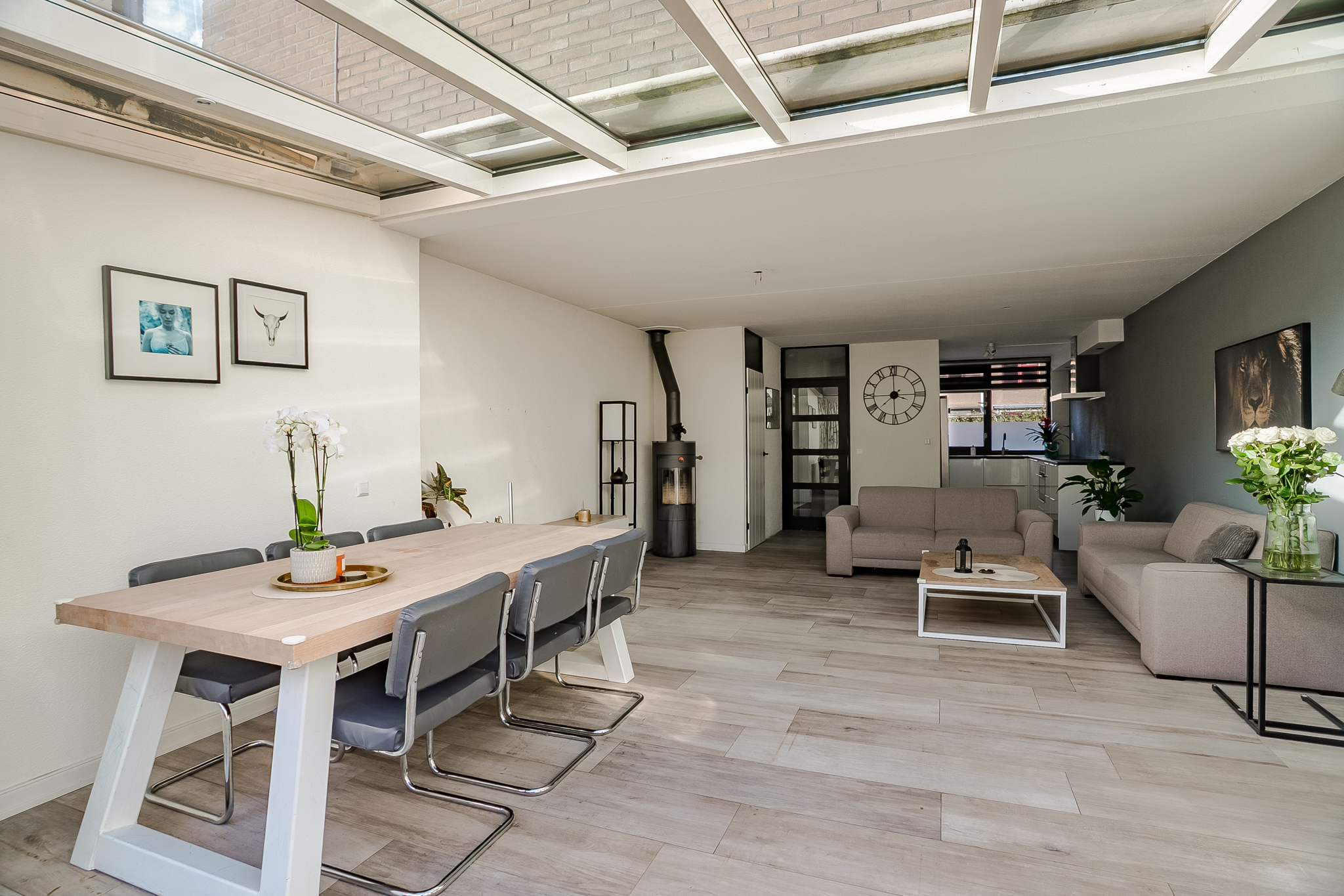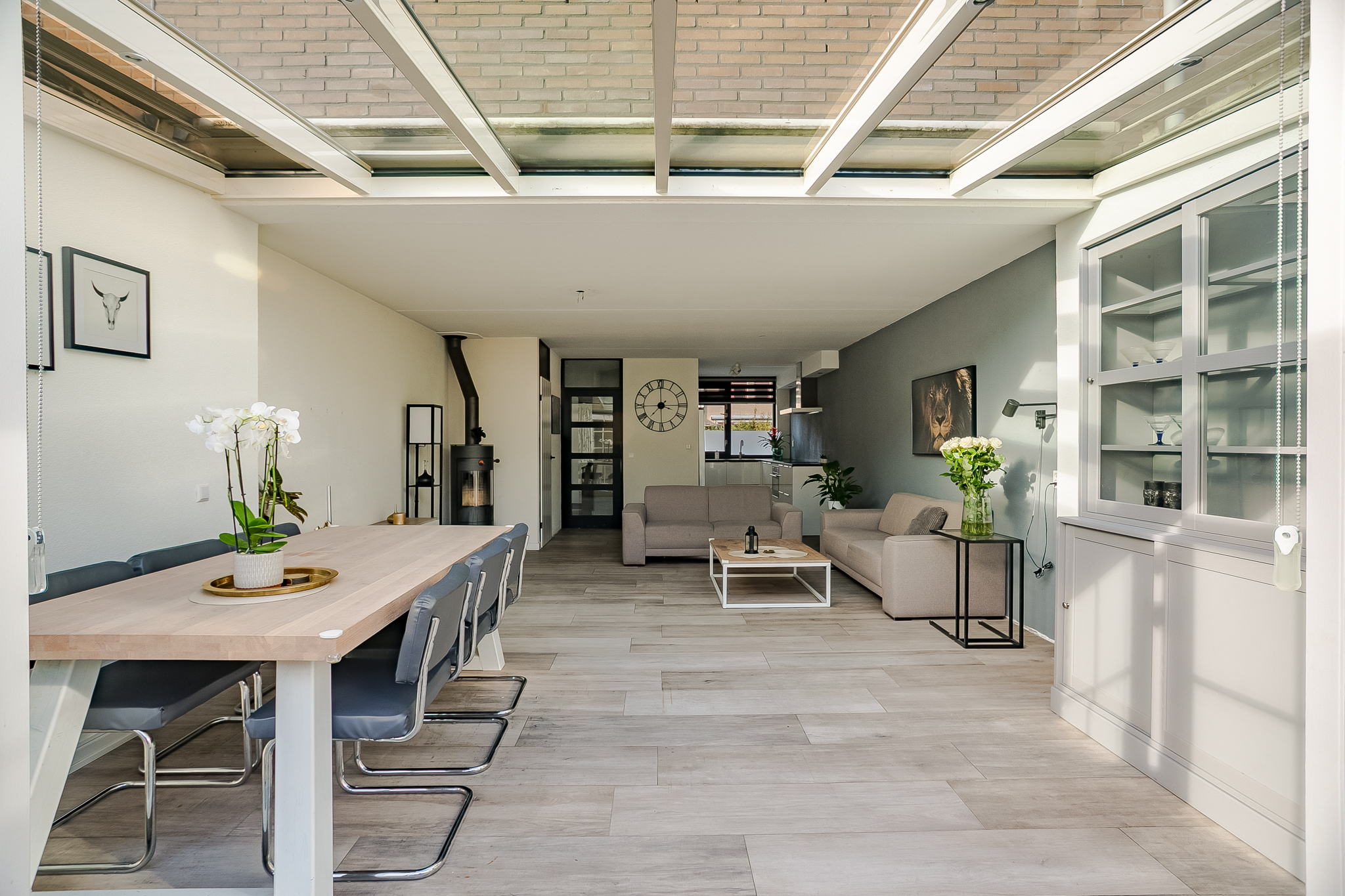 Dankzij de aangebouwde serre is de woonkamer een stuk ruimer en lichter geworden. De ligging op het zuiden zorgt ervoor dat het zonlicht tot diep naar binnen dringt, wat de kamer optisch nog groter maakt. Het zitgedeelte heeft een ruime opzet en het eetgedeelte is in de serre gesitueerd. Mooie elementen zijn de vloer- en wandafwerking en de houtkachel, vlak naast de inbouwkast onder de trap.