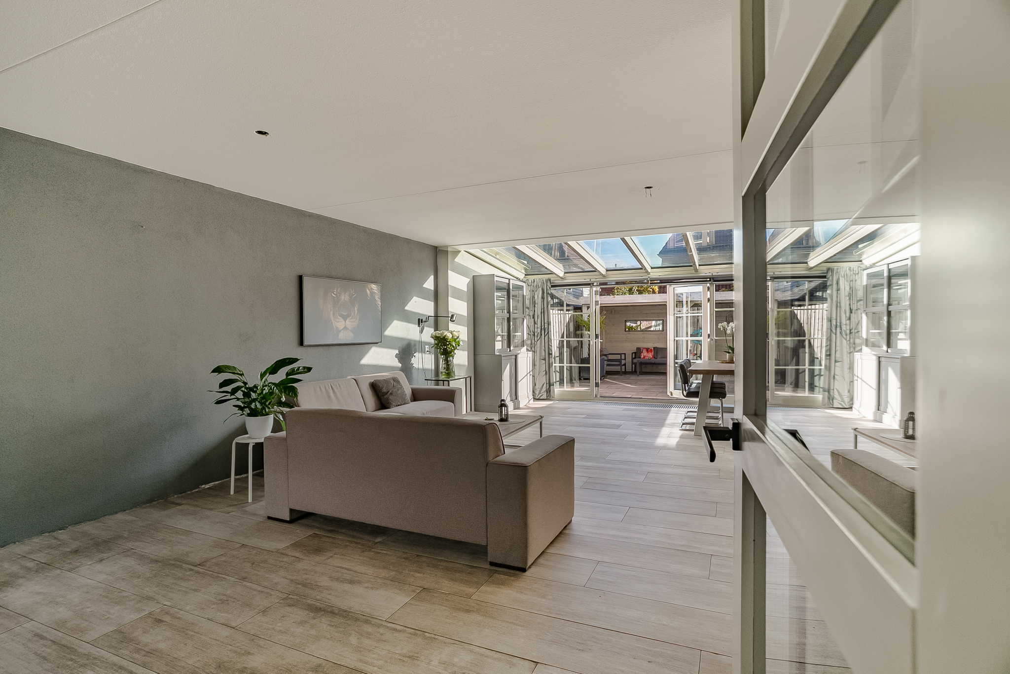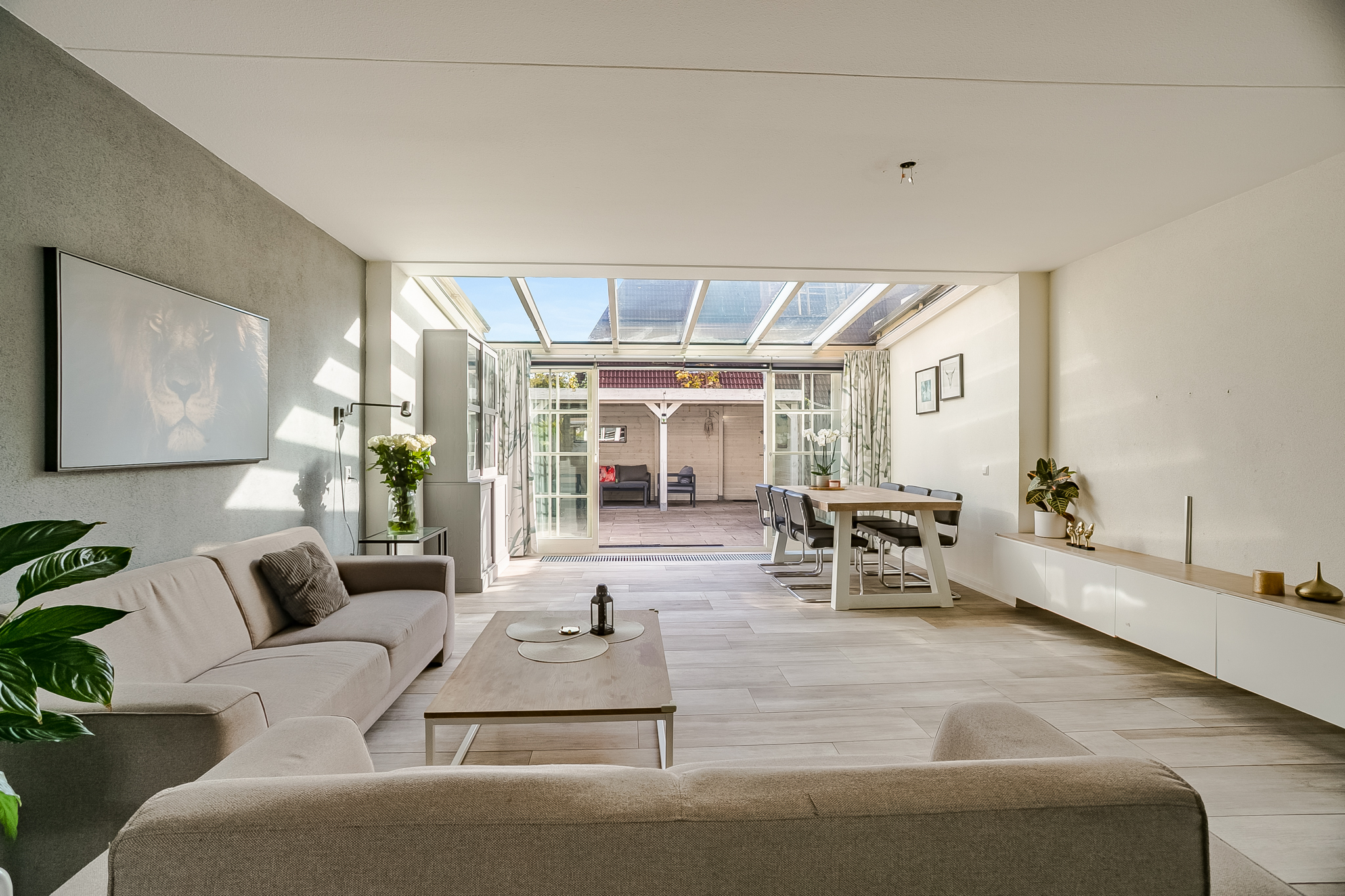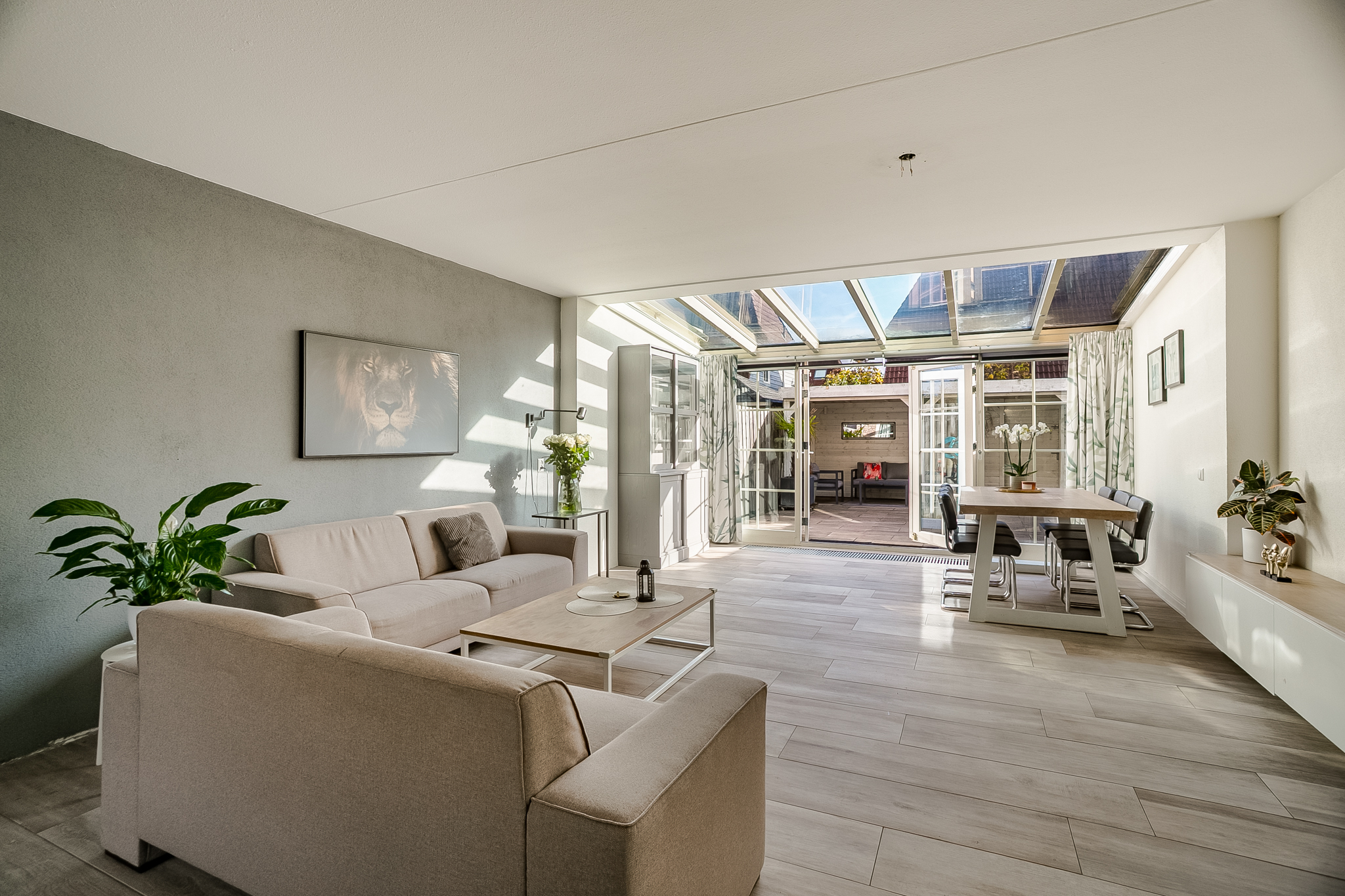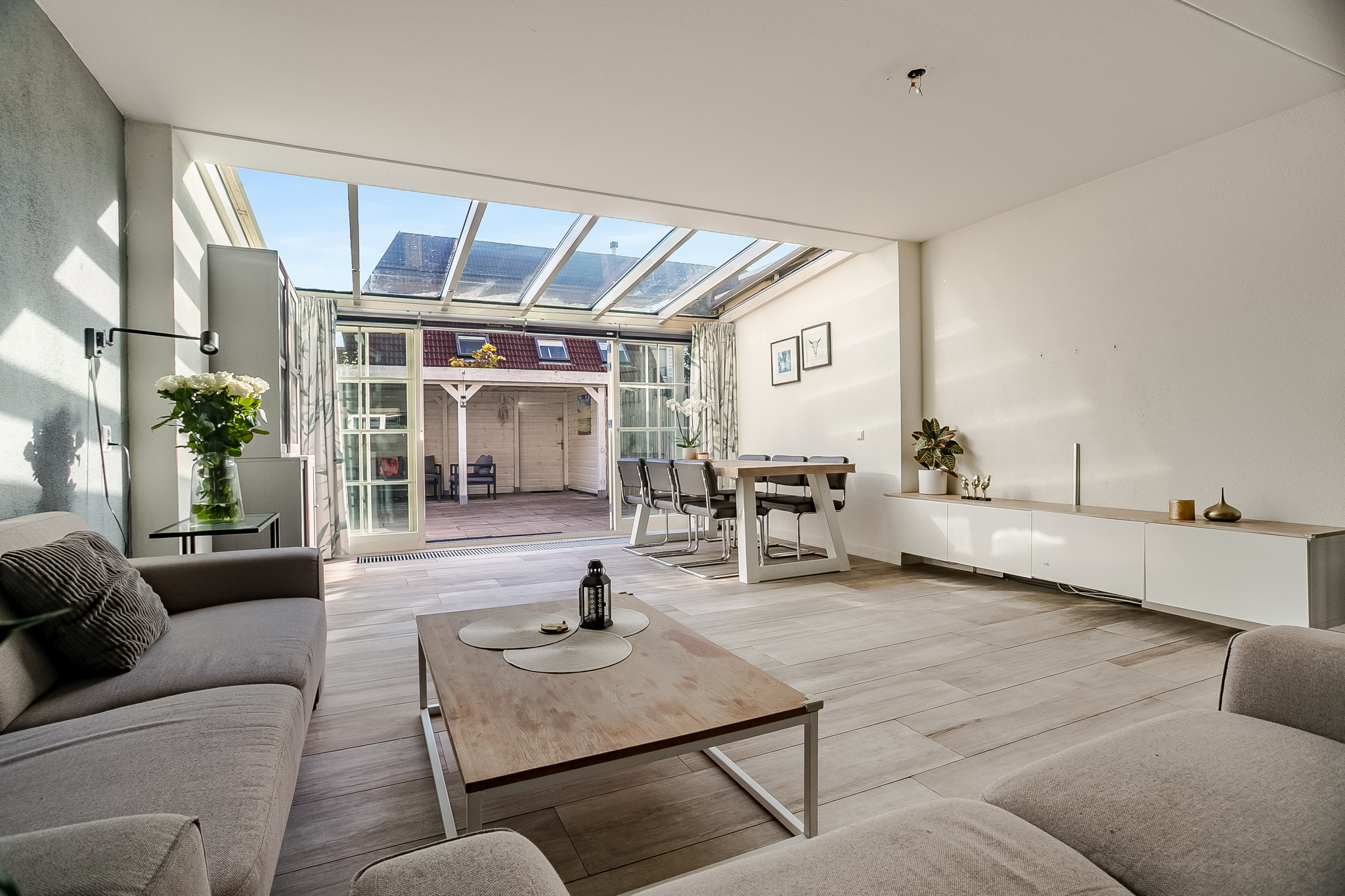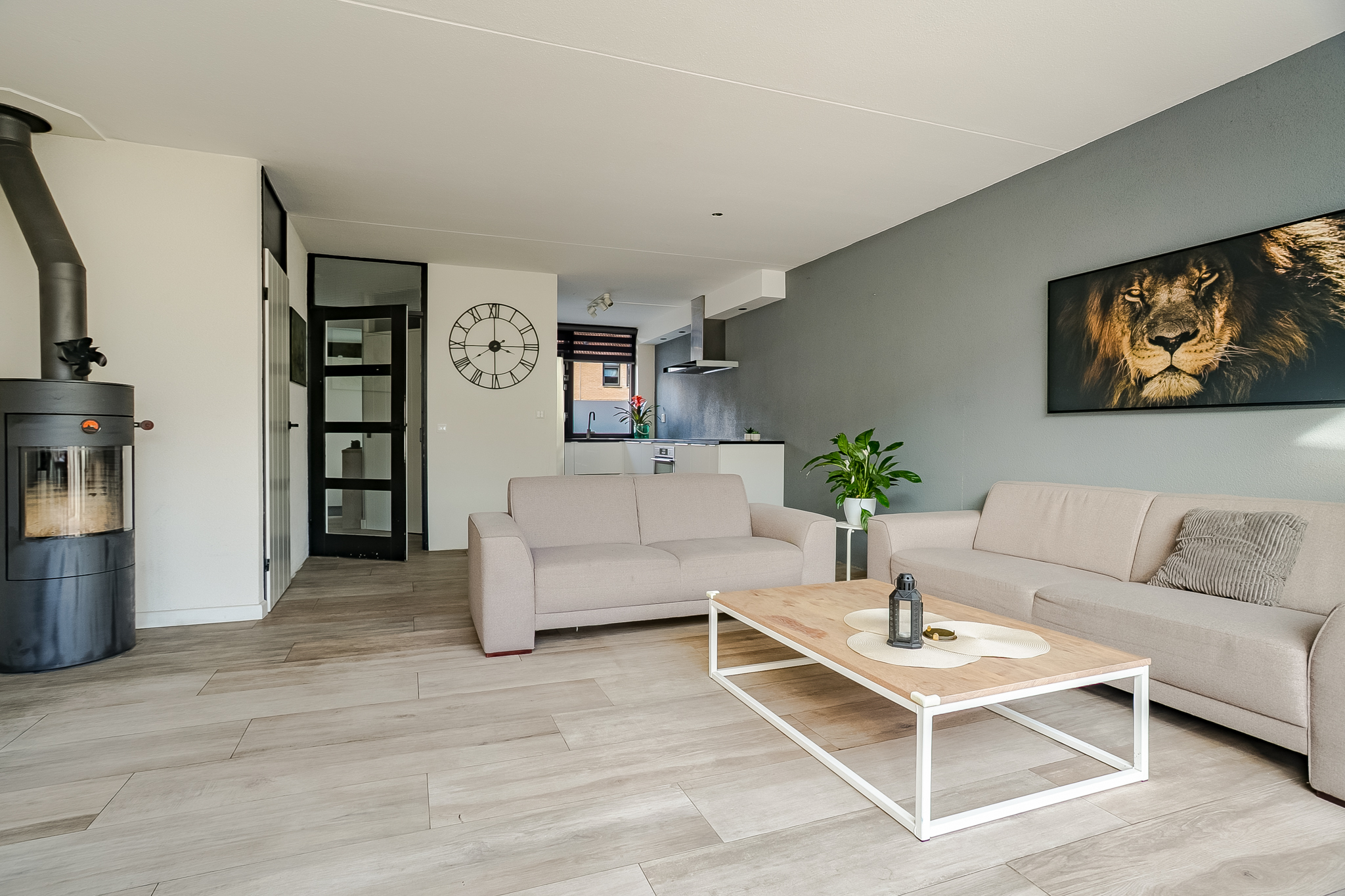 Dankzij de aangebouwde serre is de woonkamer een stuk ruimer en lichter geworden. De ligging op het zuiden zorgt ervoor dat het zonlicht tot diep naar binnen dringt, wat de kamer optisch nog groter maakt. Het zitgedeelte heeft een ruime opzet en het eetgedeelte is in de serre gesitueerd. Mooie elementen zijn de vloer- en wandafwerking en de houtkachel, vlak naast de inbouwkast onder de trap.