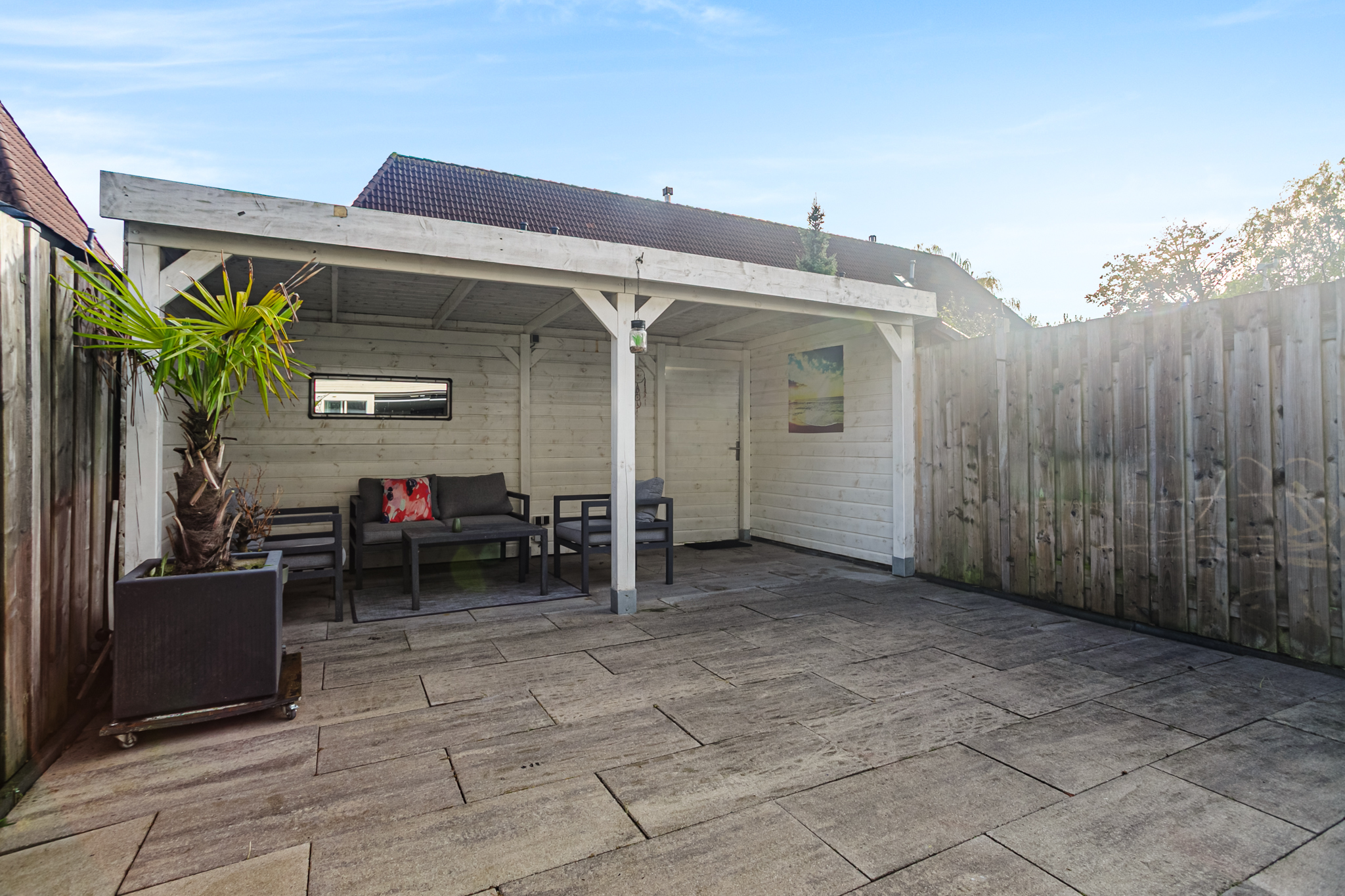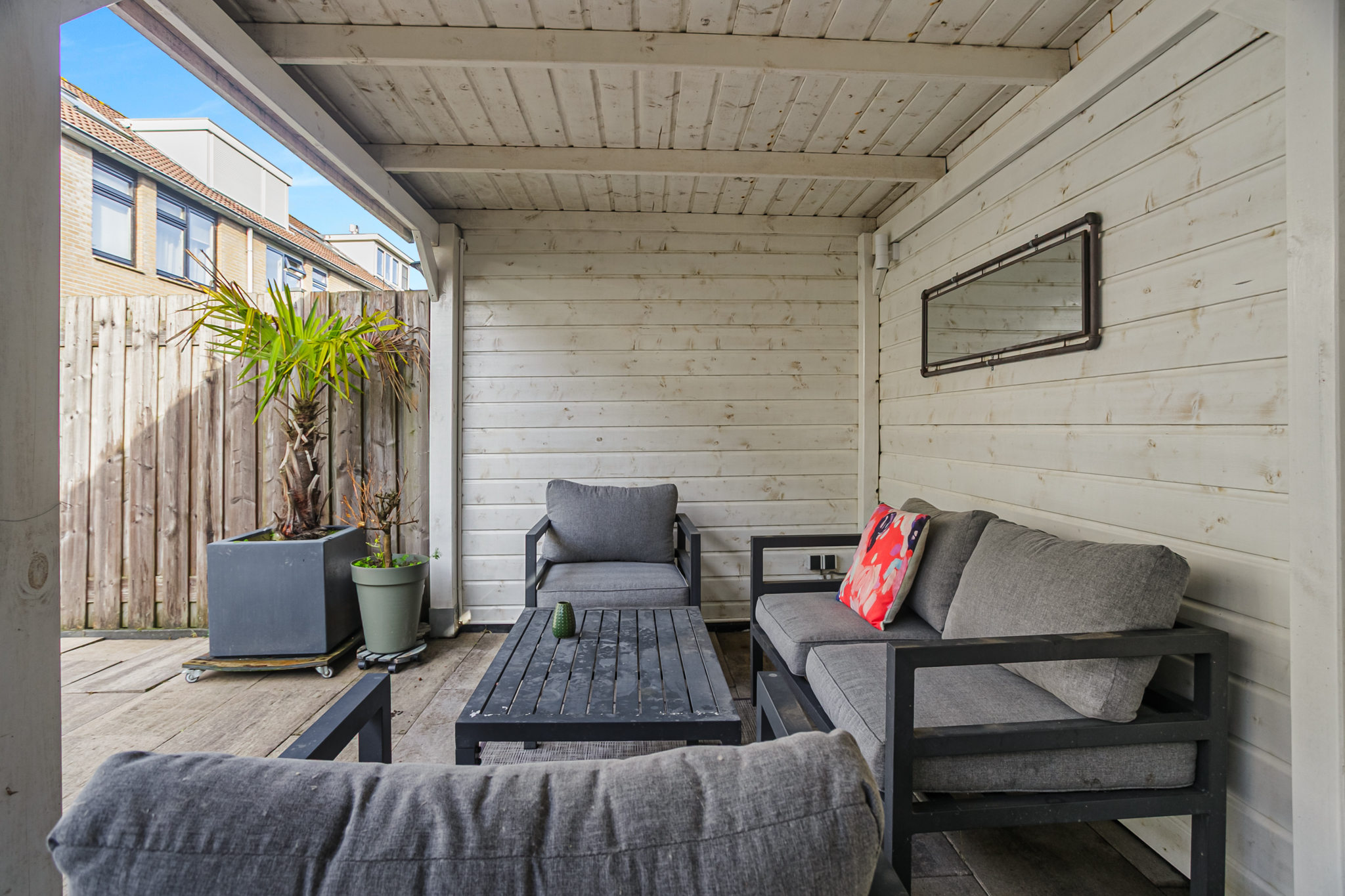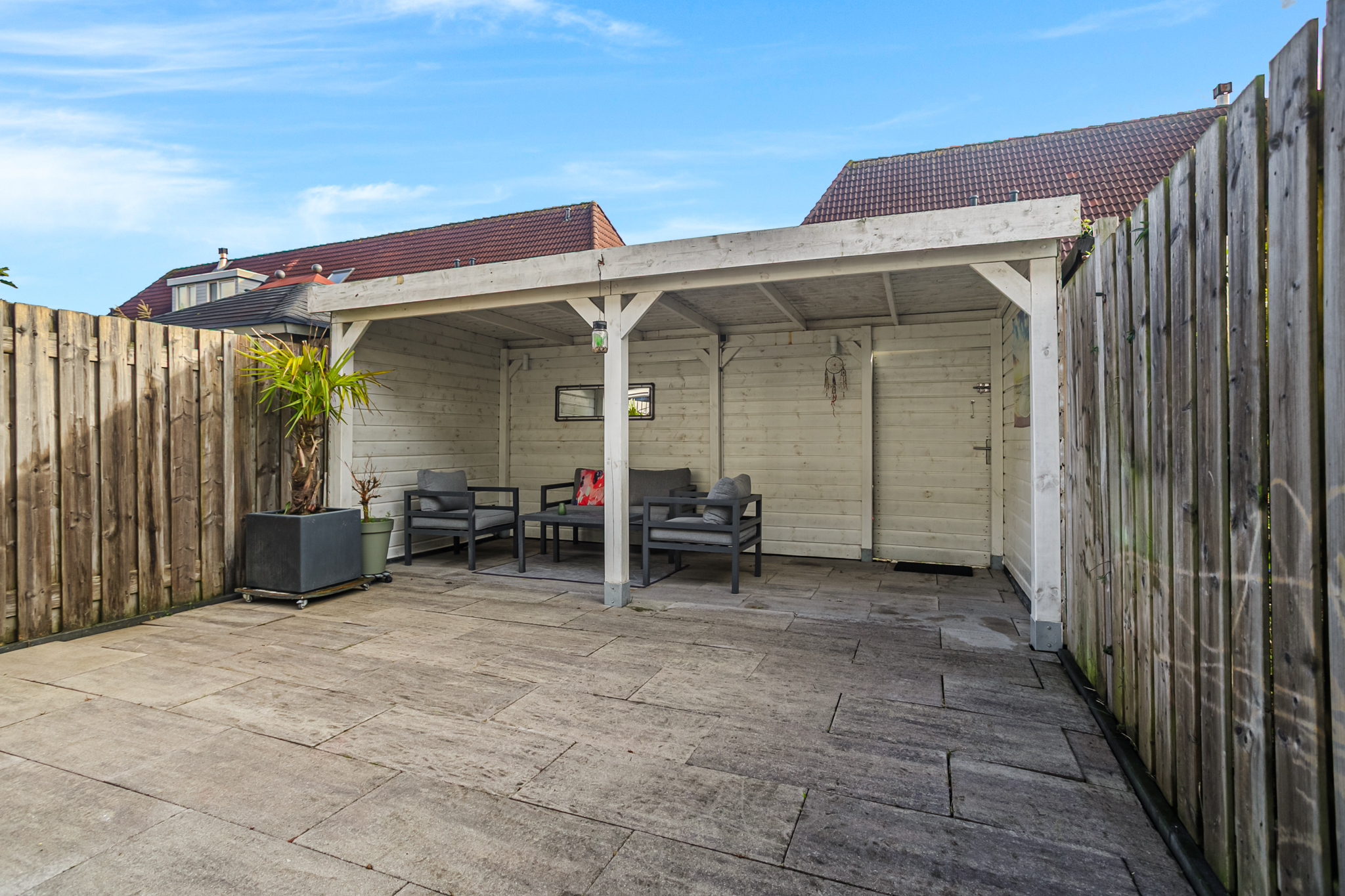 De voortuin is, samen met de buren, bestraat en als erfafscheiding is er een hoge plantenbak geplaatst. Vanuit de serre loop je de achtertuin in, gesitueerd op het zonnige zuiden. Hier zie je grote tuintegels, kunstgras en houten schuttingen waardoor het onderhoud minimaal is. Je kunt heerlijk in de zon zitten, maar ook beschut onder de grote veranda.