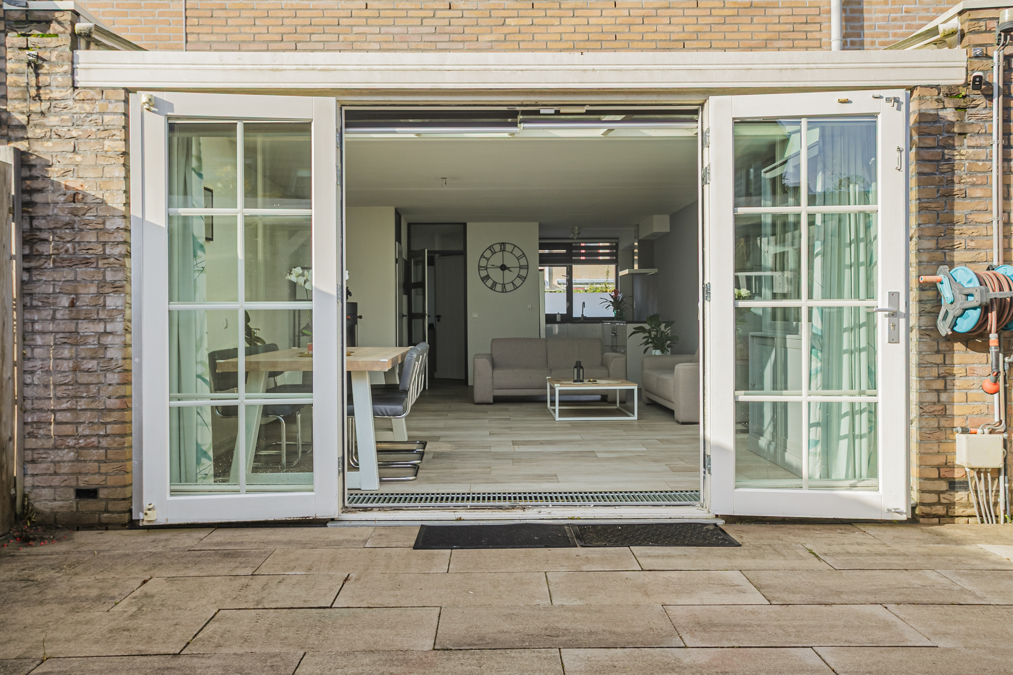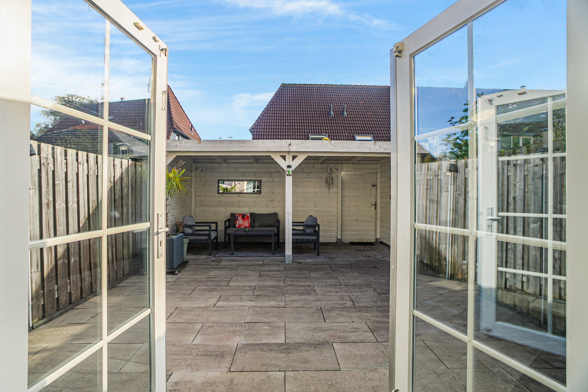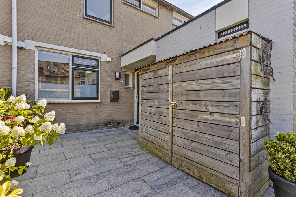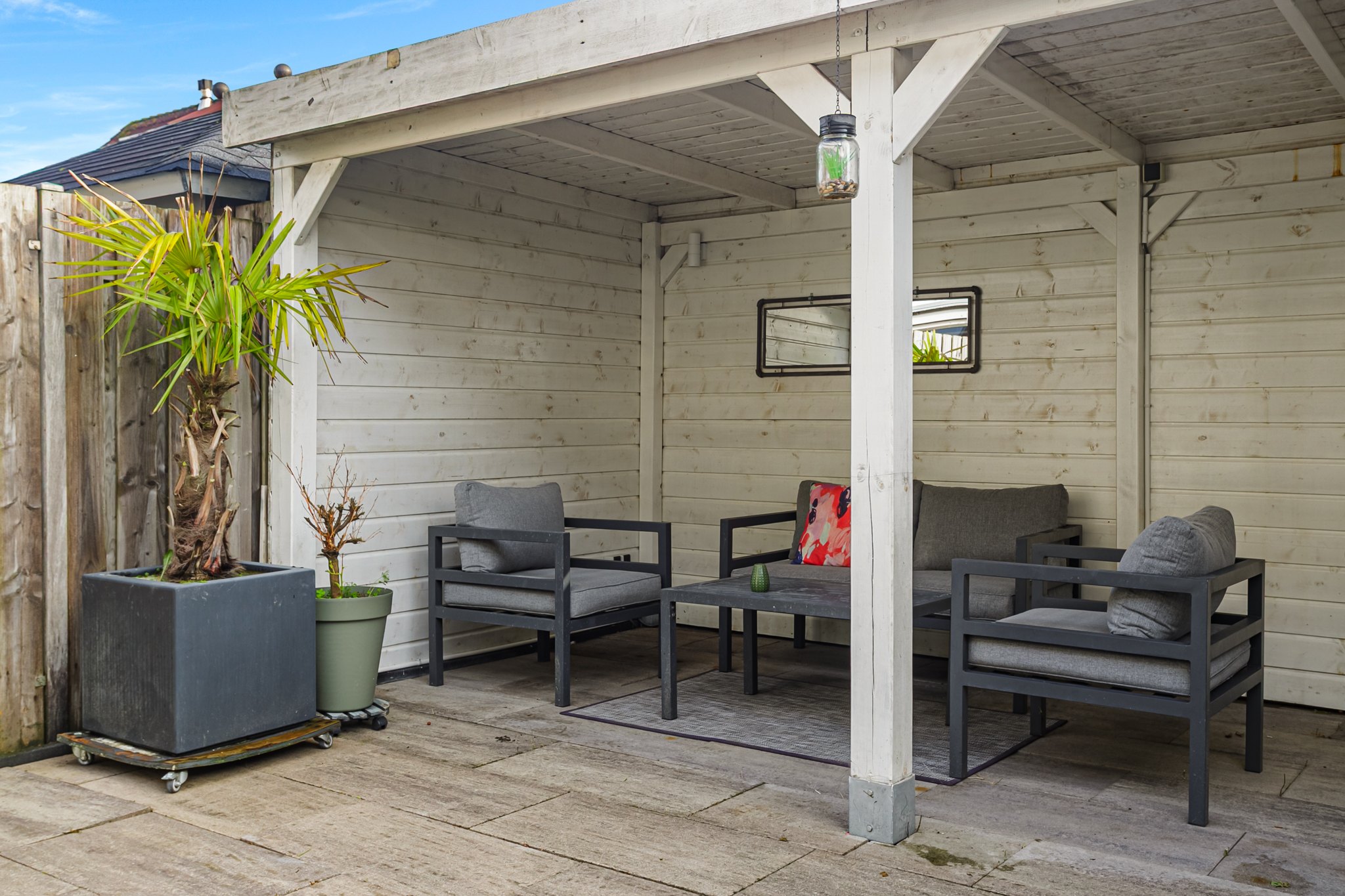 De voortuin is, samen met de buren, bestraat en als erfafscheiding is er een hoge plantenbak geplaatst. Vanuit de serre loop je de achtertuin in, gesitueerd op het zonnige zuiden. Hier zie je grote tuintegels, kunstgras en houten schuttingen waardoor het onderhoud minimaal is. Je kunt heerlijk in de zon zitten, maar ook beschut onder de grote veranda.