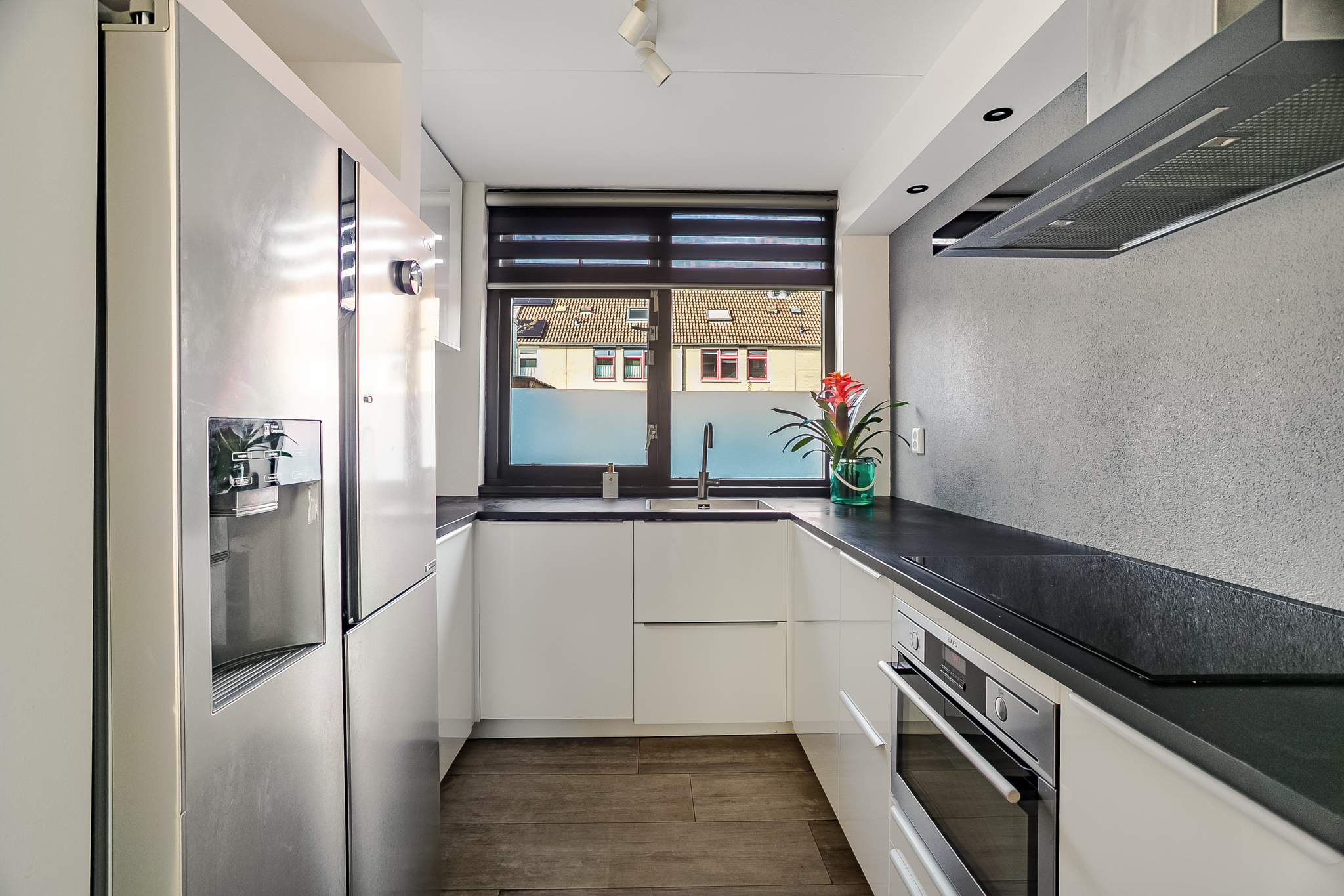 In de open keuken is de ruimte optimaal benut. De moderne U-opstelling is uitgevoerd in een lichte kleur, met een donker aanrechtblad en grote lades. In een nis is plek voor een grote koel-/vriescombinatie en de inductie kookplaat, afzuigkap, combi-oven en vaatwasser zijn ingebouwd.