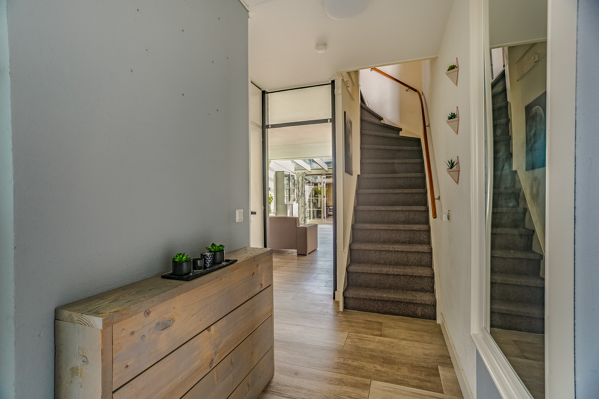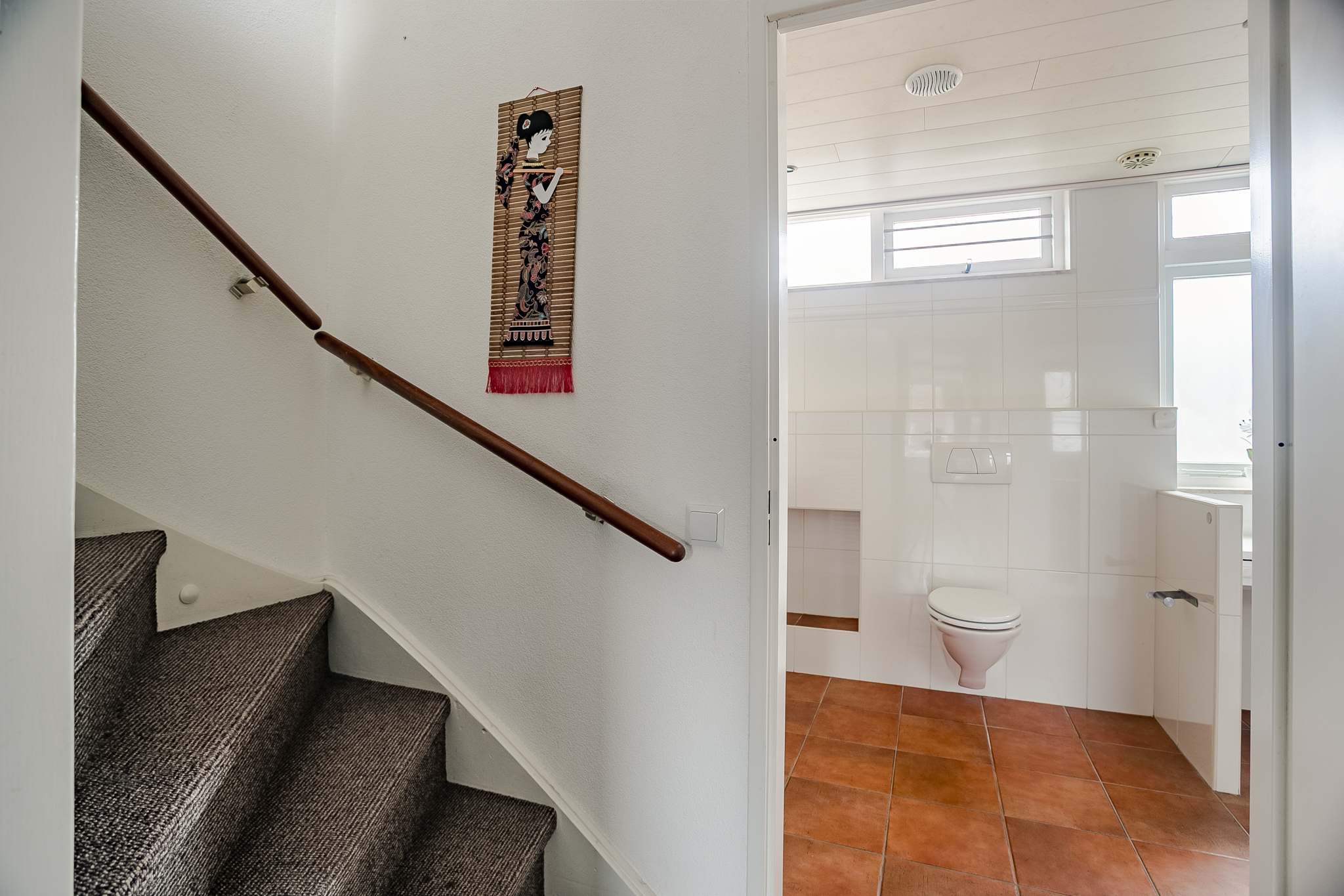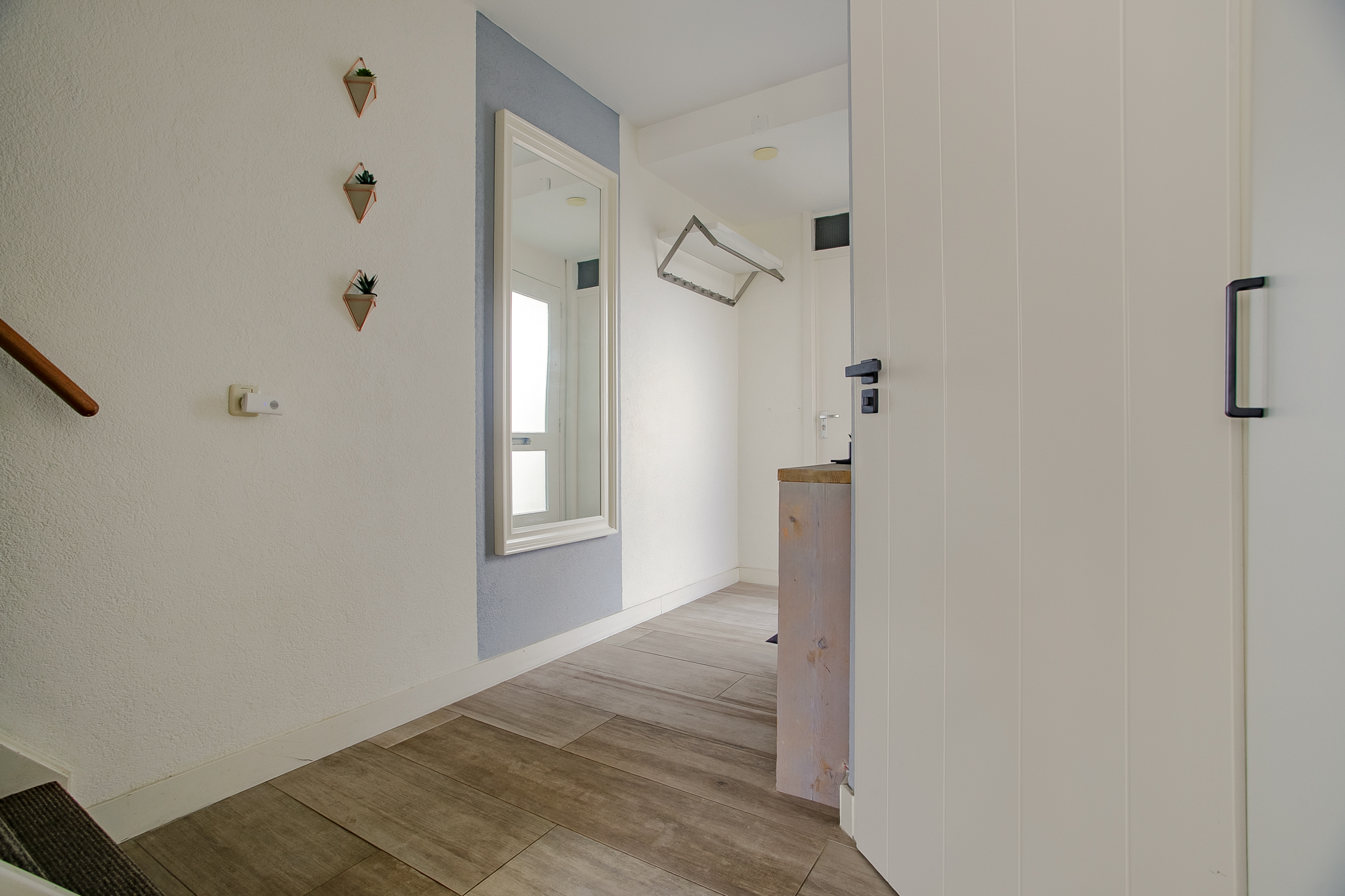 In de voortuin, naast de houten berging, is de overdekte entree van deze uitgebouwde woning. De hal is een grote ontvangstruimte die toegang biedt tot de woonkamer, berging en de moderne toiletruimte met fonteintje. Erg handig is dat de berging ook van buitenaf bereikbaar is, waardoor deze gebruikt kan worden om de fietsen neer te zetten.