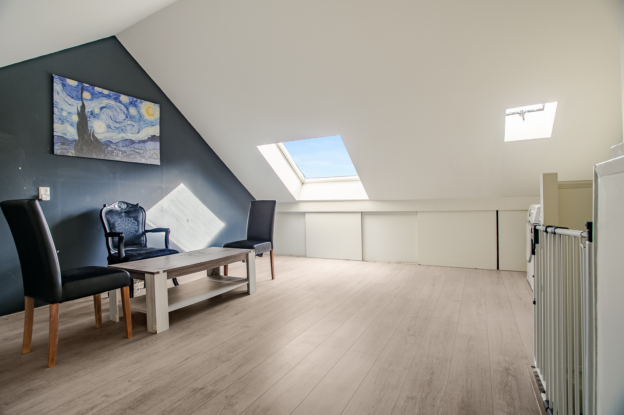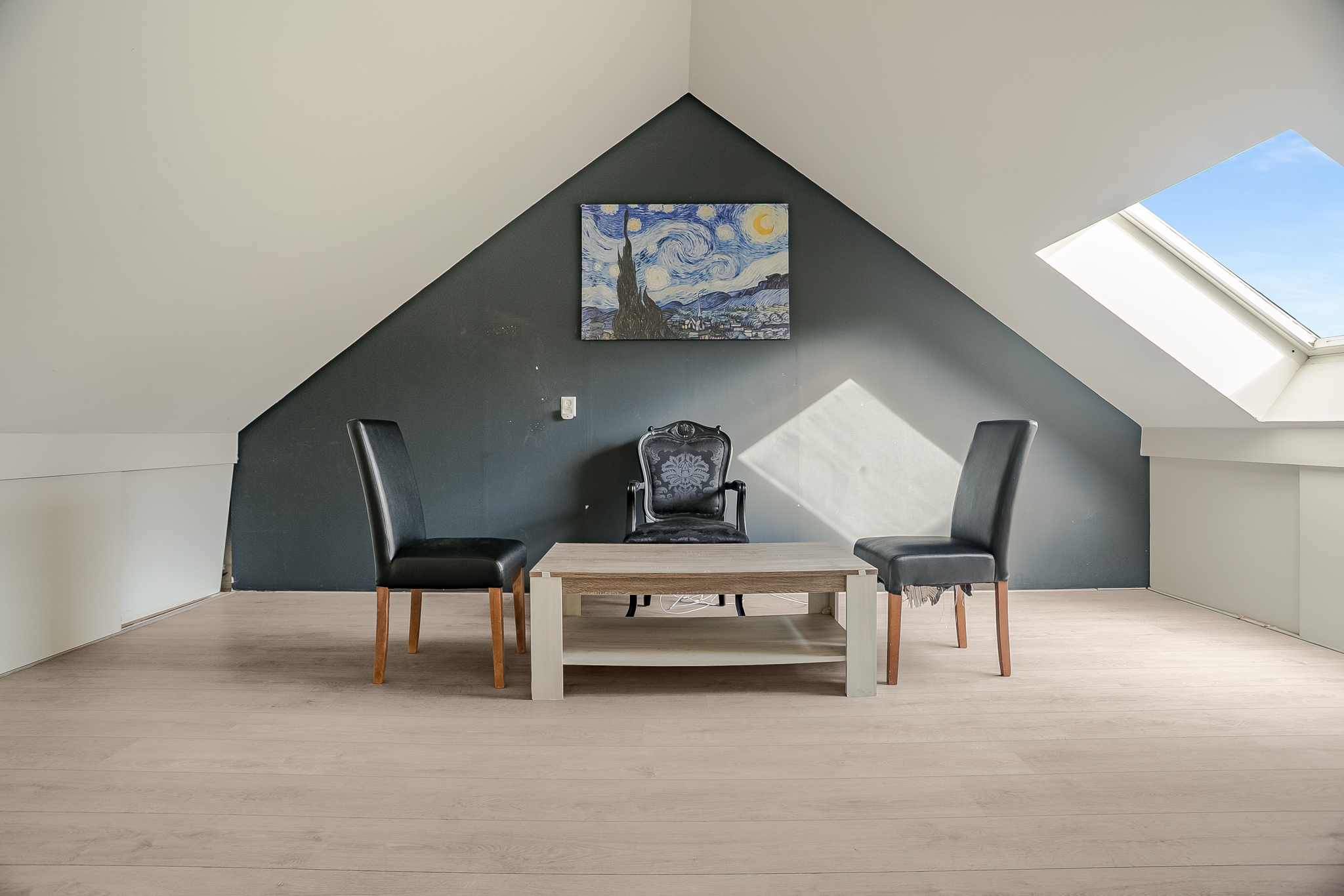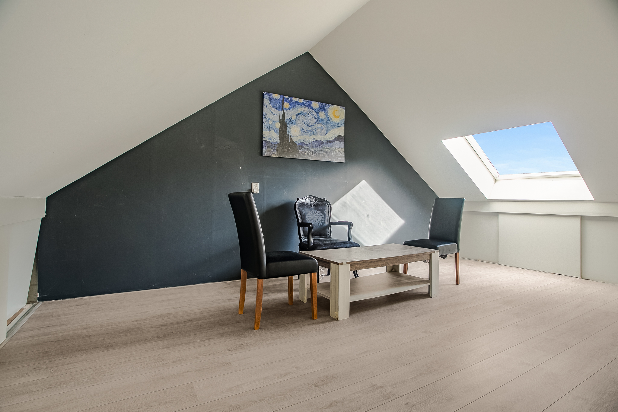 En zoek je dan toch een woning met drie slaapkamers, dan vind je deze op de tweede verdieping. Deze slaapkamer heeft een grote vloeroppervlakte, een dakraam en aan twee kanten bergruimte in de schuine van het dak. Naast de trap is de opstelling van de wasmachine en droger.