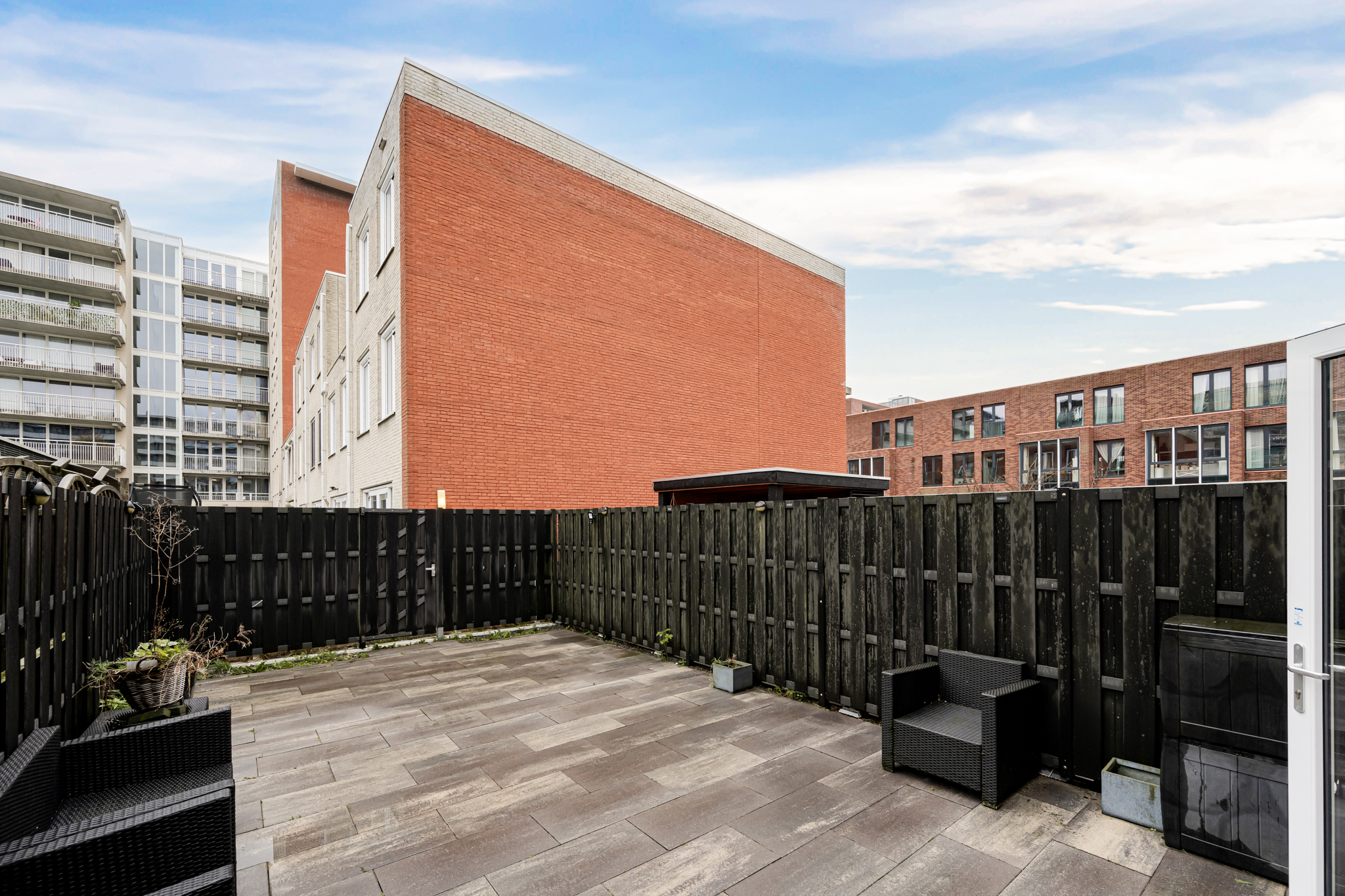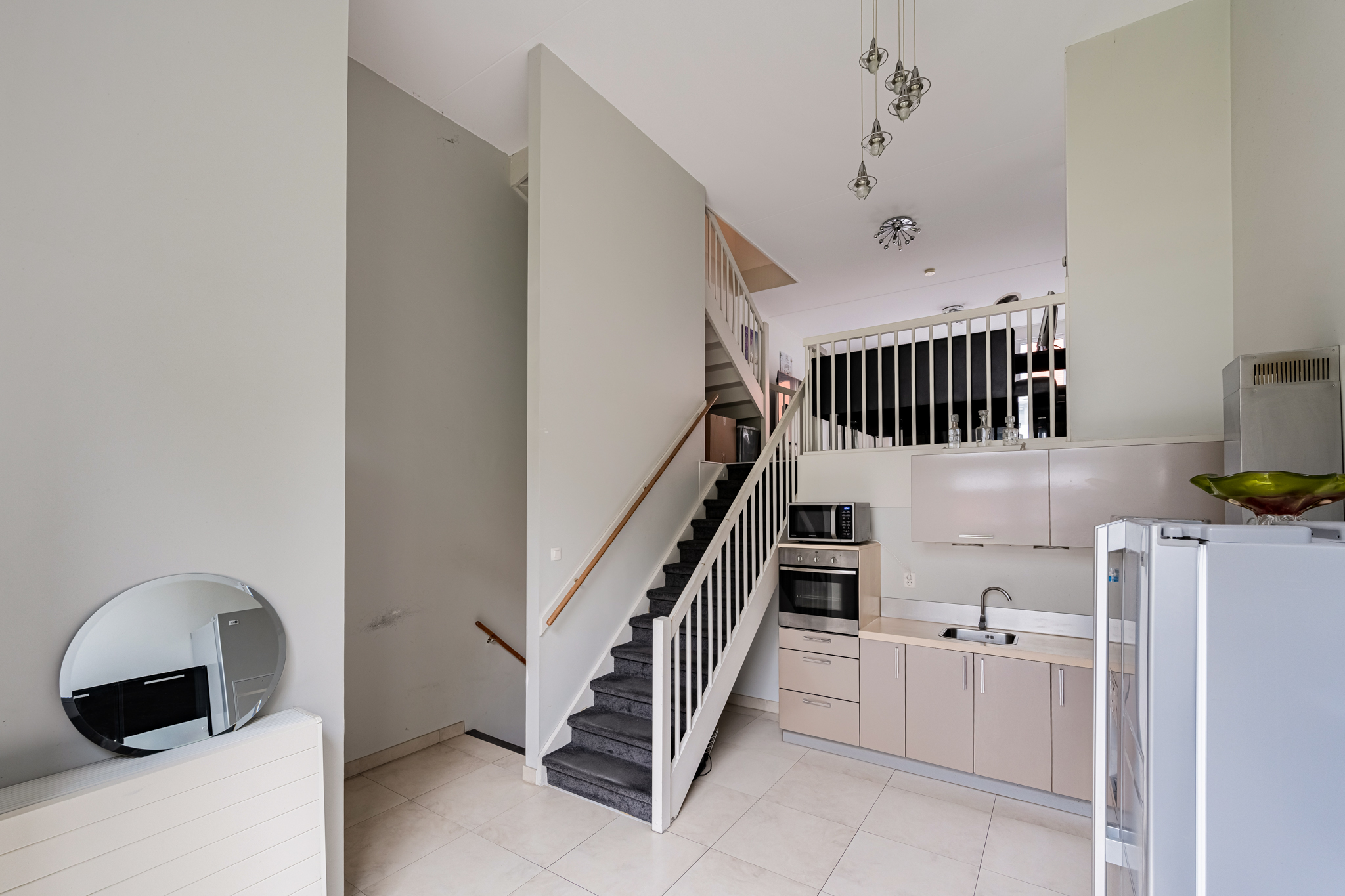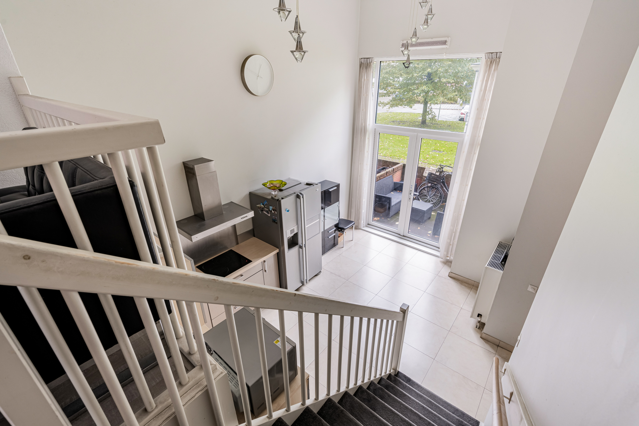 Op de begane grond bevindt zich de lichte leefkeuken, een perfecte ruimte voor culinaire creaties en gezellig samenzijn. Door de vide tussen de begane grond en de woonkamer op de eerste verdieping blijft u altijd in contact met de rest van het huis. Deze woonkamer is een heerlijke plek om te ontspannen en biedt directe toegang tot het riante dakterras van ca. 45 m², gelegen op het zuidoosten, waar u vanaf de vroege ochtend kunt genieten van de zon.