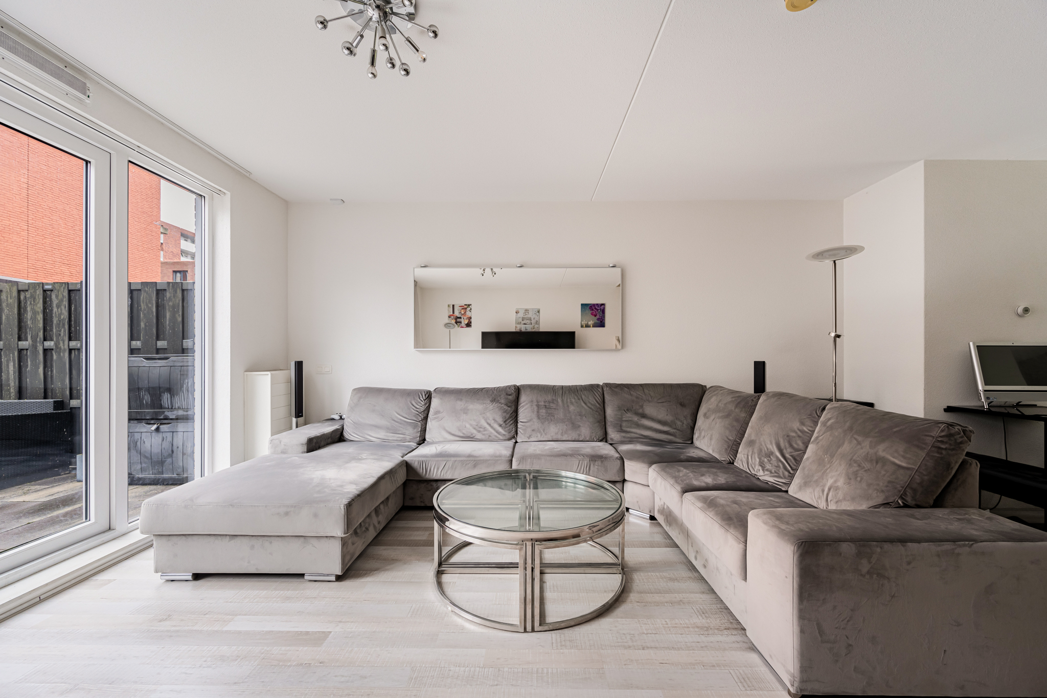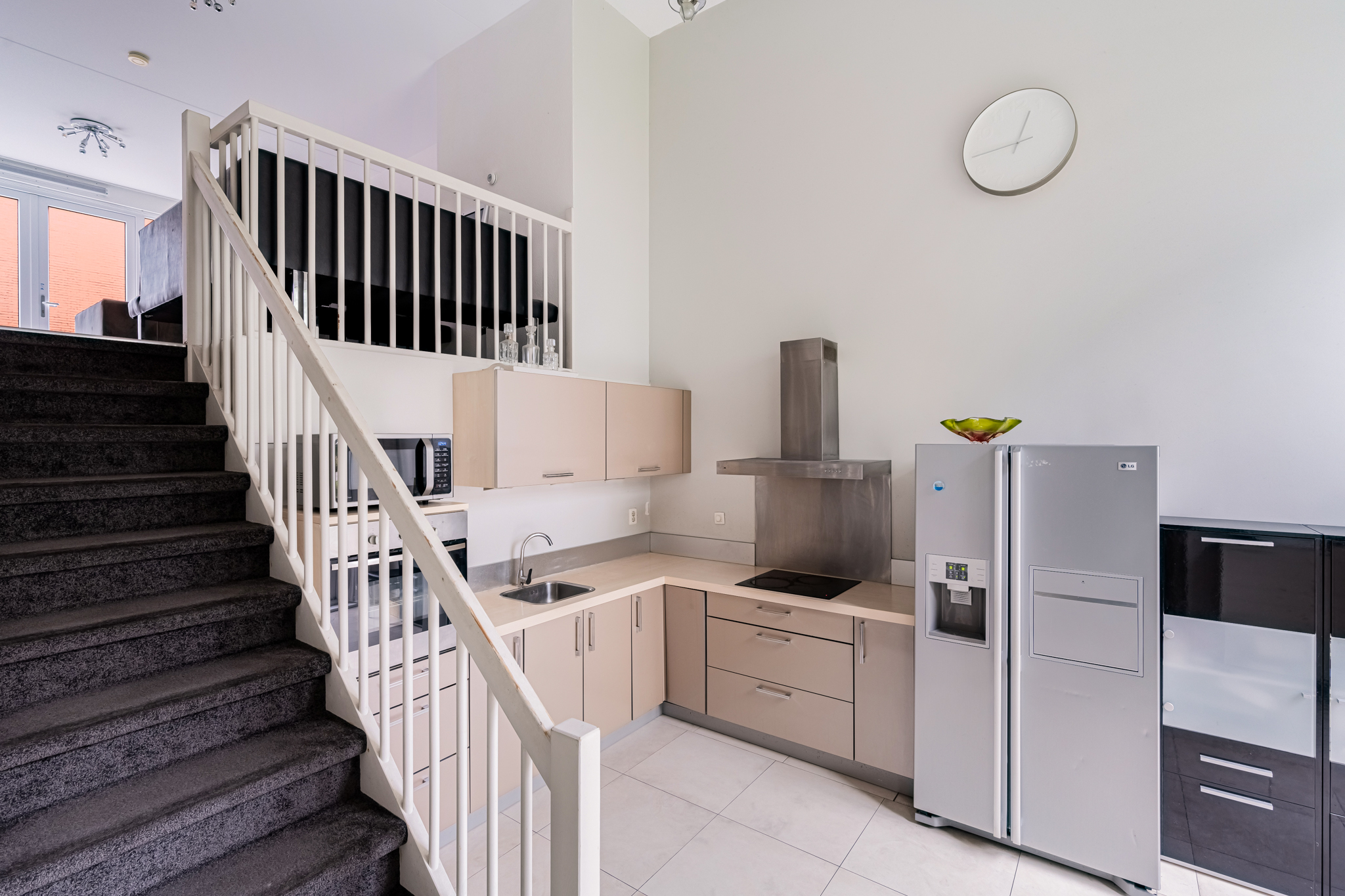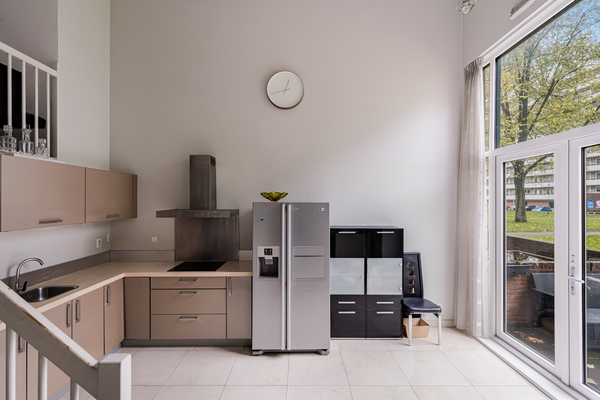 Op de begane grond bevindt zich de lichte leefkeuken, een perfecte ruimte voor culinaire creaties en gezellig samenzijn. Door de vide tussen de begane grond en de woonkamer op de eerste verdieping blijft u altijd in contact met de rest van het huis. Deze woonkamer is een heerlijke plek om te ontspannen en biedt directe toegang tot het riante dakterras van ca. 45 m², gelegen op het zuidoosten, waar u vanaf de vroege ochtend kunt genieten van de zon.