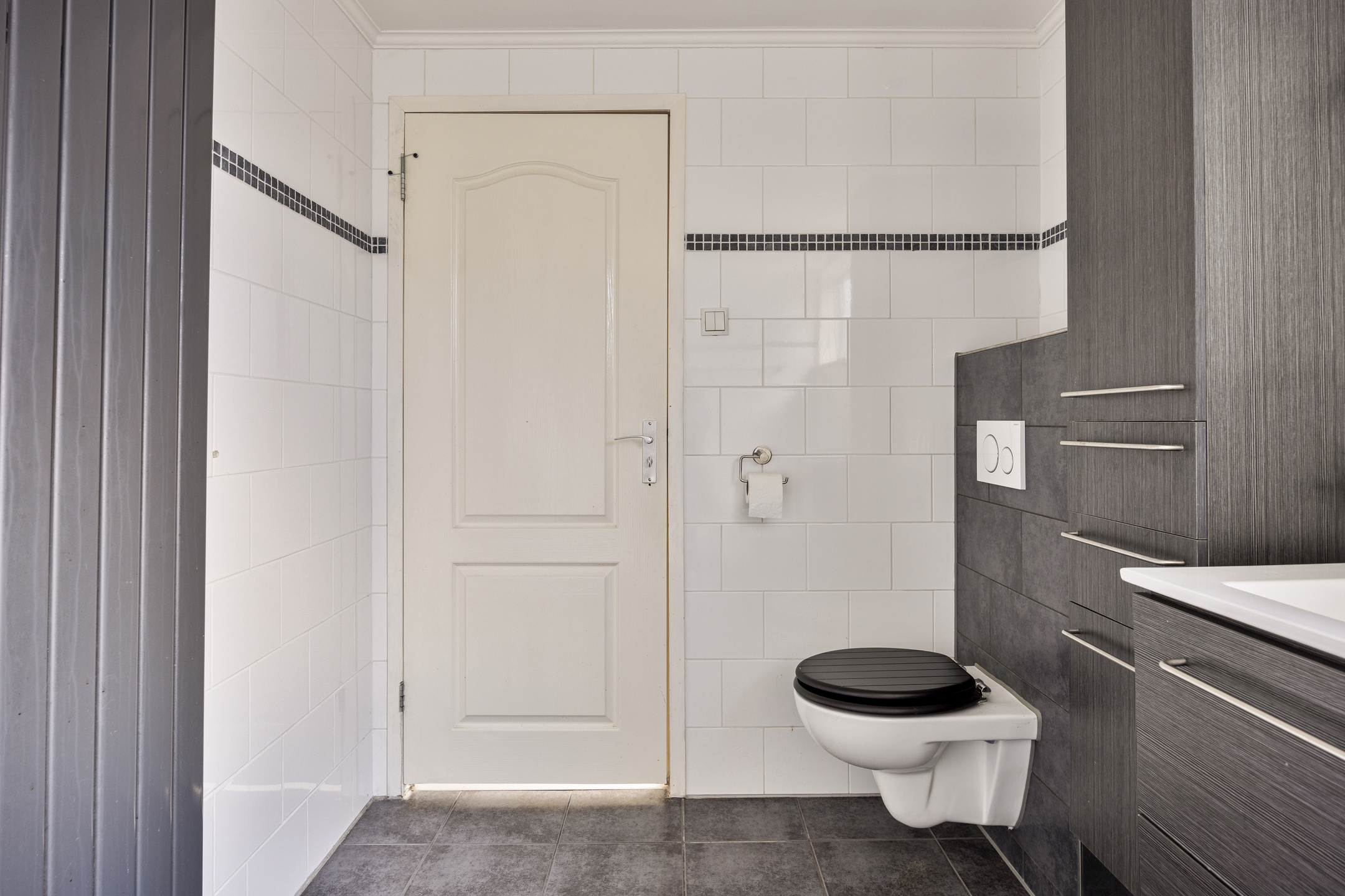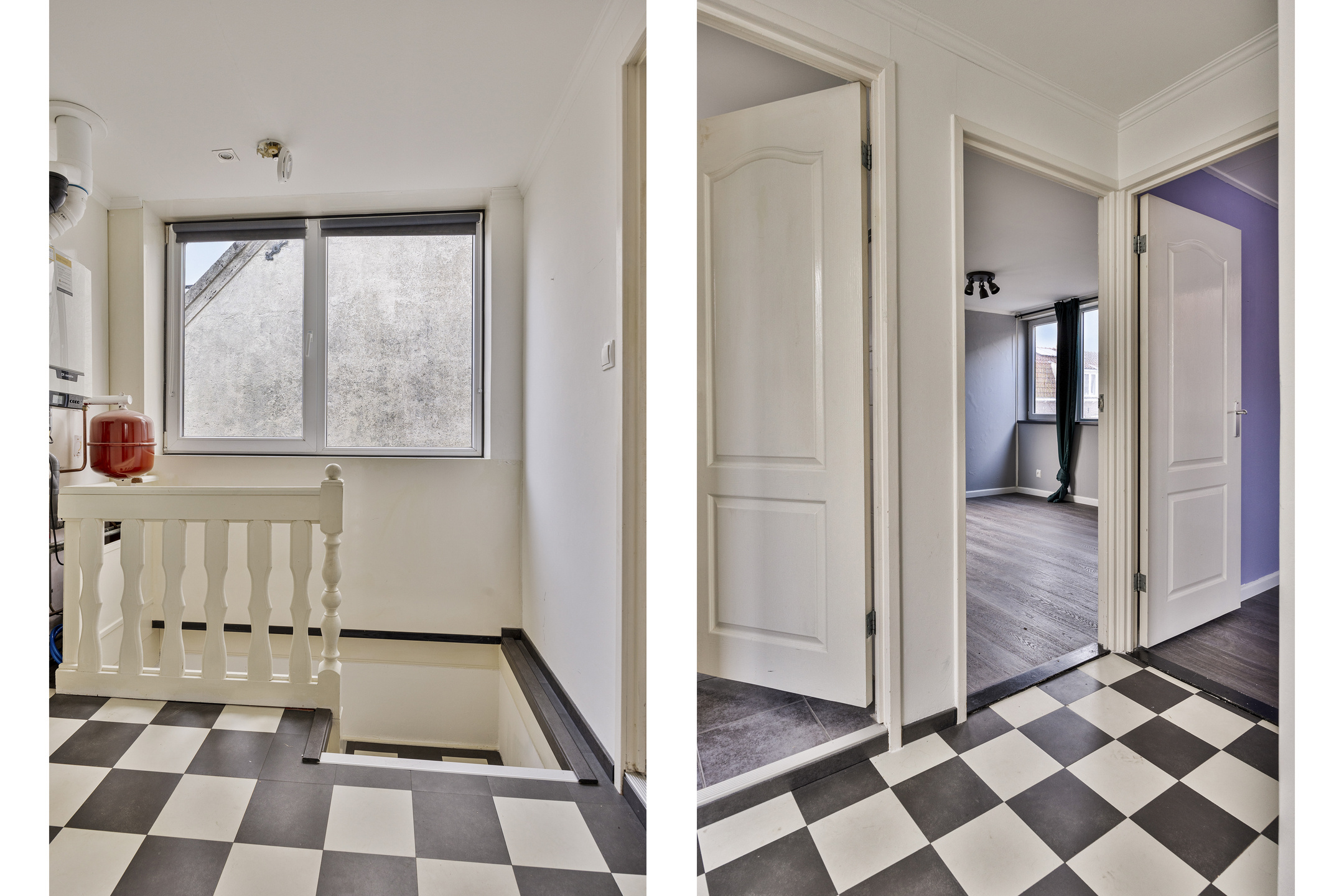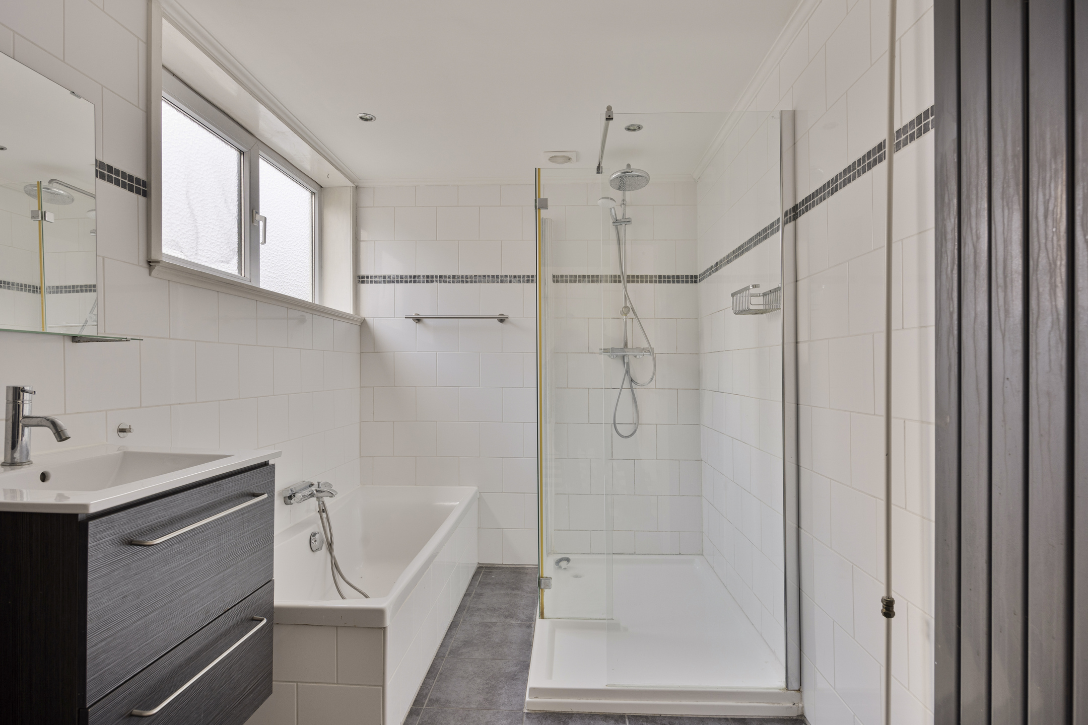 1ste verdieping: De eerste etage biedt twee ruime slaapkamers en volop praktische voorzieningen. Op de overloop vindt u de cv-ketel en een aparte berging met aansluitingen voor een wasmachine en droger. De slaapkamer aan de achterzijde is een eyecatcher dankzij de hardhouten openslaande deuren met een Frans balkon. De moderne badkamer is royaal en luxe uitgevoerd in een witte en grijze kleurstelling. Hier vindt u een ligbad, een inloopdouche, een wastafel en een zwevend toilet.