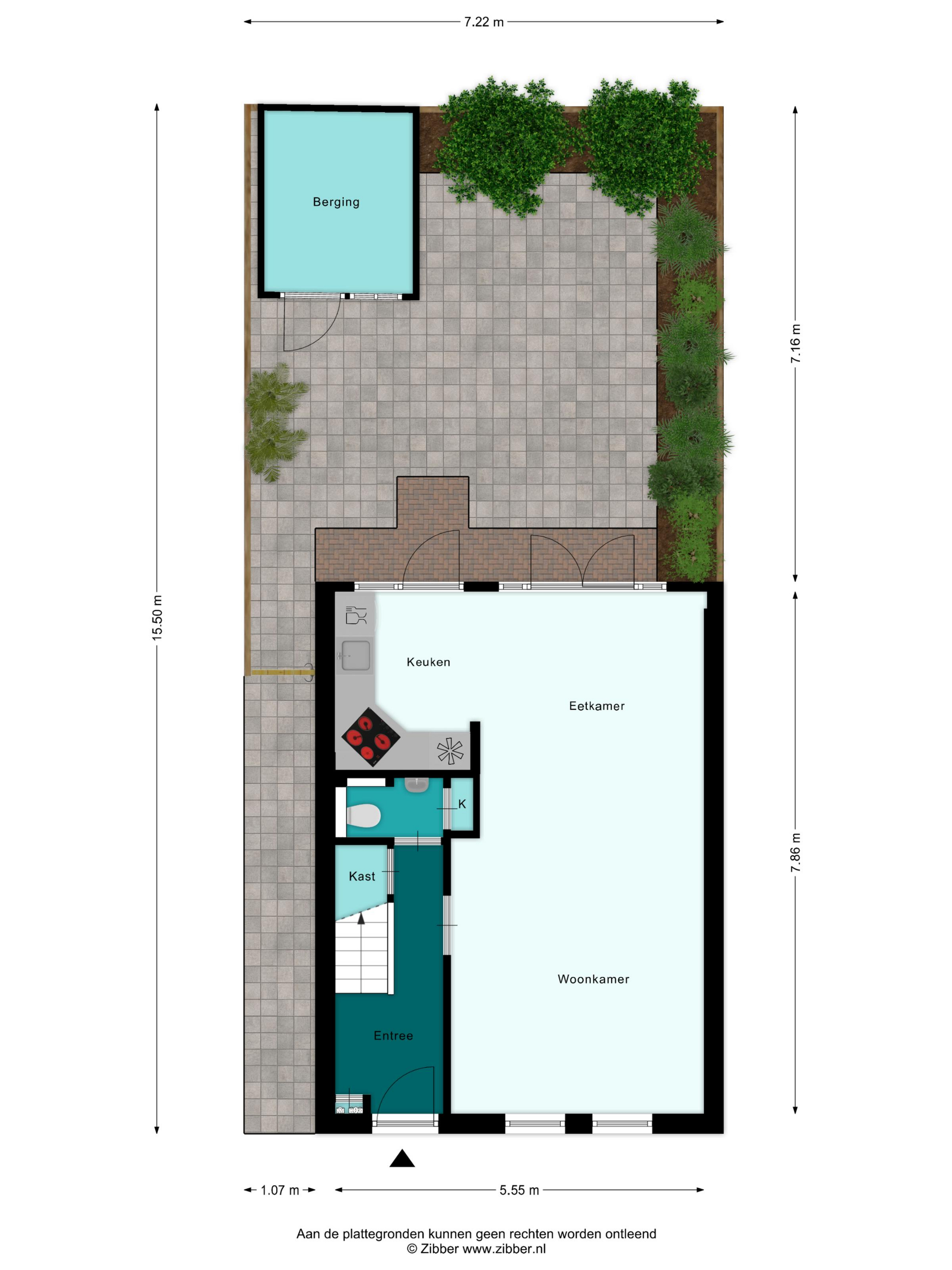 Begane grond: Bij binnenkomst treft u een entree met hal, een ruime voorraadkast, een meterkast en een modern toilet in een stijlvolle grijs/zwart/crème kleurstelling. De royale, lichte woonkamer is voorzien van prachtige houten vloerdelen, wat zorgt voor een warme en sfeervolle uitstraling. Aan de achterzijde van de woning bevindt zich de praktische keuken in een L-opstelling, compleet met een kunststof aanrechtblad en diverse inbouwapparatuur, waaronder een gaskookplaat, koelkast, oven en vaatwasser. Via de openslaande deuren bereikt u de onderhoudsvriendelijke tuin, waar een houten schuur/berging staat voor extra opslagruimte.