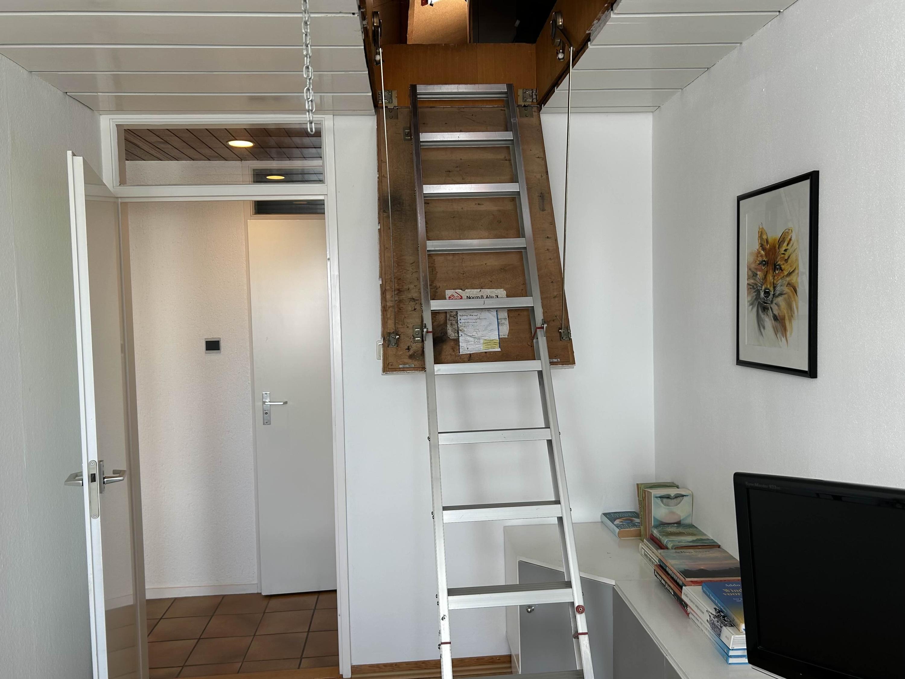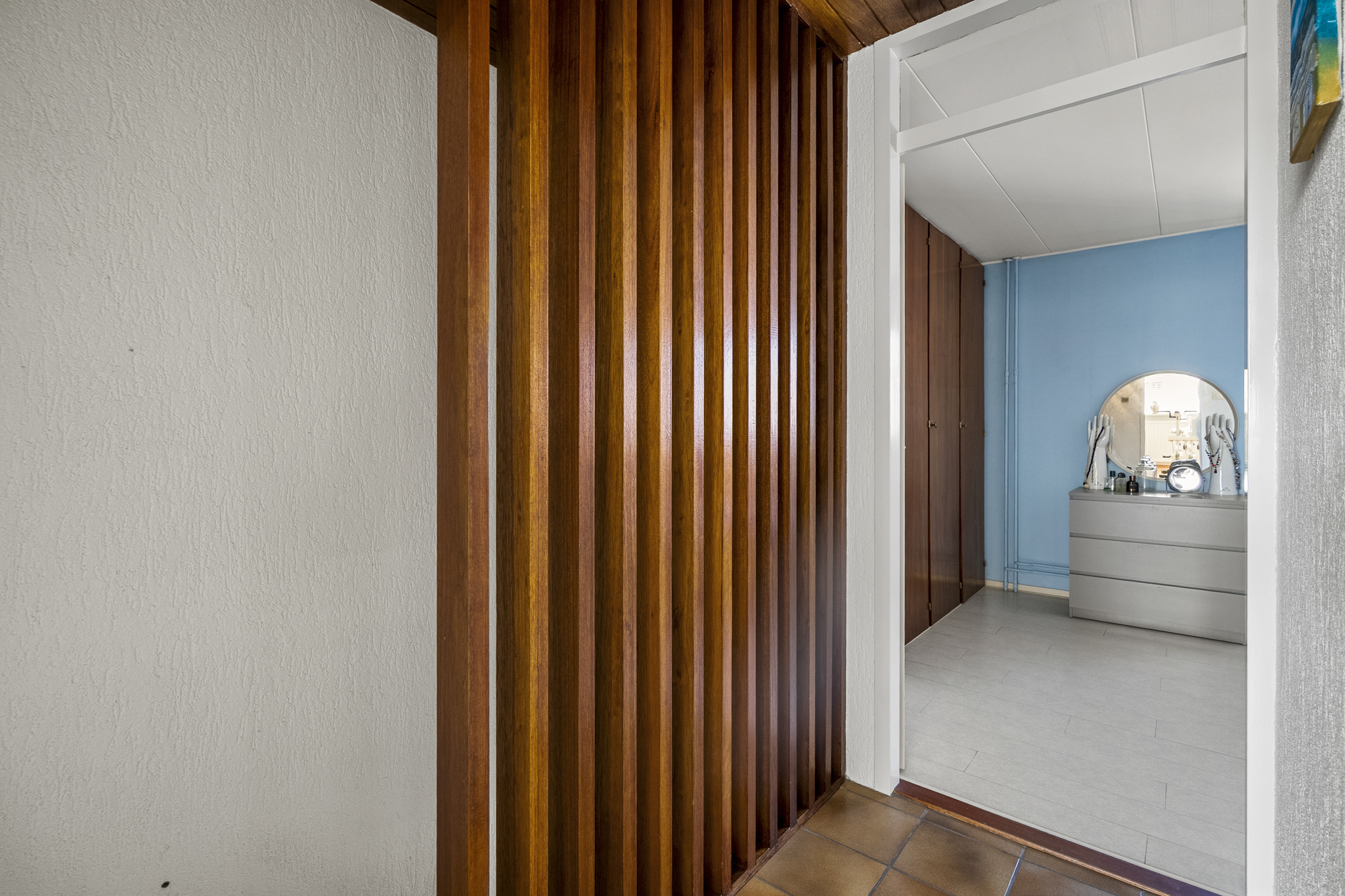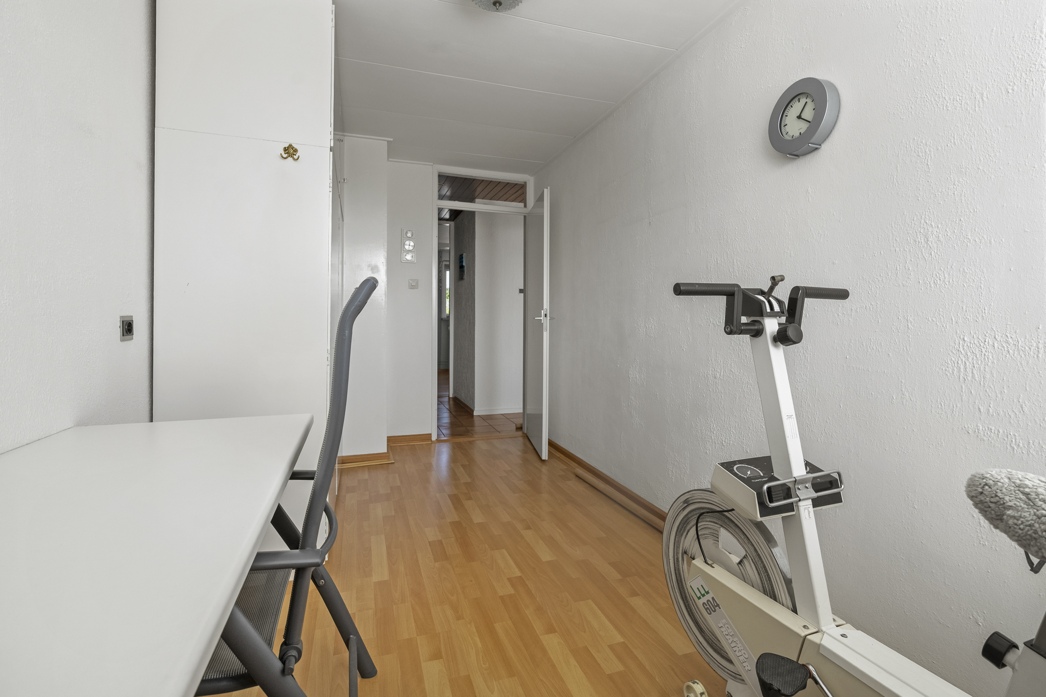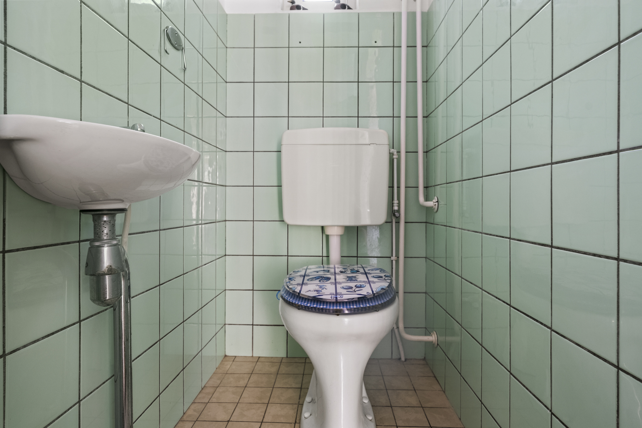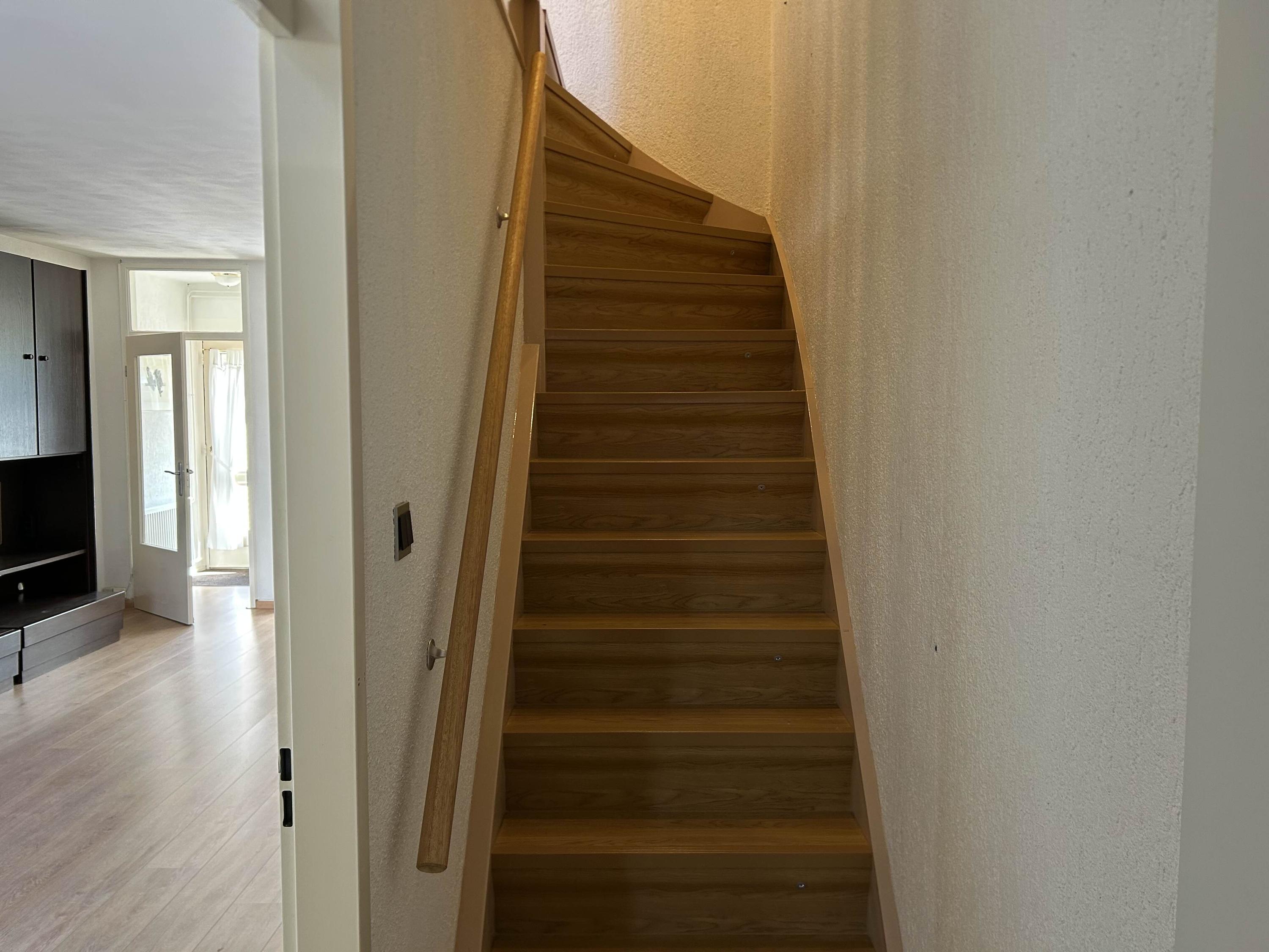 Links in de keuken is een portaal, met de trapopgang en de toiletruimte. Onder de trap is een bergkast, te bereiken vanuit de woonkamer.