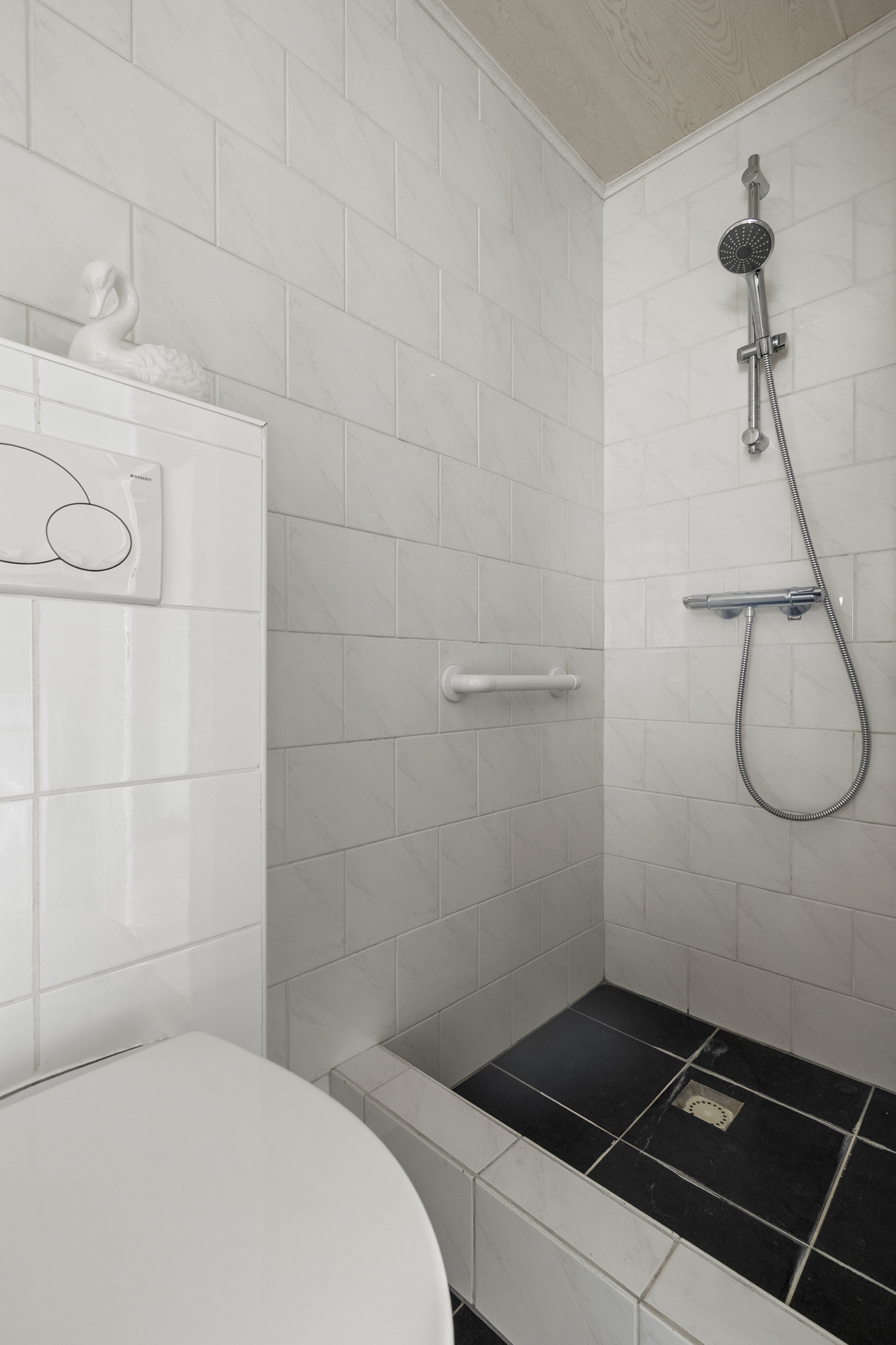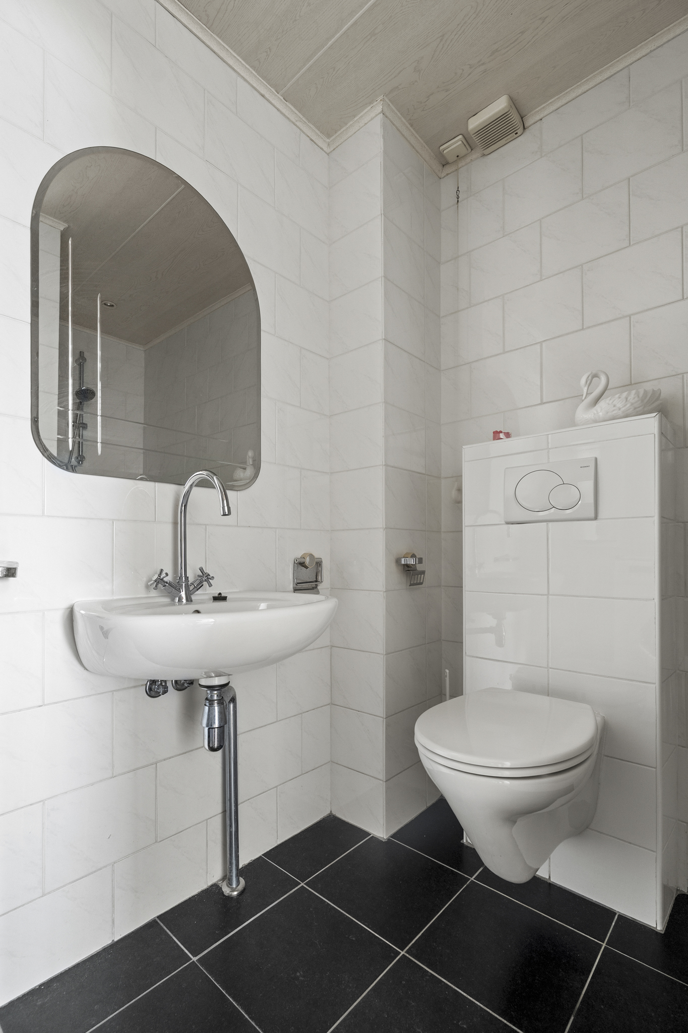 In de badkamer, uitgevoerd in rustige kleuren, is de ruimte ingedeeld met een ruime douche, tweede toilet en een wastafel.