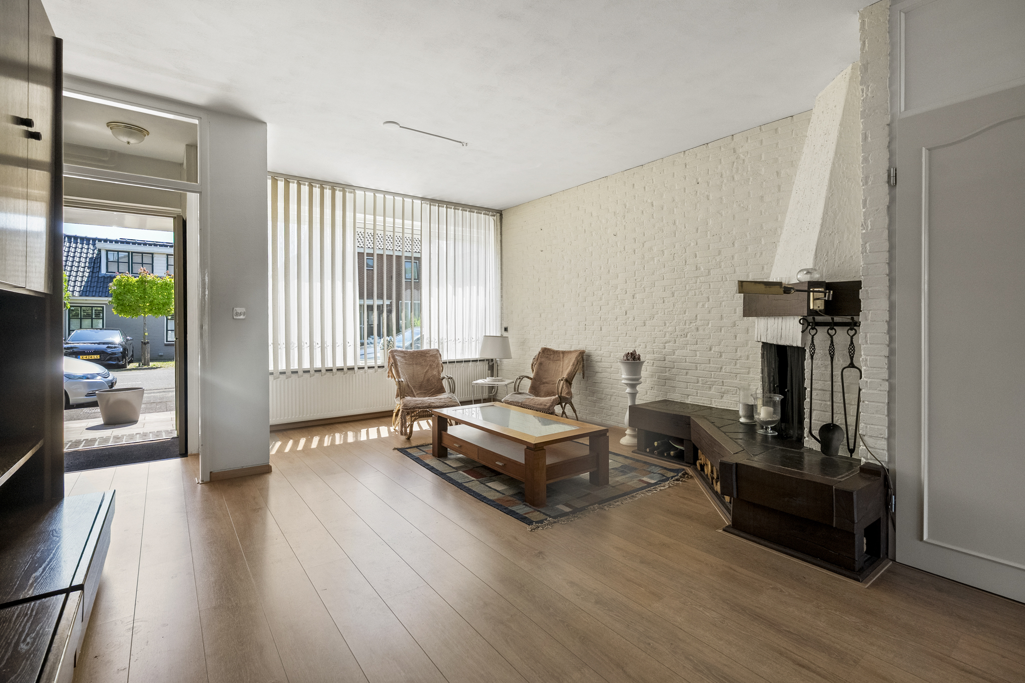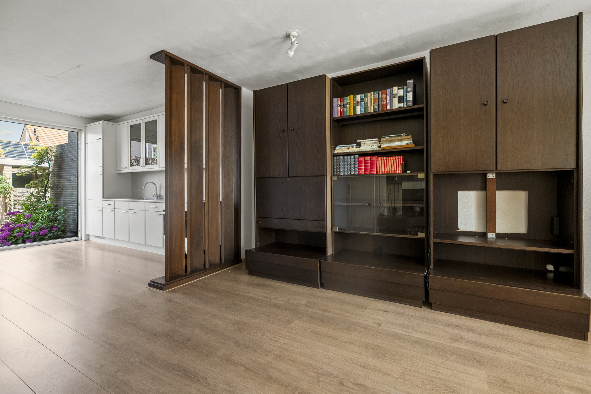 Via de hal met meterkast loop je de woonkamer in, die in open verbinding met de keuken staat. Op de vloer ligt laminaat en er is veel lichtinval, zowel aan de voor- als achterzijde. De woonkamer, met uitzicht naar de voortuin en de rustige straat, kan geheel als zitkamer worden ingedeeld. Blikvangers zijn de grote schouw met een open haard en de maatwerk kastenwand, die gepimpt kan worden of wellicht op een duurzame manier een nieuwe invulling in huis kan krijgen.