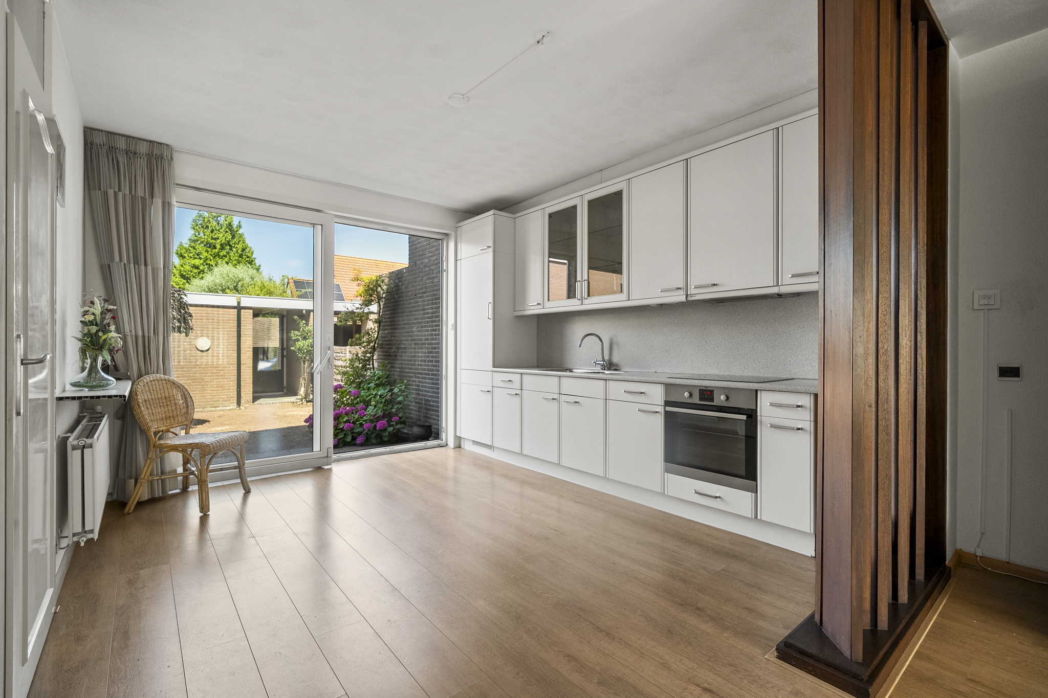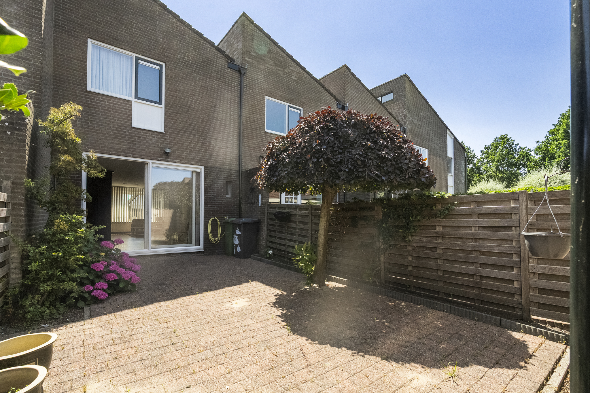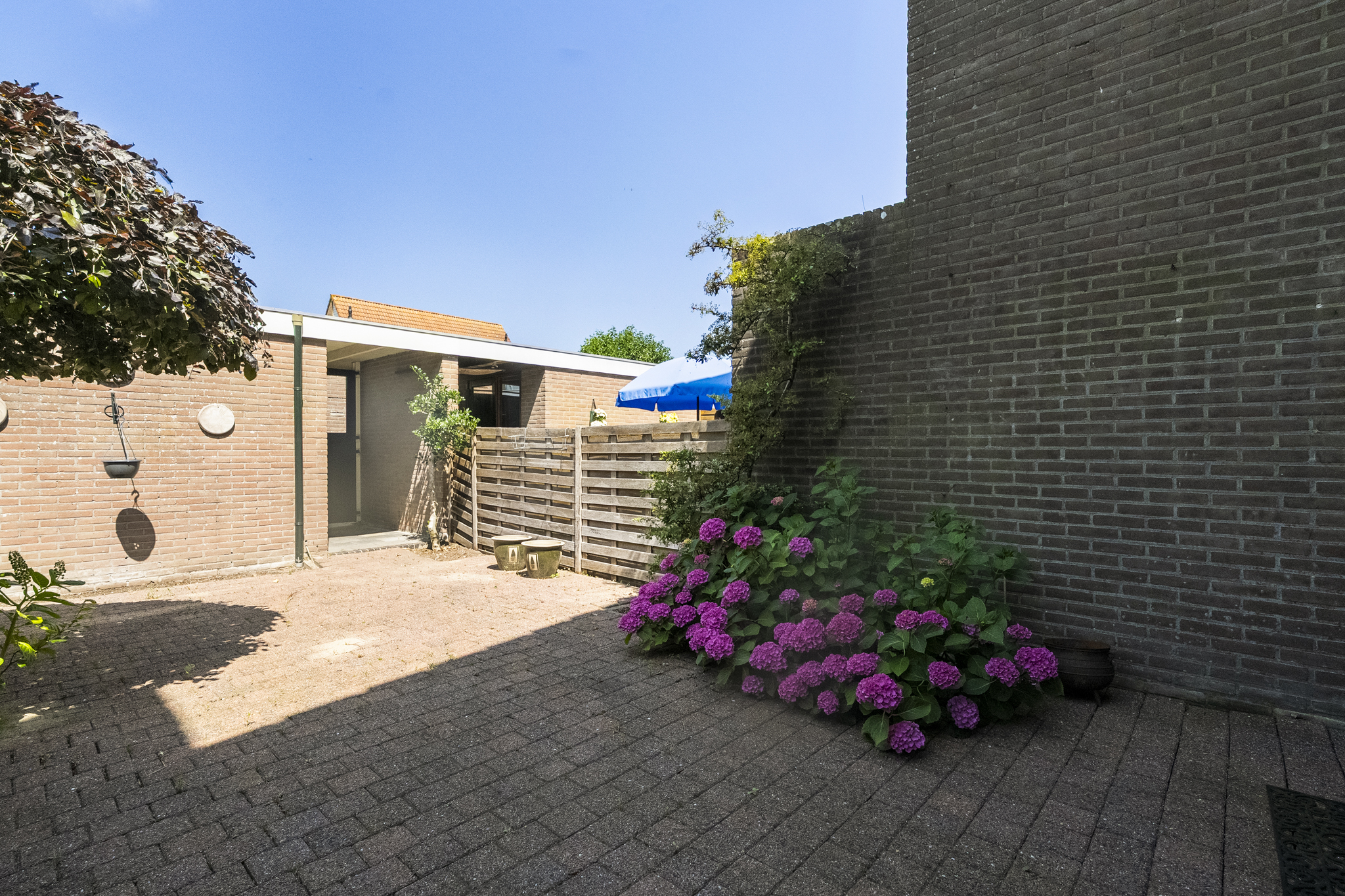 Via de schuifpui is de grotendeels betegelde achtertuin te bereiken. Deze tuin biedt zowel zon als schaduw, is heel onderhoudsvriendelijk aangelegd en er is een poort naar de steeg. De berging, met elektra, is nu in gebruik als bijkeuken/wasruimte.