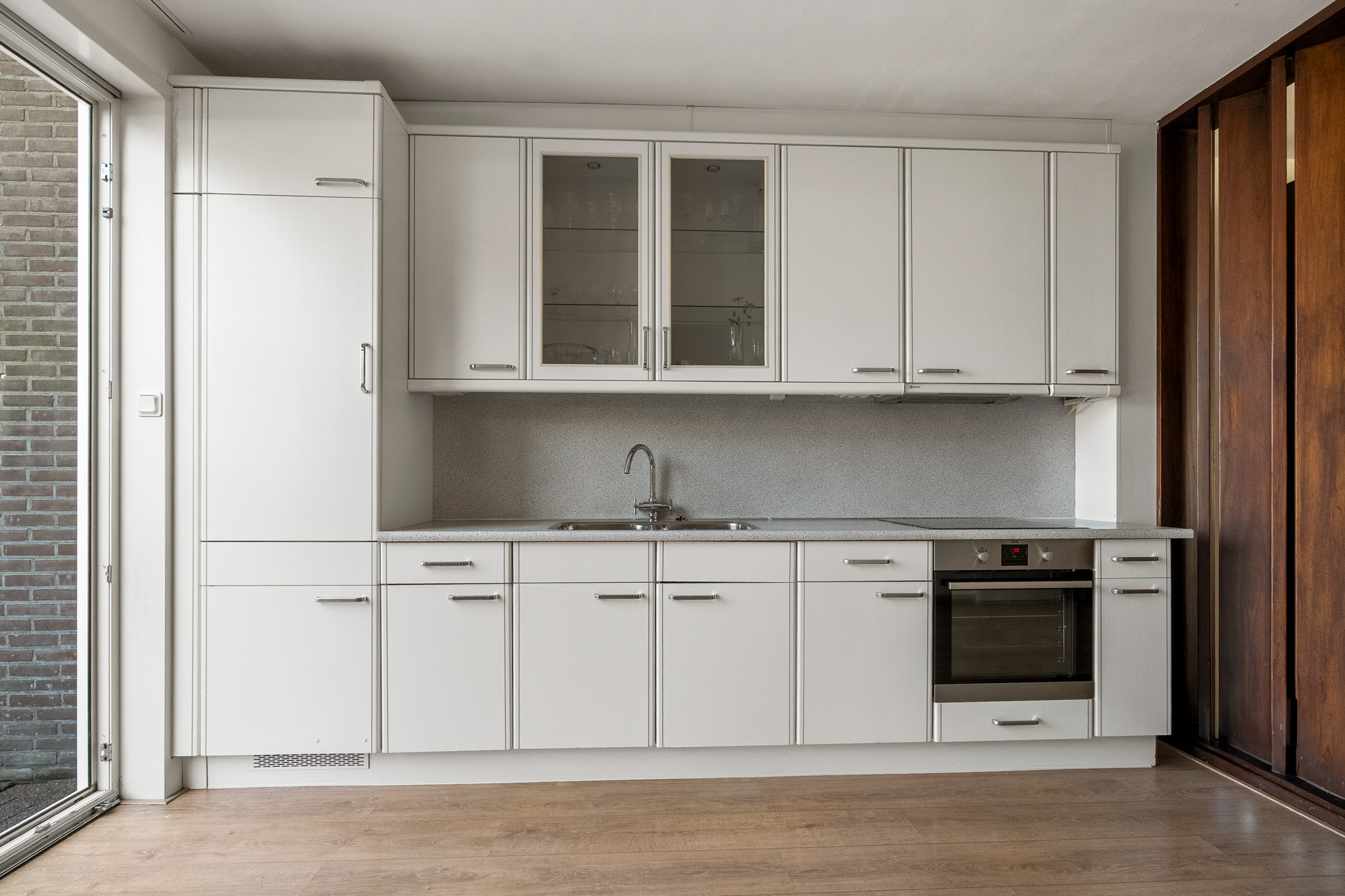 In de keuken, bij de schuifpui naar de tuin, is ruimte voor een lange eettafel. De nette, lichte wandopstelling heeft hoge bovenkasten en een dubbele spoelbak. Aan bergruimte is geen gebrek, en de keramische kookplaat, afzuigkap, combi-oven en koelkast zijn ingebouwd.