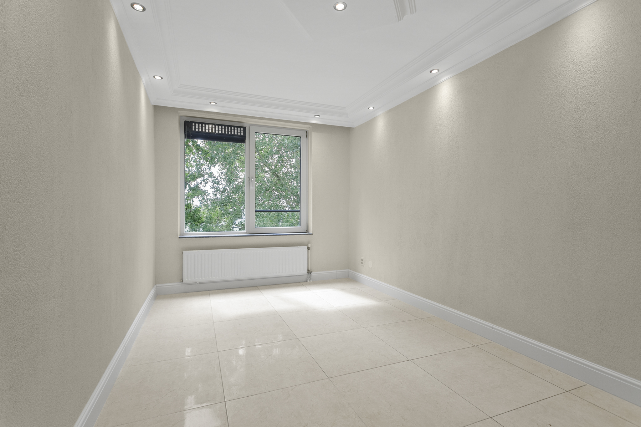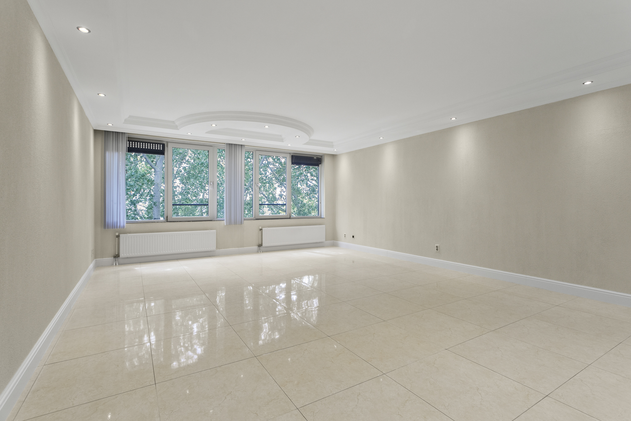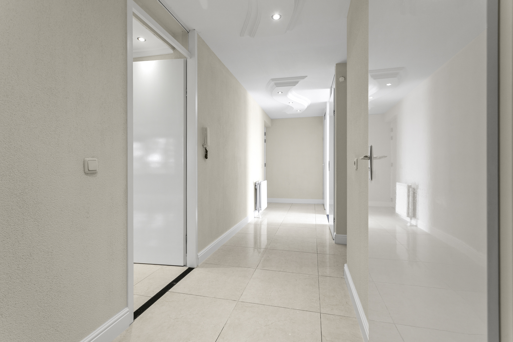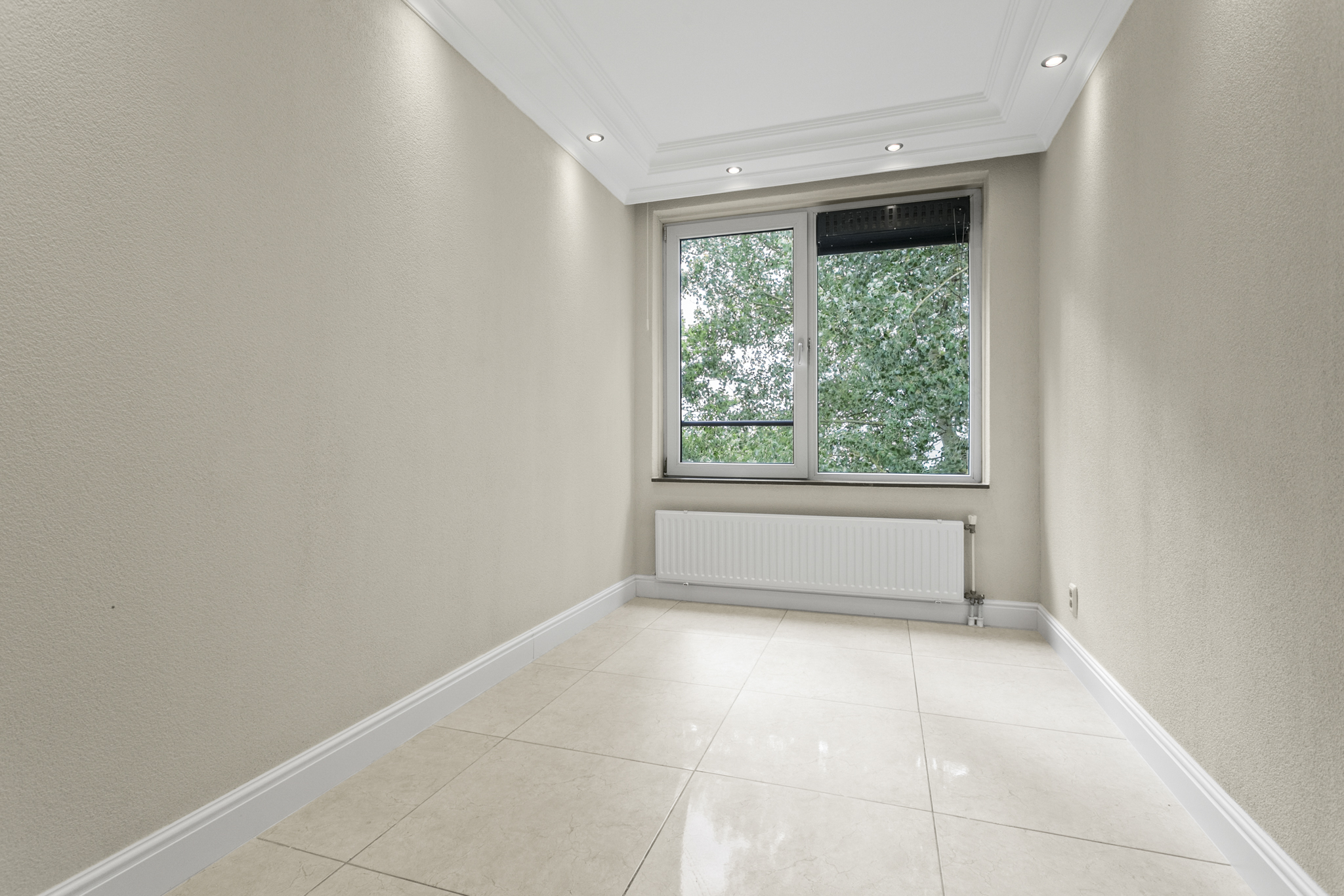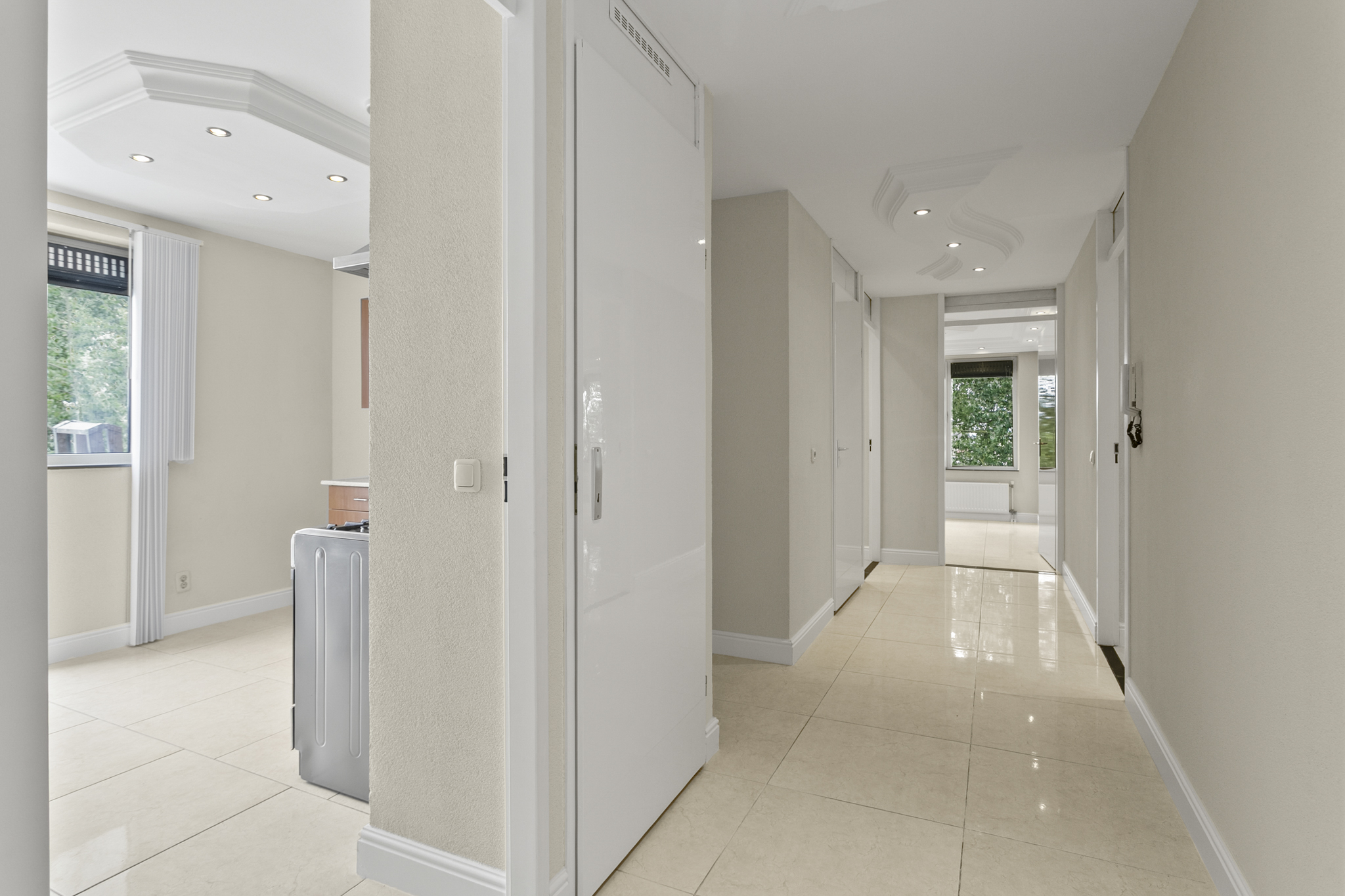 Via de verzorgde, gemeenschappelijke entree bereik je met de lift of trap de vierde verdieping. De woning betreed je via een lange hal die leidt naar de ruime en lichte woonkamer. Dankzij de grote panoramische ramen geniet je hier van een weids uitzicht op het groen en een overvloed aan natuurlijk licht. De luxe afwerking – met plafonddecoratie, een moderne tegelvloer en inbouwspots door de gehele woning – draagt bij aan een stijlvolle en comfortabele woonsfeer.