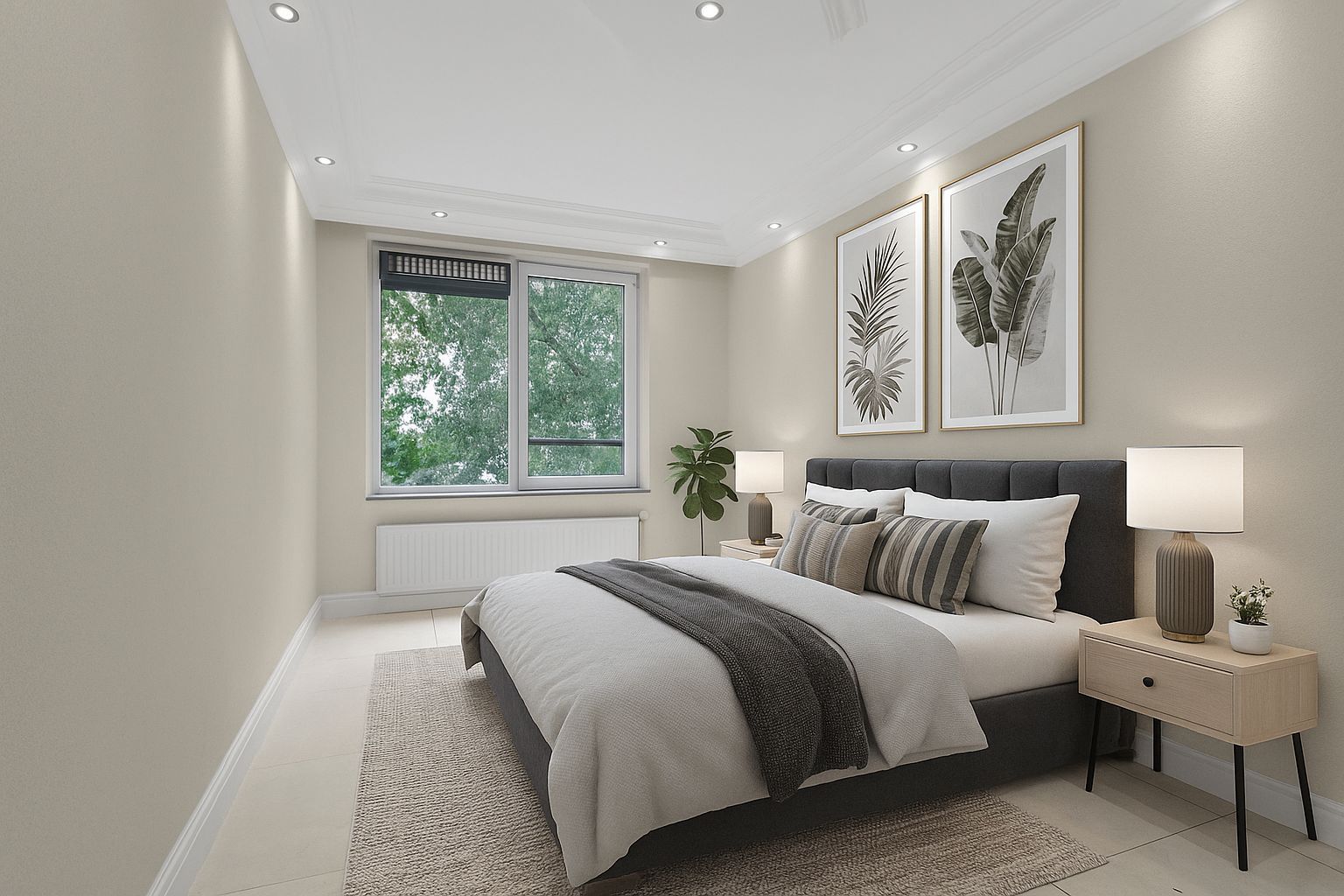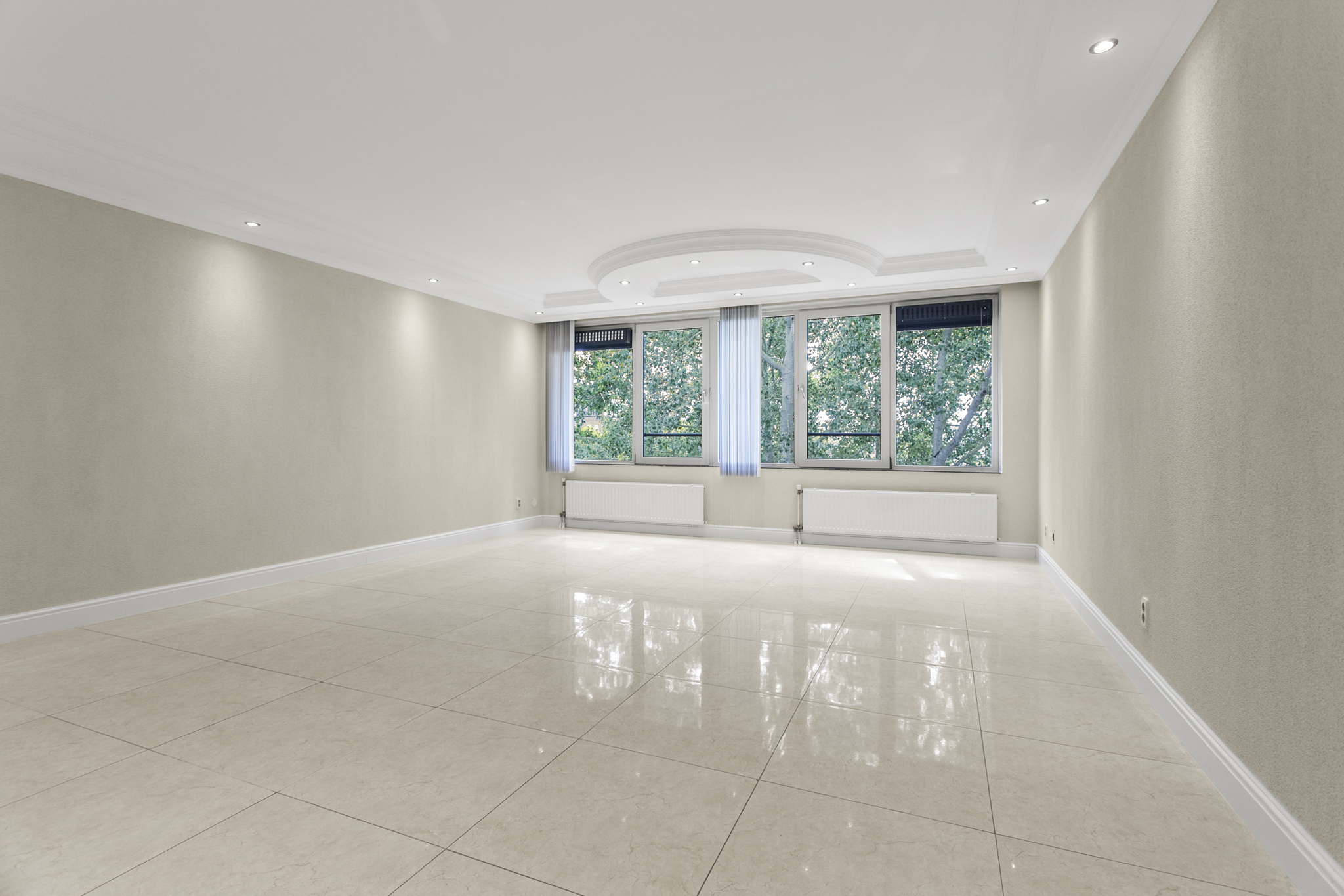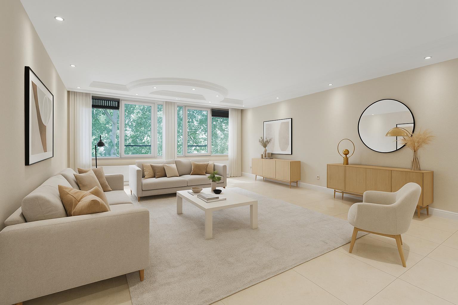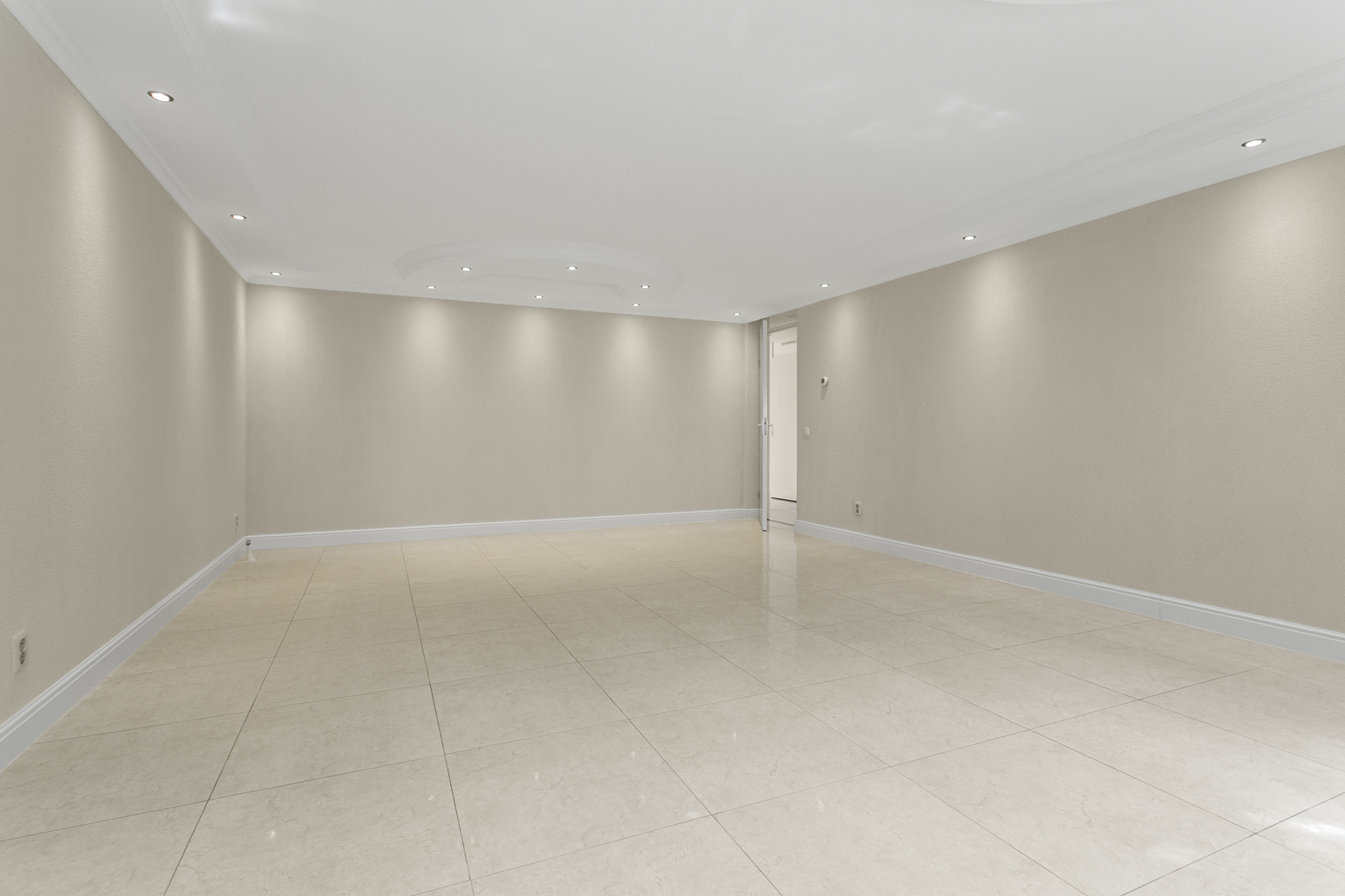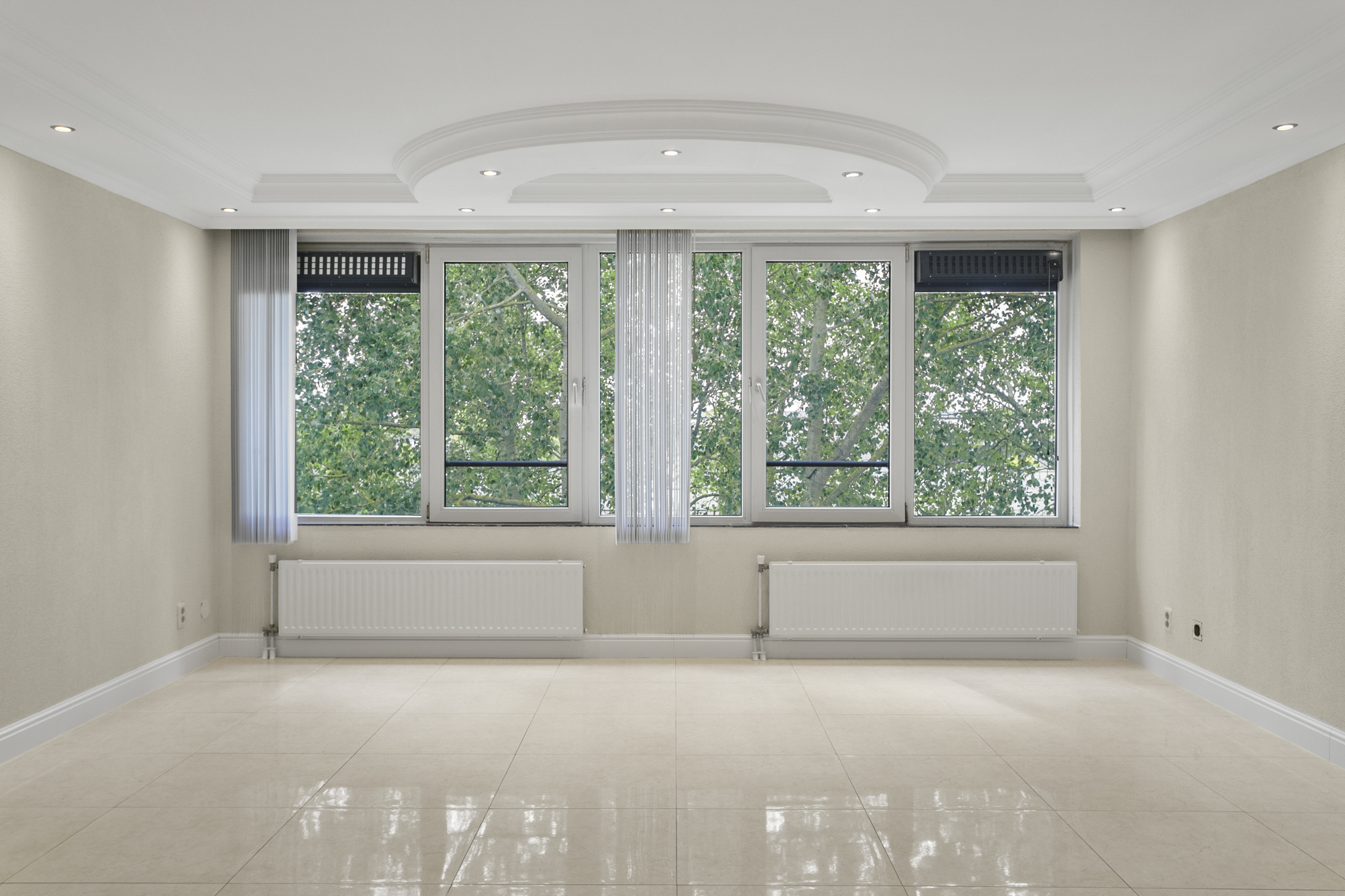 Via de verzorgde, gemeenschappelijke entree bereik je met de lift of trap de vierde verdieping. De woning betreed je via een lange hal die leidt naar de ruime en lichte woonkamer. Dankzij de grote panoramische ramen geniet je hier van een weids uitzicht op het groen en een overvloed aan natuurlijk licht. De luxe afwerking – met plafonddecoratie, een moderne tegelvloer en inbouwspots door de gehele woning – draagt bij aan een stijlvolle en comfortabele woonsfeer.