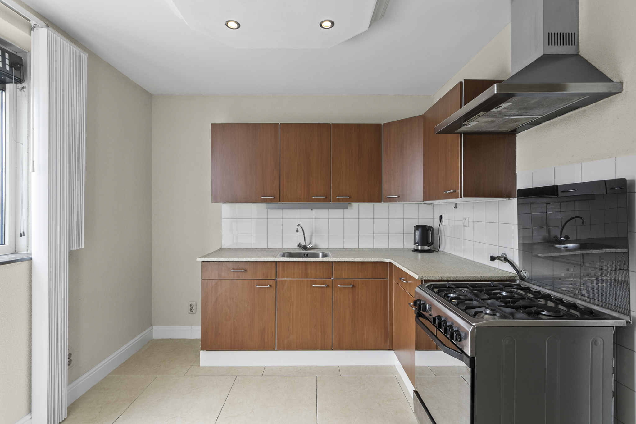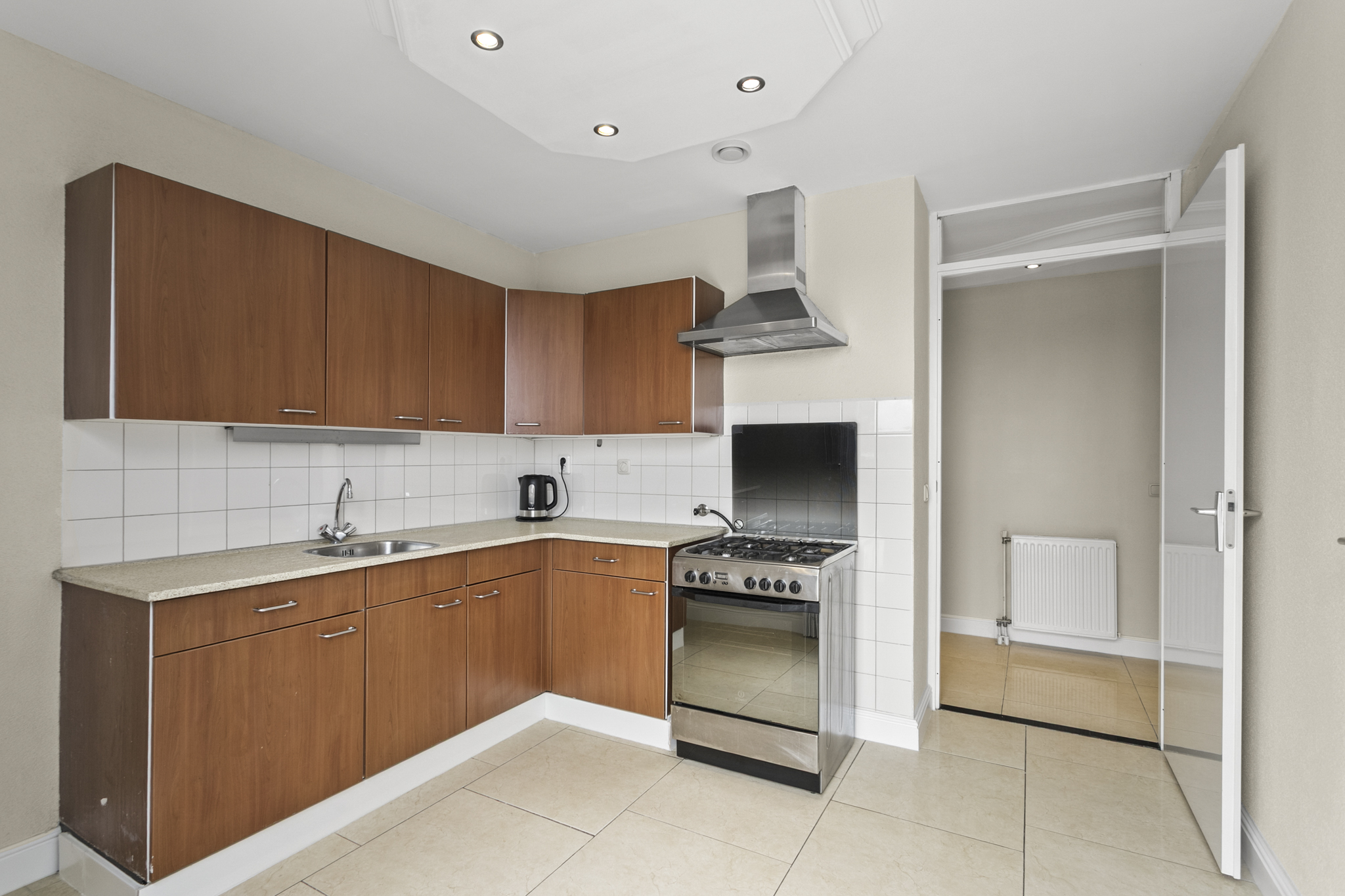 Aan de andere zijde van de hal bevindt zich de keuken, uitgerust met een 4-pits gasfornuis, oven en voldoende bergruimte voor je voorraad. Vanuit de keuken heb je direct toegang tot het zonnige dakterras waar je heerlijk kunt genieten van de ochtend- en middagzon en het vrije uitzicht.