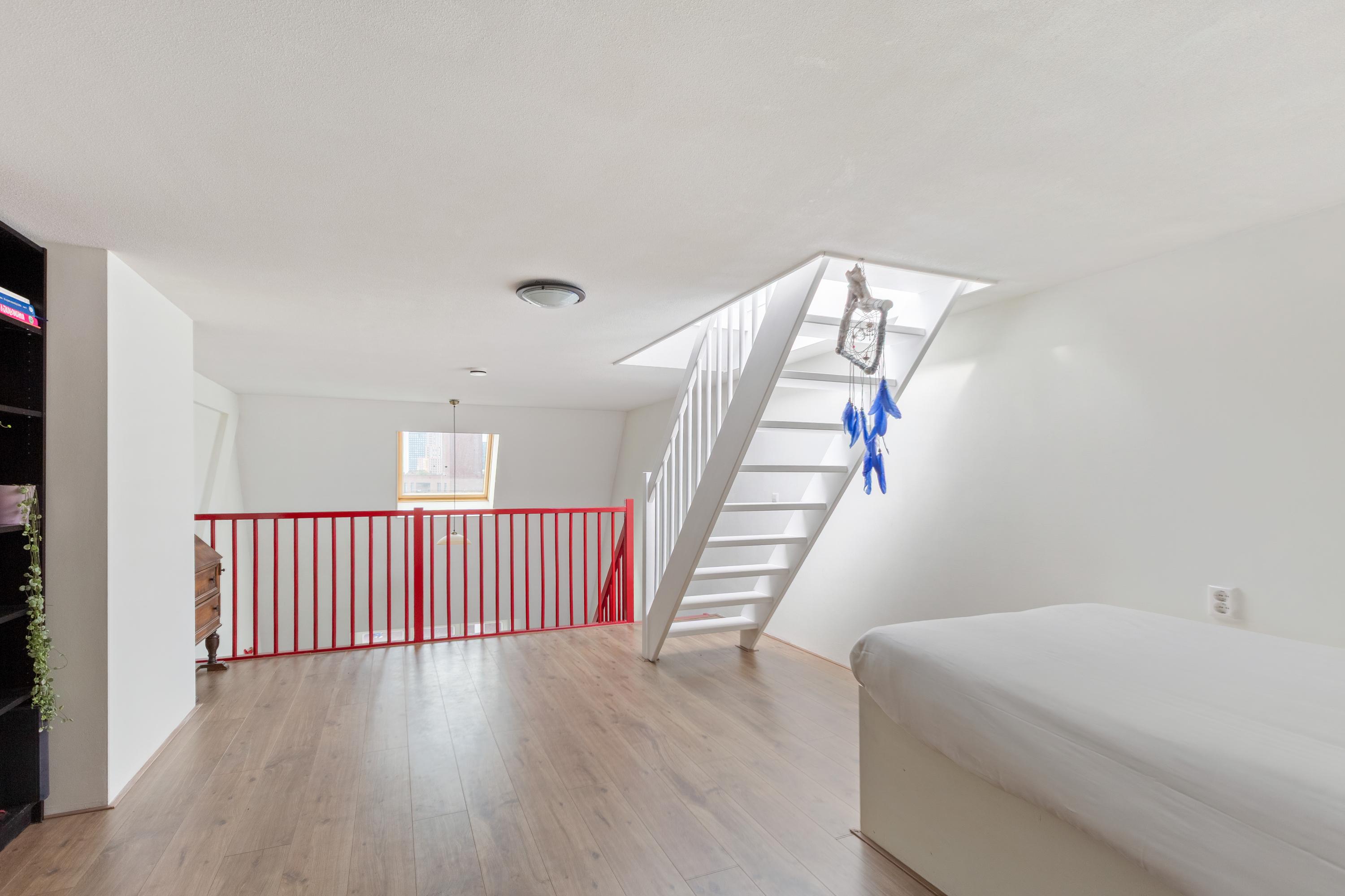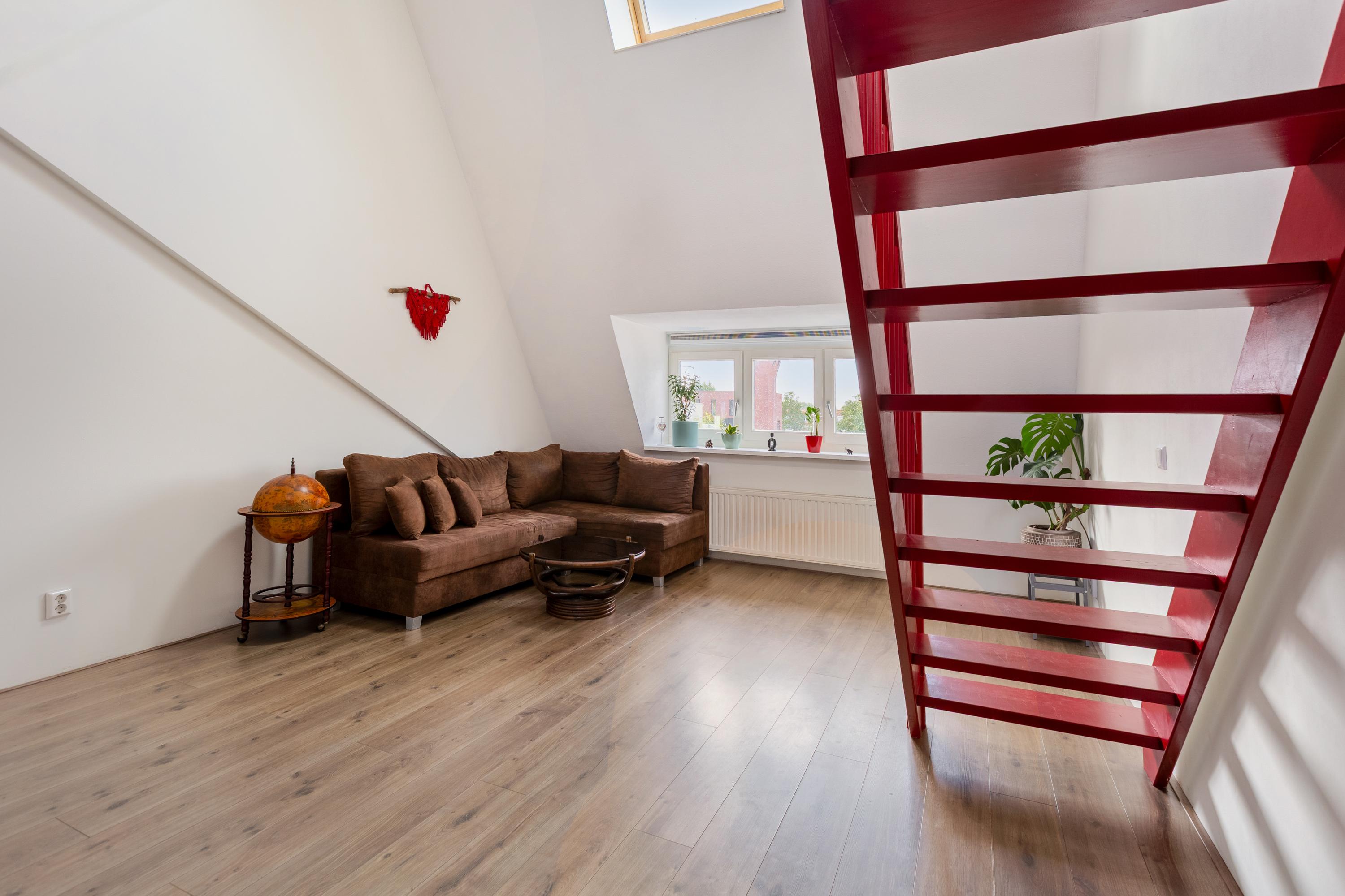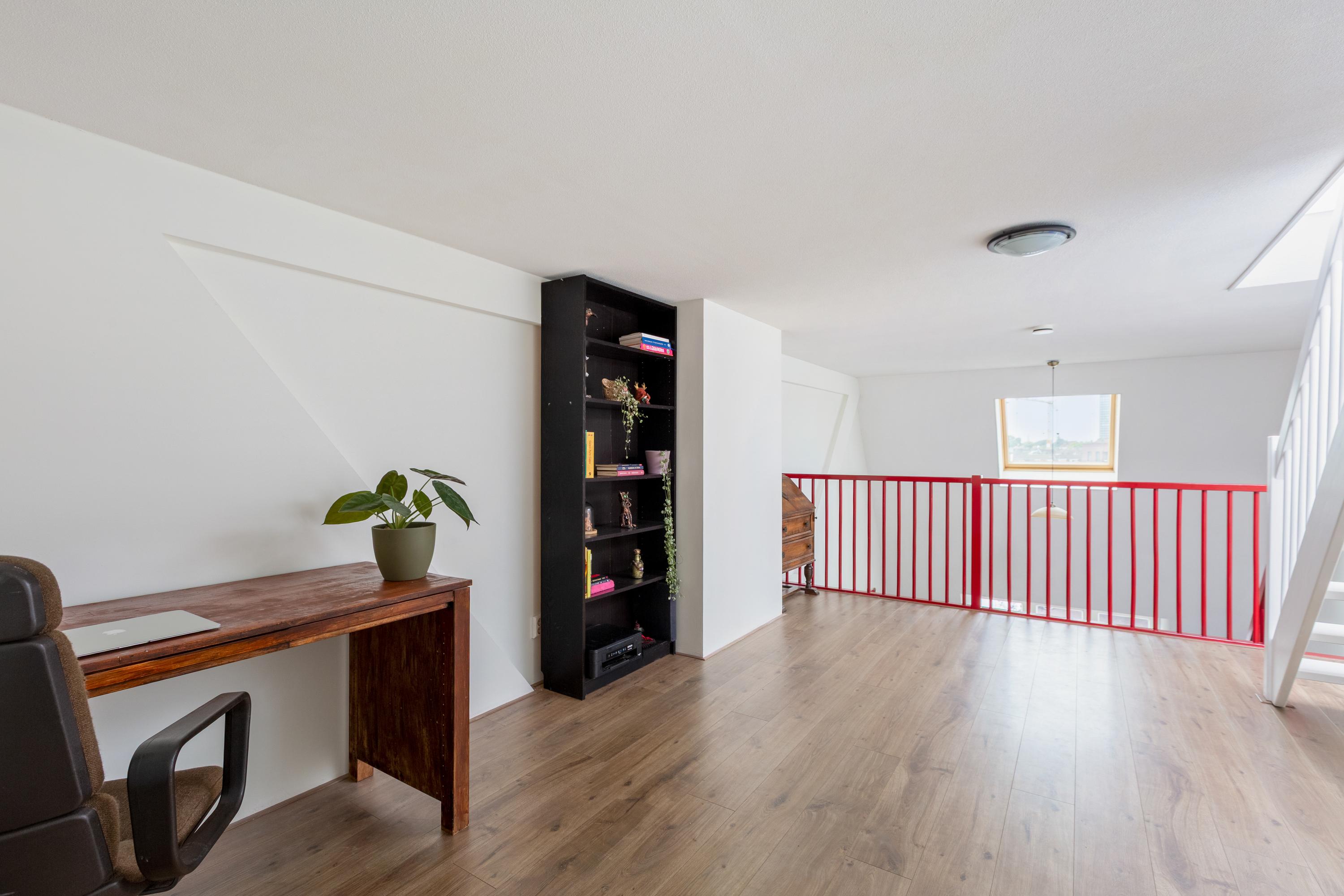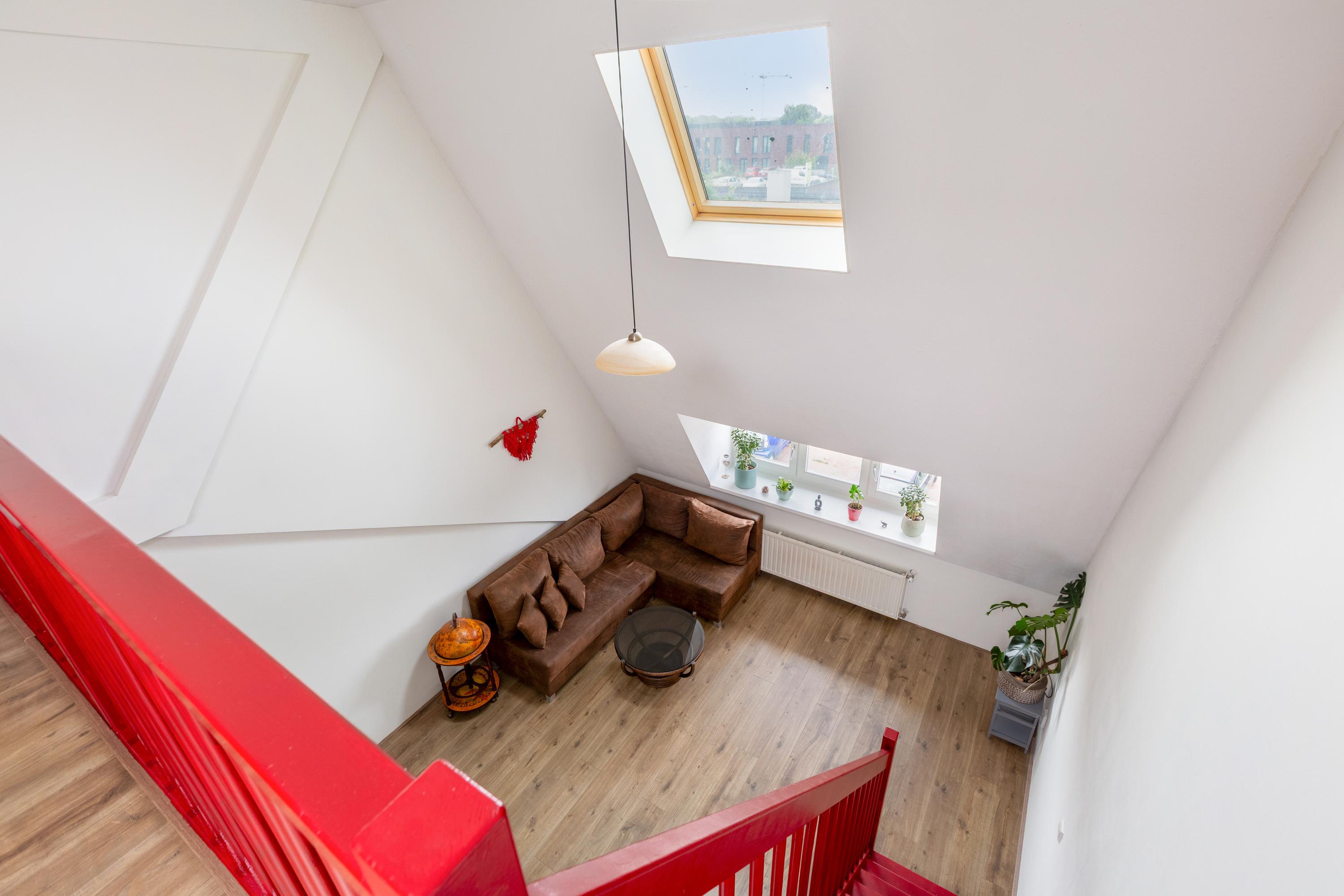 Aan de voorzijde van de woning bevindt zich de lichte woonkamer met open keuken, voorzien van een moderne opstelling met inbouwapparatuur en voldoende werkruimte. Dankzij de grote raampartijen geniet de woonkamer van veel natuurlijke lichtinval. Via de trap in de woonkamer is de derde verdieping/ fide te bereiken, waar de tweede slaapkamer zich bevindt. De slaapkamer kijkt uit over de woonkamer. Vanaf de fide is het dakterras toegankelijk, door middel van een vaste trap. Het ruime dakterras van ca. 20m2 biedt rondom uitzicht over de omgeving van de woning en het Mosplein.