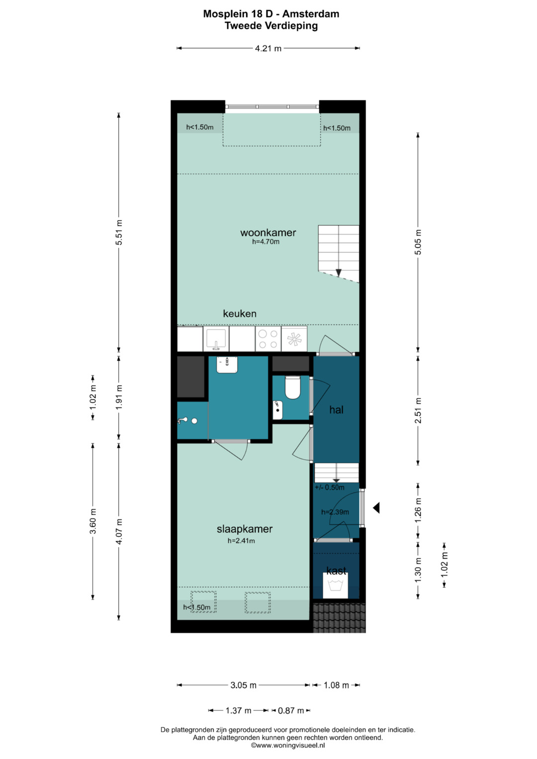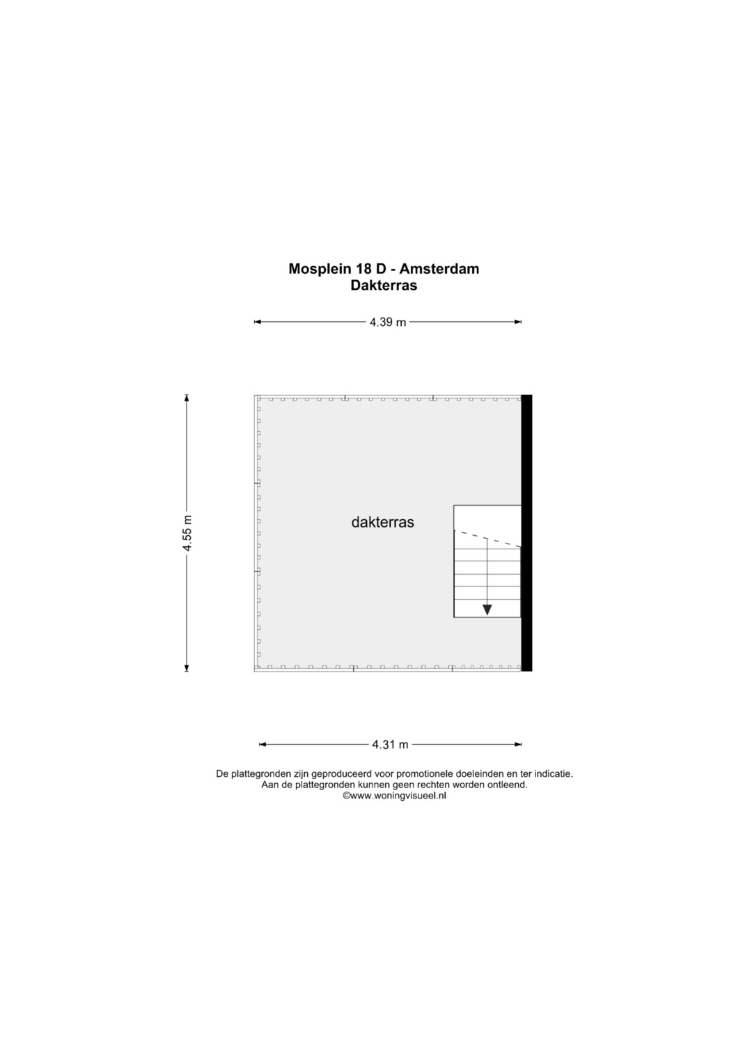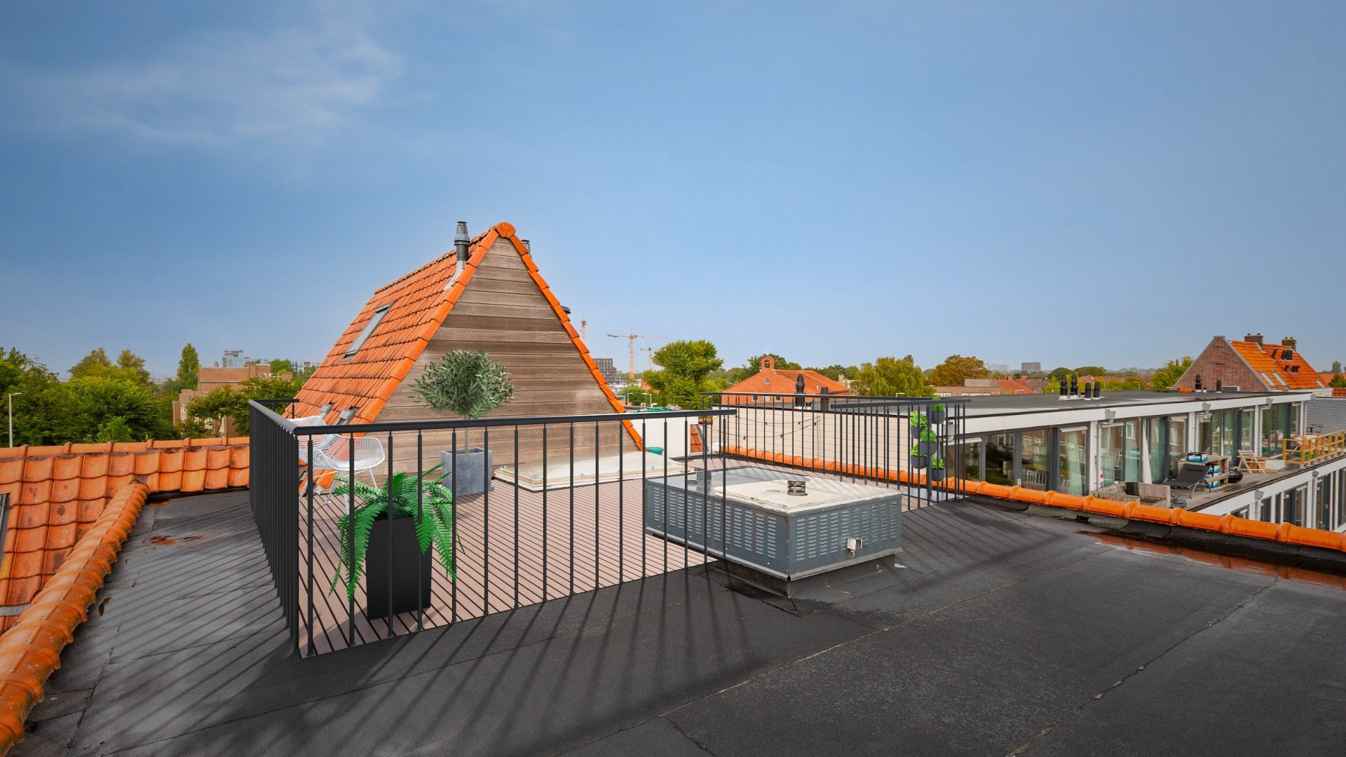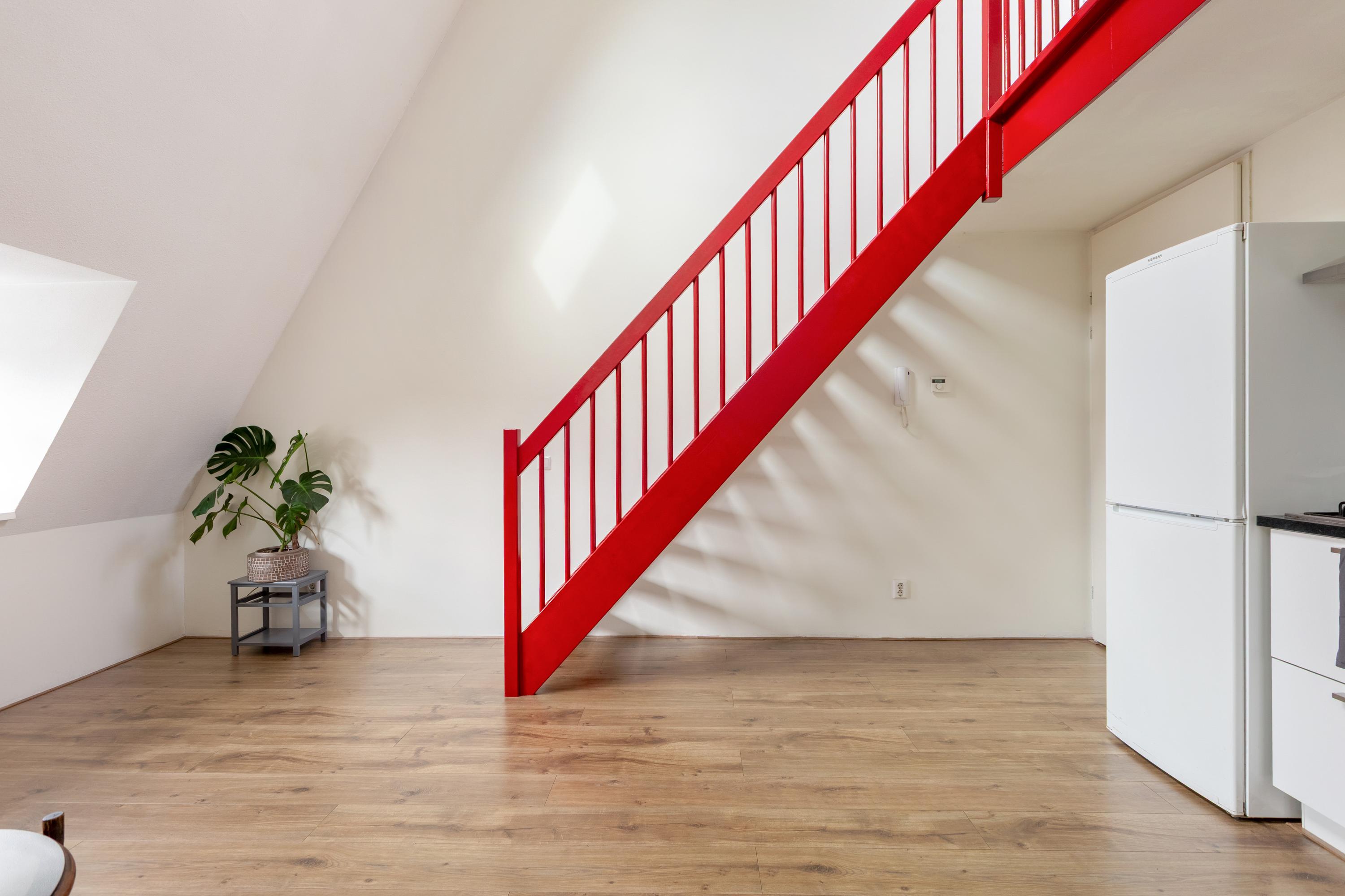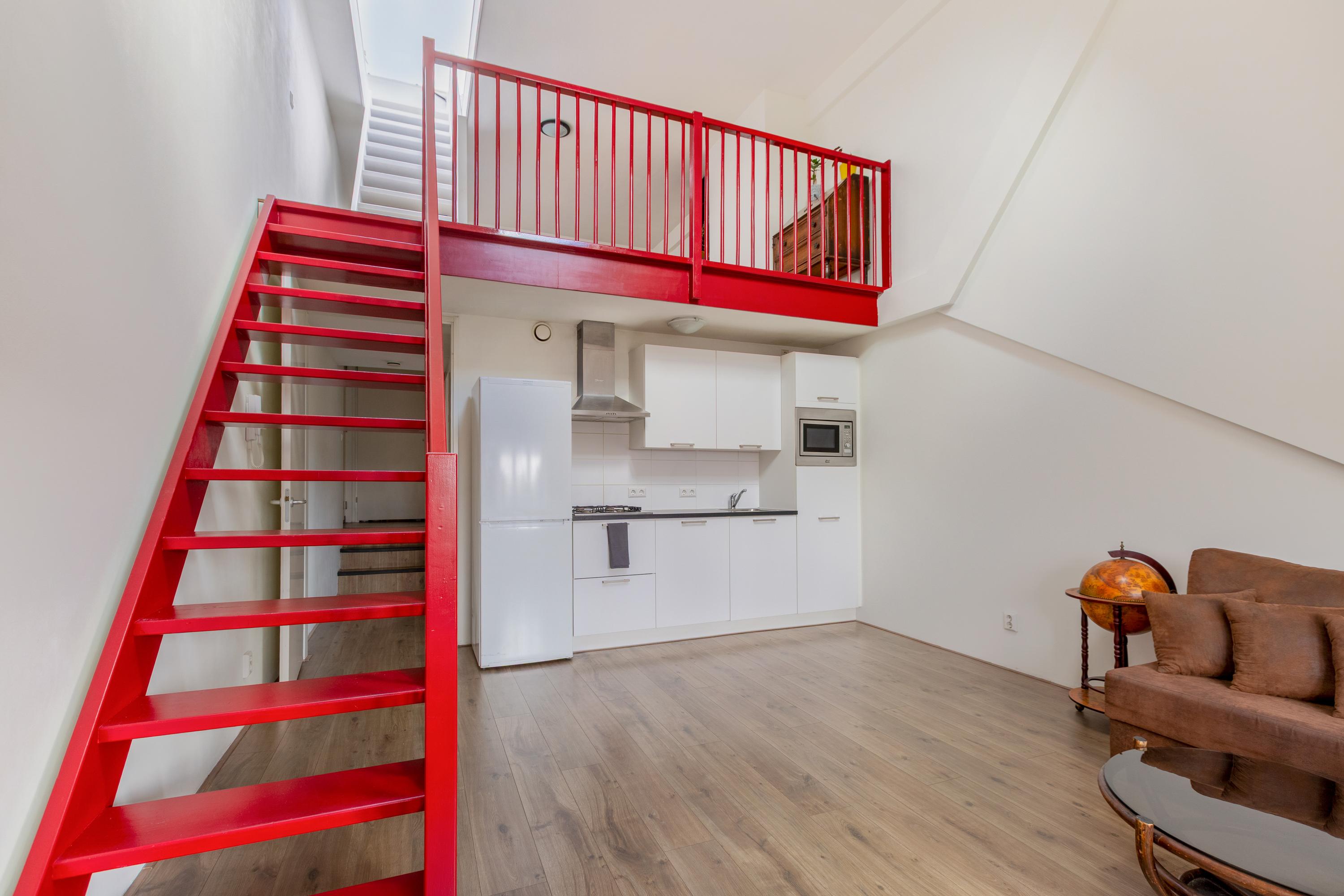 Aan de voorzijde van de woning bevindt zich de lichte woonkamer met open keuken, voorzien van een moderne opstelling met inbouwapparatuur en voldoende werkruimte. Dankzij de grote raampartijen geniet de woonkamer van veel natuurlijke lichtinval. Via de trap in de woonkamer is de derde verdieping/ fide te bereiken, waar de tweede slaapkamer zich bevindt. De slaapkamer kijkt uit over de woonkamer. Vanaf de fide is het dakterras toegankelijk, door middel van een vaste trap. Het ruime dakterras van ca. 20m2 biedt rondom uitzicht over de omgeving van de woning en het Mosplein.